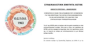 ΣΥΝΔΙΚΑΛΙΣΤΙΚΗ ΕΝΟΤΗΤΑ ΟΣΤΟΕ. ΑΝΟΙΧΤΗ ΕΠΙΣΤΟΛΗ – ΑΝΑΚΟΙΝΩΣΗ : ΣΥΜΠΑΡΑΤΑΞΗ ΟΛΩΝ ΤΩΝ ΔΥΝΑΜΕΩΝ ΠΟΥ ΑΓΩΝΙΖΟΝΤΑΙ ΓΙΑ ΤΗΝ ΕΠΙΣΤΡΟΦΗ ΤΗΣ ΟΣΤΟΕ ΣΤΗΝ ΚΑΝΟΝΙΚΟΤΗΤΑ ΓΙΑ ΝΑ ΑΝΤΑΠΟΚΡΙΘΕΙ ΣΤΙΣ ΑΝΑΓΚΕΣ ΤΩΝ ΣΥΝΤΑΞΙΟΥΧΩΝ ΤΡΑΠΕΖΟΫΠΑΛΛΗΛΩΝ