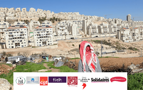 Έκθεση οργανώσεων στη Γαλλία (FIDH, CGT κ.ά.) αποκαλύπτει χρηματοδότηση των ισραηλινών εποικισμών με 288 εκατ. ευρώ από μια κοινοπραξία Τραπεζών (BNP Paribas, Société Générale, Crédit Agricole και η θυγατρική της Crédit Lyonnais κ.ά.) προς την Israel Electric Corporation (IEC), εταιρεία η οποία προμηθεύει με ρεύμα τα εδάφη των παράνομων εποικισμών.