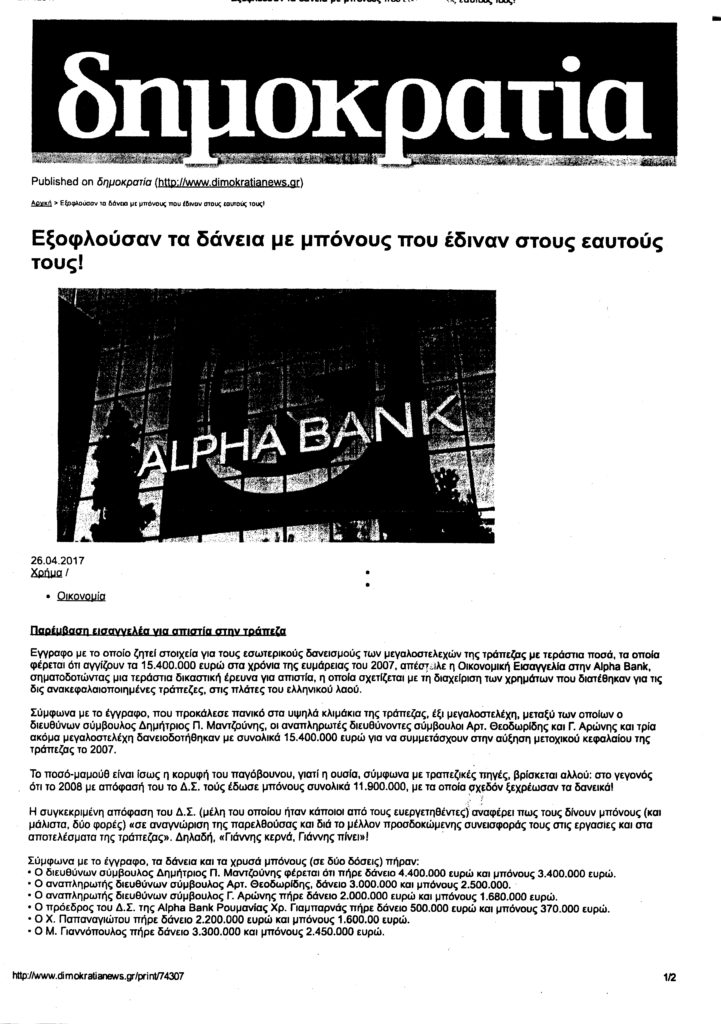 Στα πλαίσια της επικοινωνίας που αναπτύχθηκε με το γραφείο του κου Ντράγκι, αποστείλαμε χθες, Τρίτη 20/6, την κάτωθι επιστολή, επισημαίνοντας επιπλέον το από 26/4/17 δημοσίευμα (“Εξοφλούσαν τα δάνεια με bonus που έδιναν στους εαυτούς τους”) της ηλεκτρονικής έκδοσης της εφημερίδας “Δημοκρατία” με αποκαλύψεις για τα υπέρογκα bonus που έλαβαν μεγαλοστελέχη της Alpha Bank για την εξόφληση των προσωπικών (!) τους δανείων και που σηματοδοτούν εισαγγελική έρευνα για απιστία, σχετικά με τον τρόπο διαχείρισης των χρημάτων που έλαβαν οι τράπεζες με τις ανακεφαλαιοποιήσεις στις πλάτες του ελληνικού λαού.