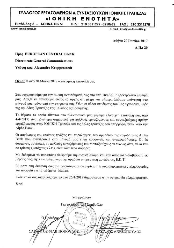 Σας έχουμε ήδη ενημερώσει με το από 16/6/17 δημοσίευμά μας (“Μήνυμα Ελήφθη”) για την απάντηση του γραφείου του Προέδρου της Ευρωπαϊκής Κεντρικής Τράπεζας κου Μάριο Ντράγκι στην από 4/4/2017 Ανοιχτή Επιστολή της ΙΟΝΙΚΗΣ ΕΝΟΤΗΤΑΣ που του κοινοποιήσαμε στα πλαίσια των αγωνιστικών μας κινητοποιήσεων για την αδιάλλακτη στάση της Alpha Bank.