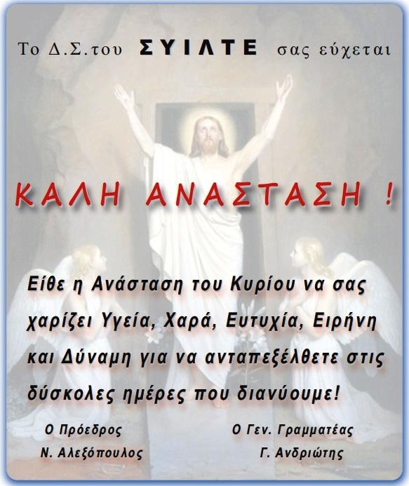 Ειδήσεις ΣΥΙΛΤΕ, ΣΥΙΛΤΕΤο Δ.Σ. του ΣΥΙΛΤΕ σας εύχεται ΚΑΛΗ ΑΝΑΣΤΑΣΗ ! Σαράντος Φιλιππόπουλος5 Απριλίου, 2018 11:44 Το Δ.Σ. της ΙΟΝΙΚΗΣ ΕΝΟΤΗΤΑΣ σας εύχεται ΚΑΛΗ ΑΝΑΣΤΑΣΗ & ΚΑΛΟ ΠΑΣΧΑ ! Τα έθιμα του Πάσχα στις γωνιές της Ελλάδας