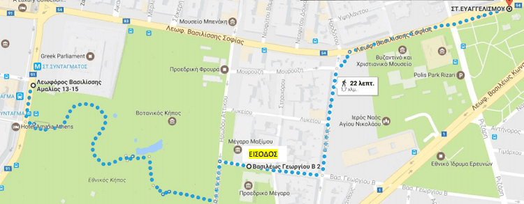 Από τον ΣΤΑΘΜΟ ΜΕΤΡΟ «ΣΥΝΤΑΓΜΑ» Έξοδος Λεωφ. Αμαλίας, με τα πόδια 900 μ. μέσω Εθνικού Κήπου.