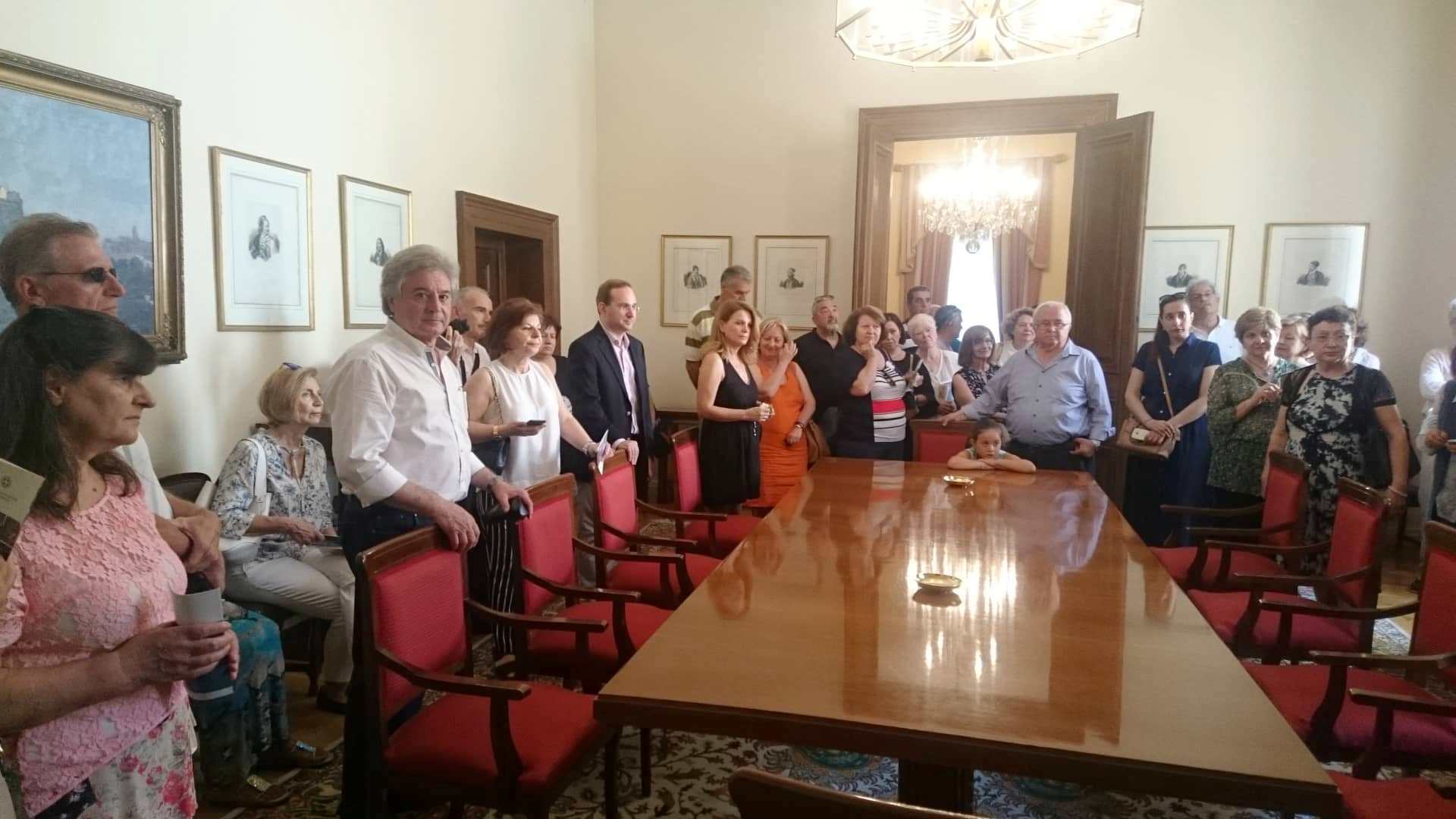 Κατά τη διάρκεια της επίσκεψής μας ξεναγηθήκαμε σε επιλεγμένους χώρους του κτιρίου συνοδεία της υπεύθυνης του Μεγάρου. Η ξενάγησή μας περιλάμβανε την ιστορία του κτιρίου και την περιήγησή μας στις πιο σημαντικές αίθουσές του, όπως η αίθουσα των συσκέψεων των πολιτικών αρχηγών, το βυζαντινό σαλόνι, η αίθουσα διαπιστευτηρίων, η αίθουσα δεξιώσεων κ.ά.