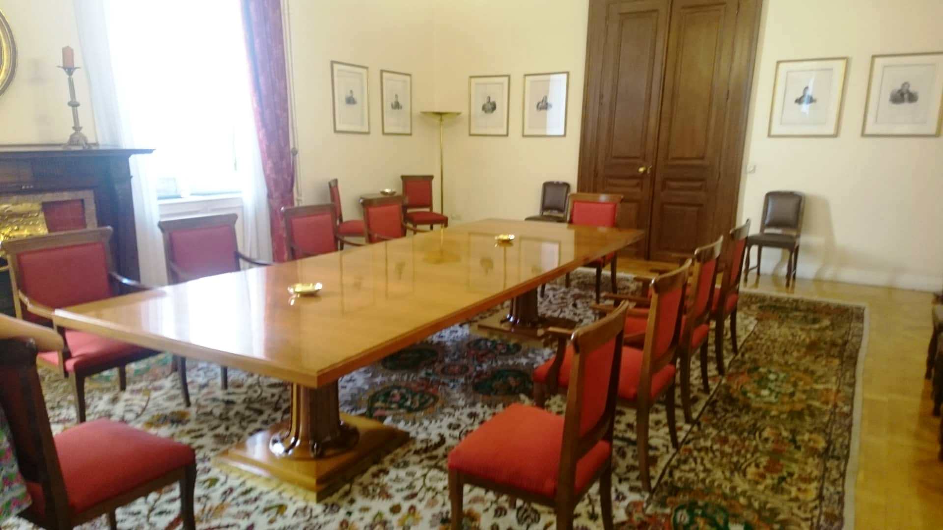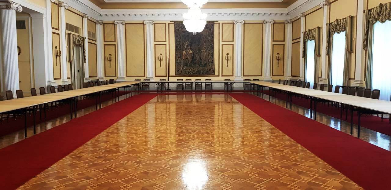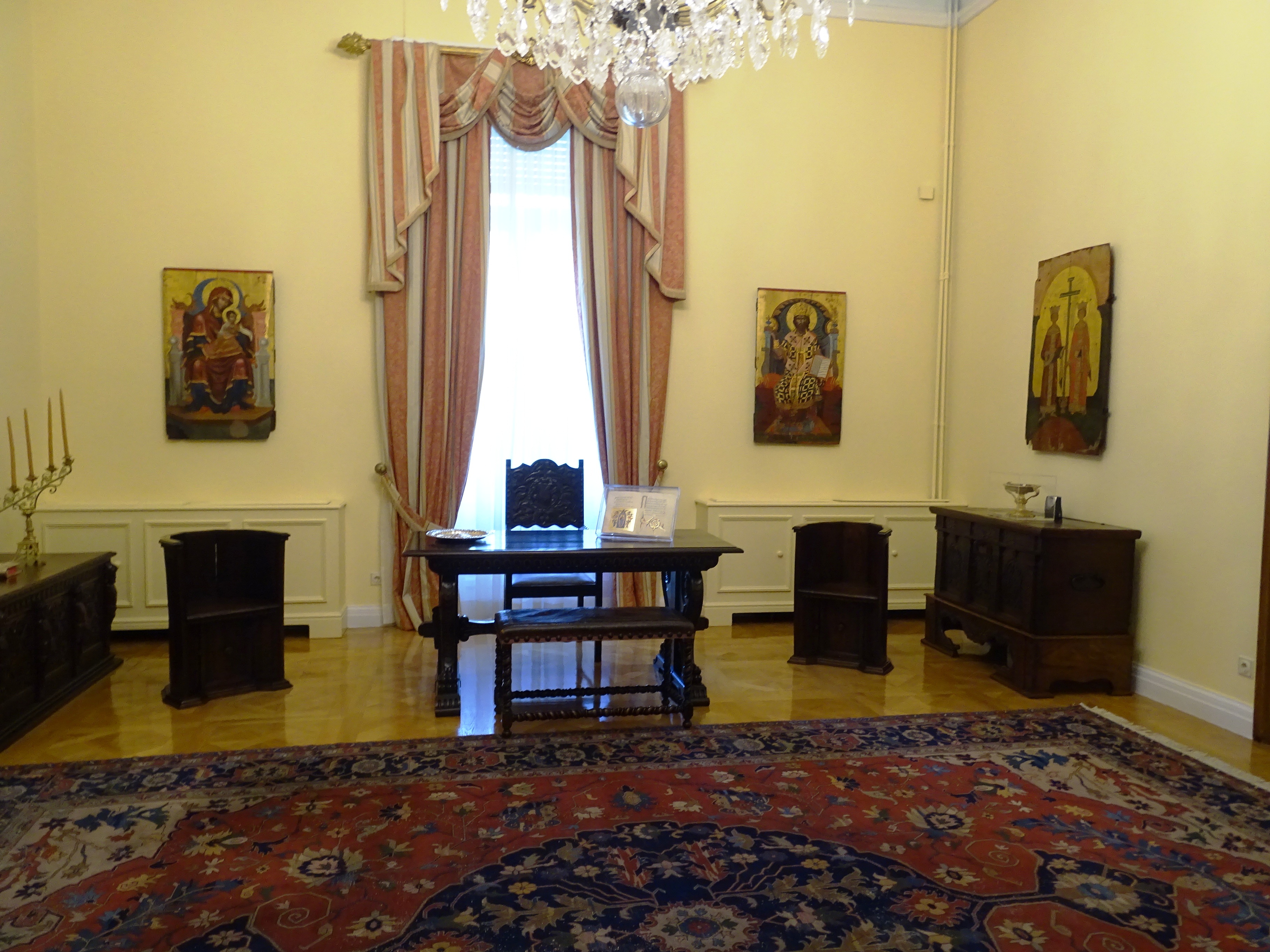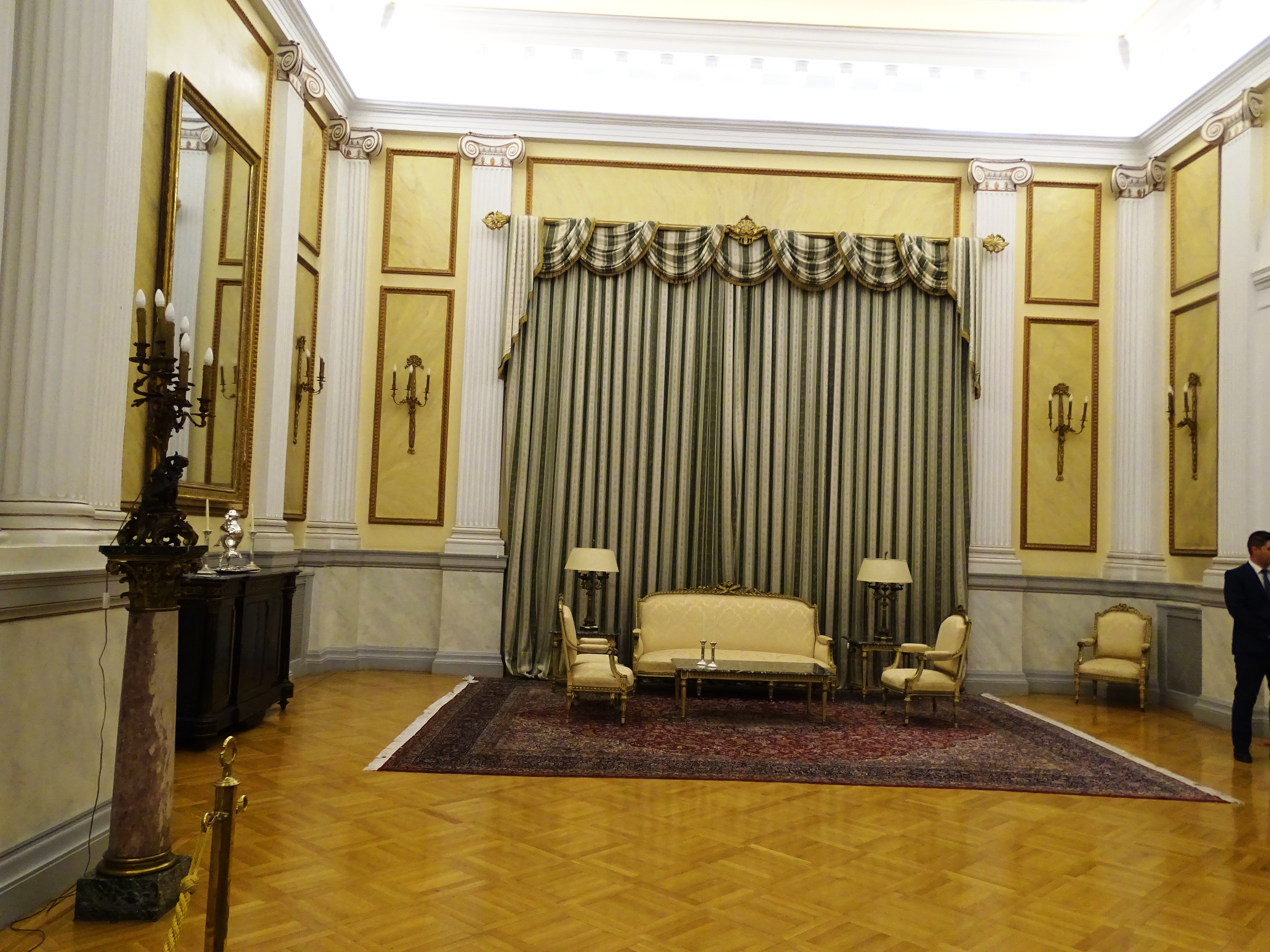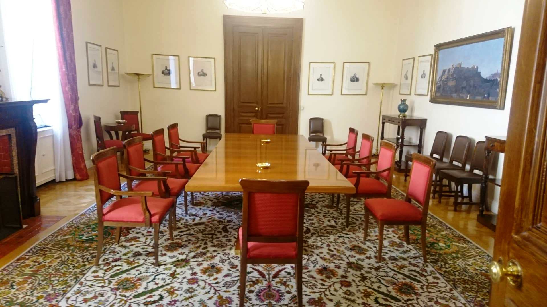 Πέραν των εντυπωσιακών πολυελαίων και χαλιών που παραμένουν τα ίδια από την περίοδο που χρησιμοποιείτο ως Παλάτι για τη βασιλική οικογένεια, δεν μπορούμε παρά να σταθούμε στις αυθεντικές γκραβούρες των ηρωικών μορφών της Επανάστασης του 1821 που κοσμούν την αίθουσα των συνεδριάσεων των πολιτικών αρχηγών. Οι πρωτότυπες αυτές γκραβούρες με κάρβουνο, σχεδιάστηκαν από τον φιλέλληνα Γερμανό αξιωματικό και ερασιτέχνη καλλιτέχνη Karl Krazeisen (που πολέμησε στον Εθνικοαπελευθερωτικό μας Αγώνα) και φέρουν τη γνήσια υπογραφή των ηρώων της Επανάστασής μας, γεγονός που μας προκάλεσε ιδιαίτερη συγκίνηση. Κατά κύριο λόγο χάρη σε αυτές τις γκραβούρες και τις λιθογραφίες που κυκλοφόρησαν ευρέως αργότερα, έχουμε εικόνα όλων των μεγάλων μορφών της Επανάστασης.