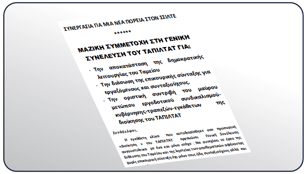 – Την οριστική συντριβή του μαύρου μετώπου εργοδοτικού συνδικαλισμού-κυβέρνησης-τραπεζών-εγκάθετων της διοίκησης του ΤΑΠΙΛΤΑΤ