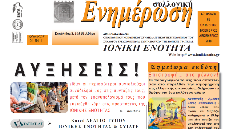 Ειδήσεις, ΕνημέρωσηΔιαβάστε το νέο τεύχος της εφημερίδας του Συλλόγου μας ! Σαράντος Φιλιππόπουλος15 Φεβρουαρίου, 2019 10:3015 Φεβρουαρίου, 2019 10:32 . Συνάδελφοι, κυκλοφόρησε το νέο τεύχος της εφημερίδας μας “Συλλογική Ενημέρωση” Φύλλο 68 . . Αντίο Φώτη ! Συλλυπητήρια Μαργαρίτα και Σίσσυ 60 μόνιμες θέσεις στην Τράπεζα της Ελλάδος