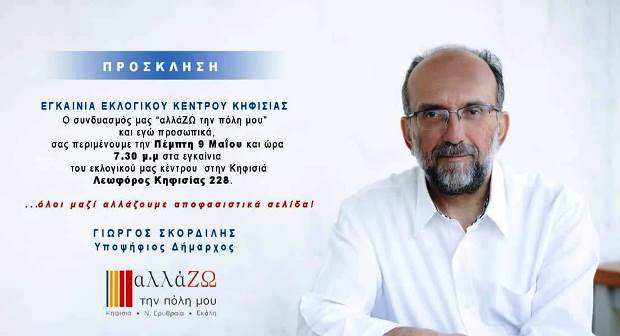 Ο κ. Σκορδίλης εγκαινιάζει το εκλογικό κέντρο Κηφισιάς την Πέμπτη 9/5, ώρα 19:30 μ.μ., στη Λεωφόρο Κηφισίας 228 και περιμένει τους συναδέλφους δημότες της περιοχής να δώσετε το παρών για να τον στηρίξετε στην προσπάθειά του να αλλάξει η πόλη σελίδα για ένα καλύτερο αύριο!