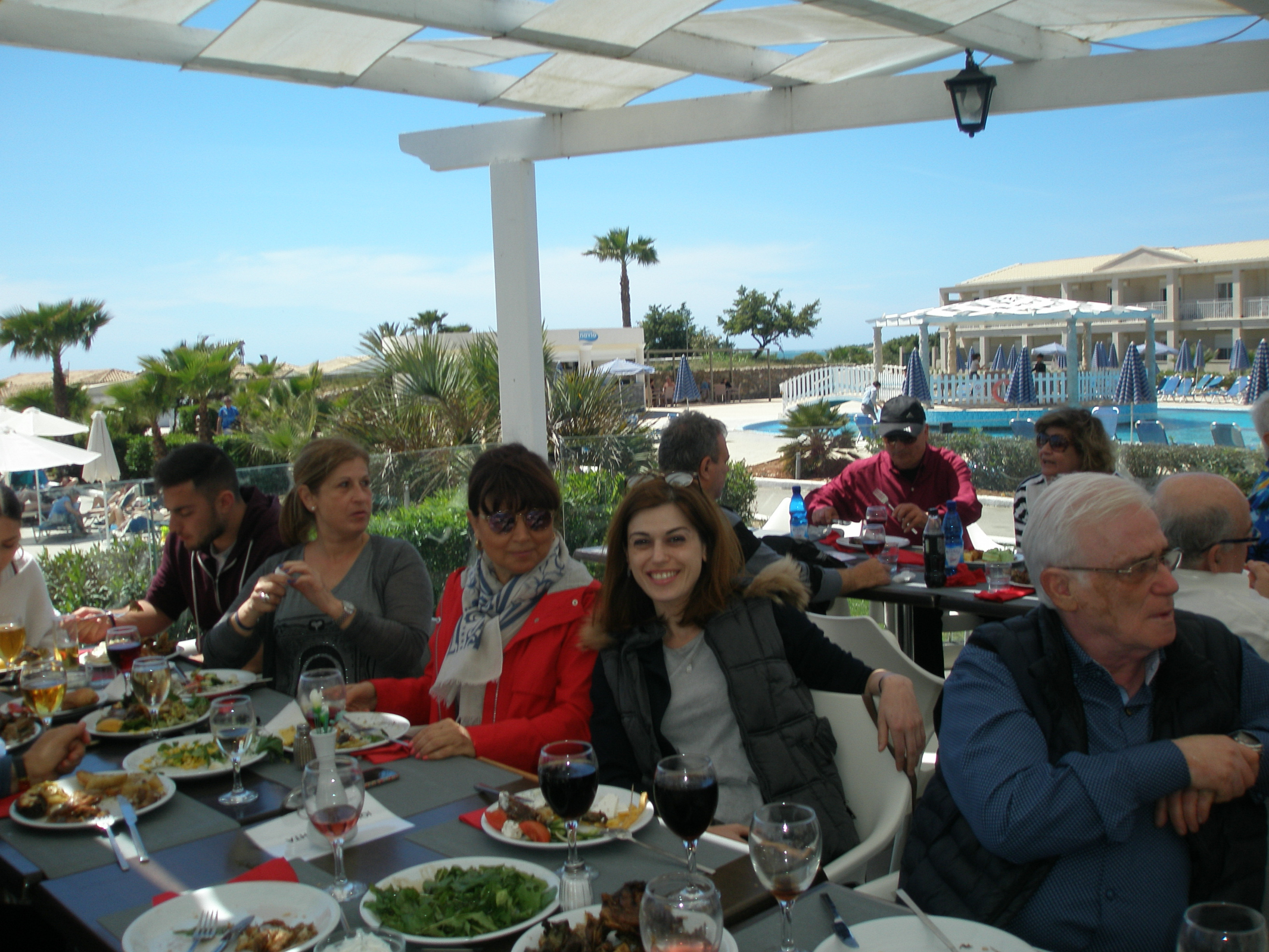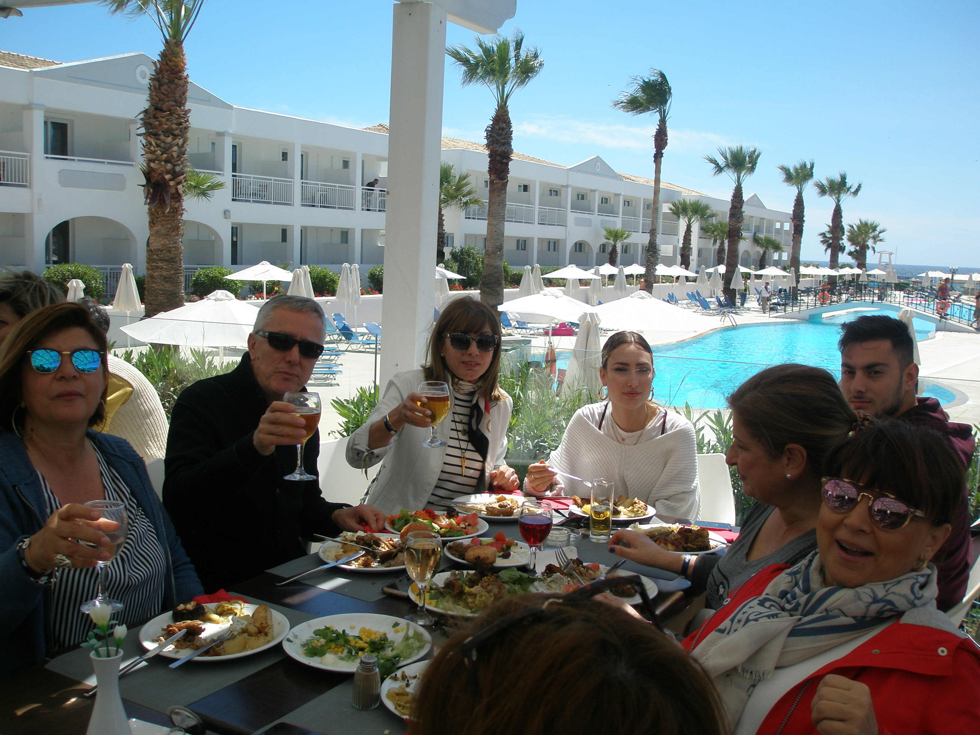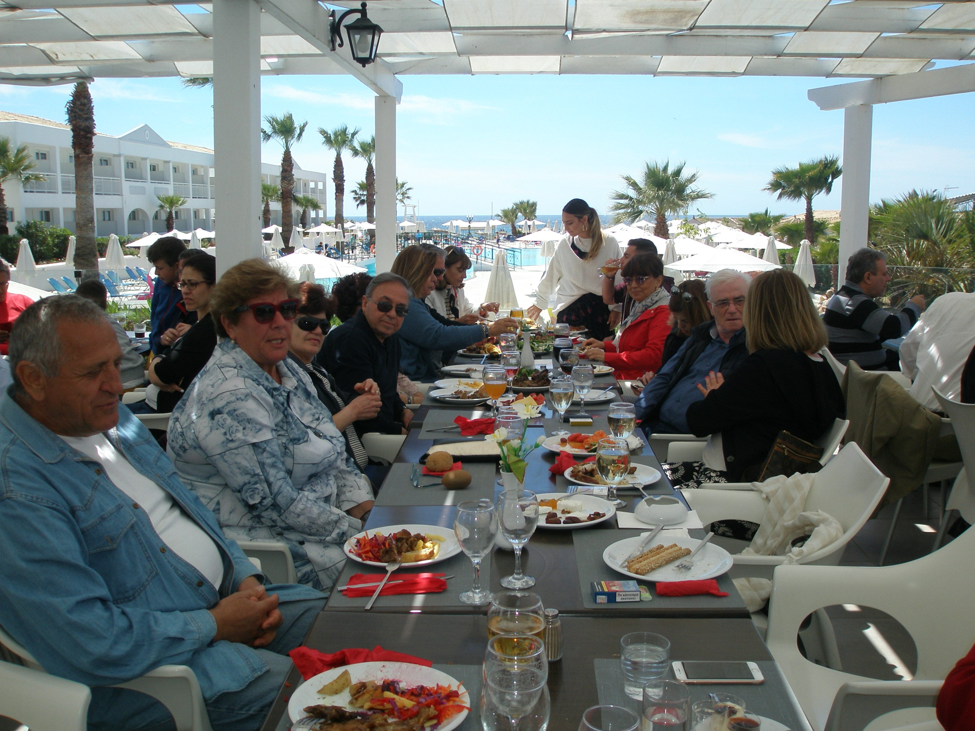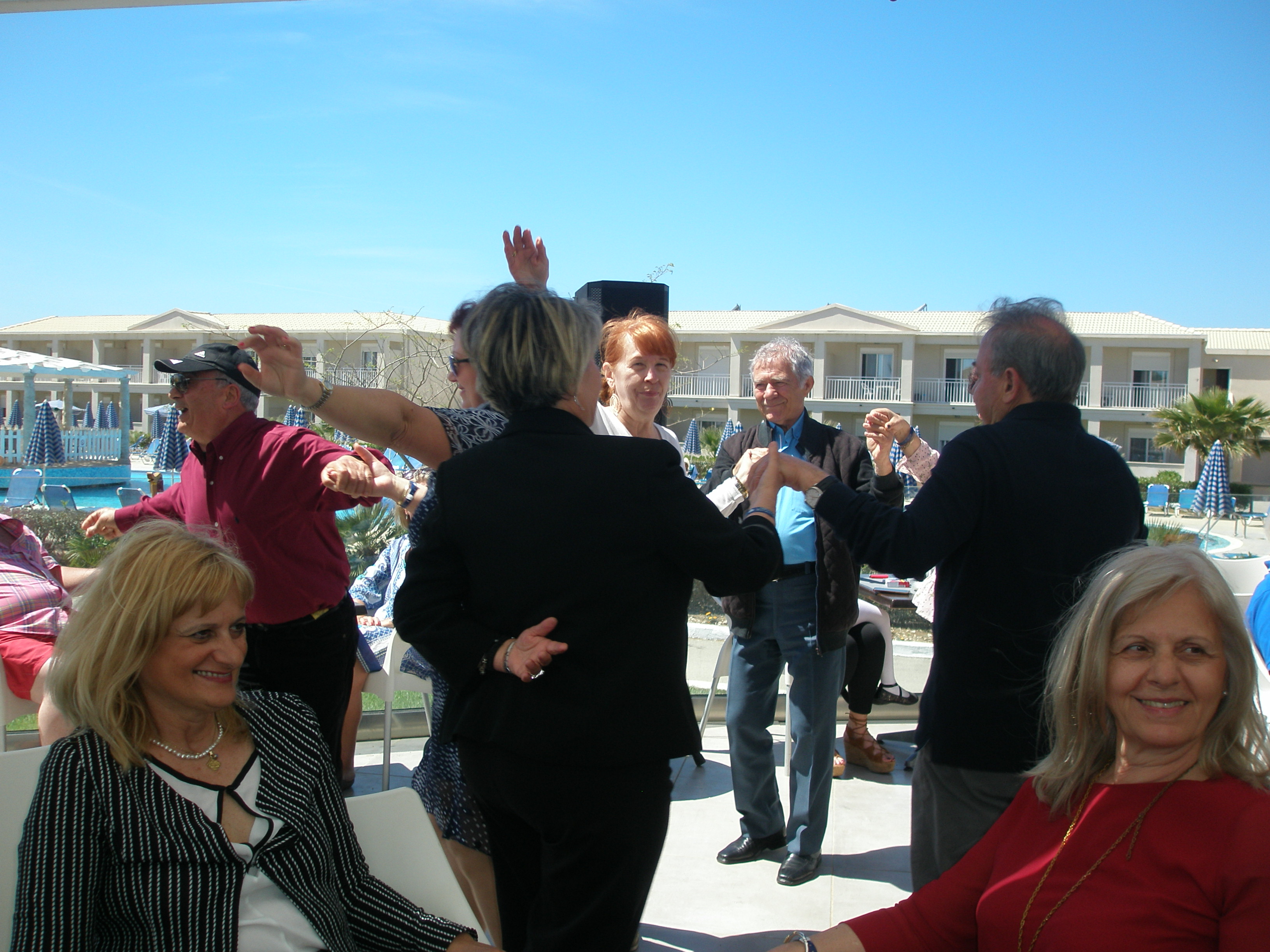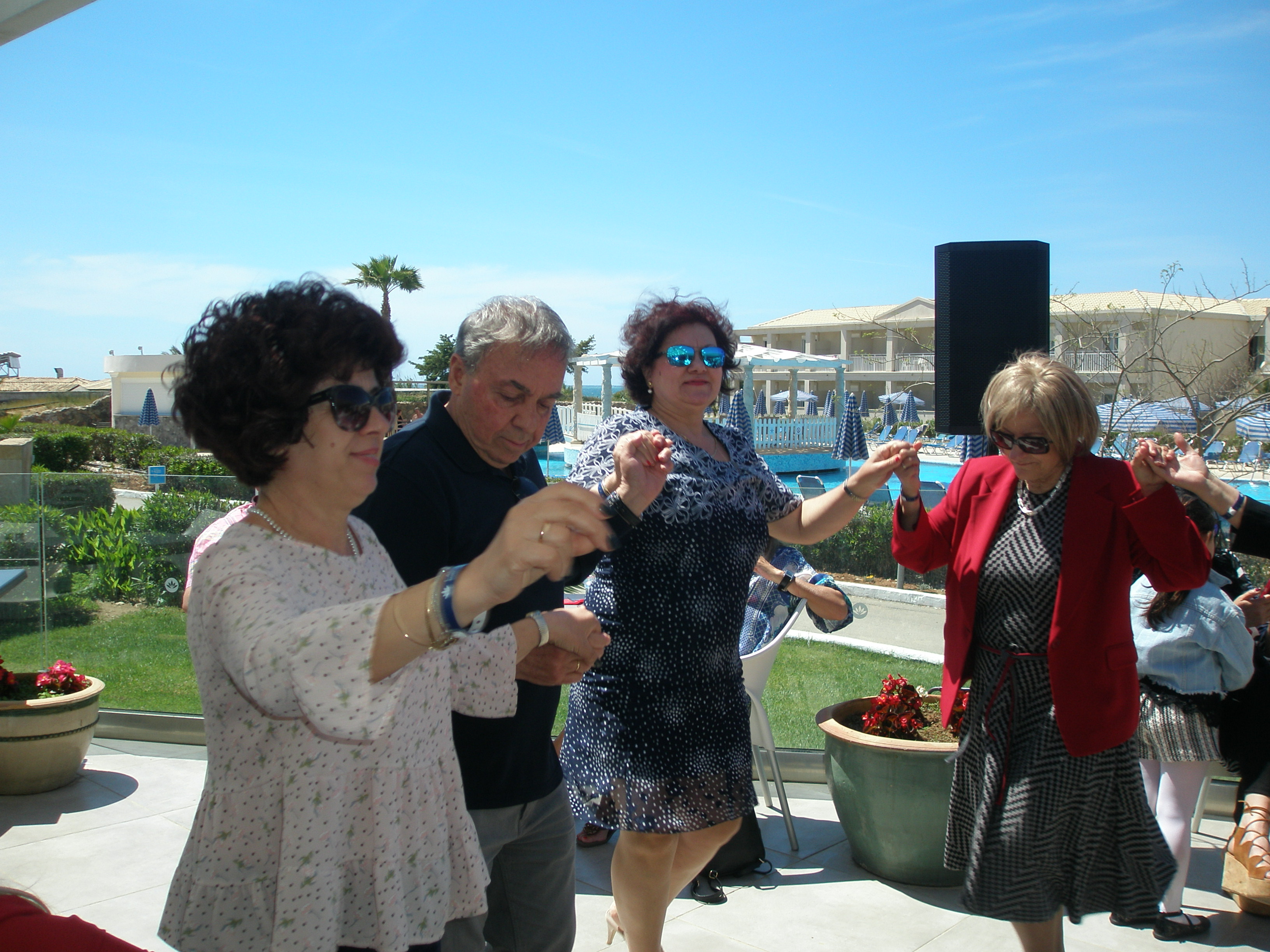 Από το πρωί στο ξενοδοχείο είχε ξεκινήσει το σούβλισμα και το ψήσιμο των αρνιών στο υπαίθριο χώρο, δίπλα στη θάλασσα. Με μεζέδες και ούζο παρακολουθούσαμε τις διαδικασίες, περιμένοντας ανυπόμονα να τελειώσουν και να… καταλήξουν στο στομάχι μας! Νωρίς το μεσημέρι με ψητά κατσίκια, αρνιά, πολλά εδέσματα και ποτά, ξεκίνησε το πασχαλινό μας τσιμπούσι σε τρία μεγάλα τραπέζια για την ΙΟΝΙΚΗ ΕΝΟΤΗΤΑ στη μεγάλη βεράντα του ξενοδοχείου με θέα τη θάλασσα, συνοδεία ζωντανής μουσικής, όπου κερκυραϊκές χορευτικές ομάδες χόρεψαν τους τοπικούς, παραδοσιακούς χορούς και βεβαίως μας έδωσαν το έναυσμα για να τους ακολουθήσουμε σε ένα αξέχαστο γλέντι που κράτησε μέχρι το απόγευμα!