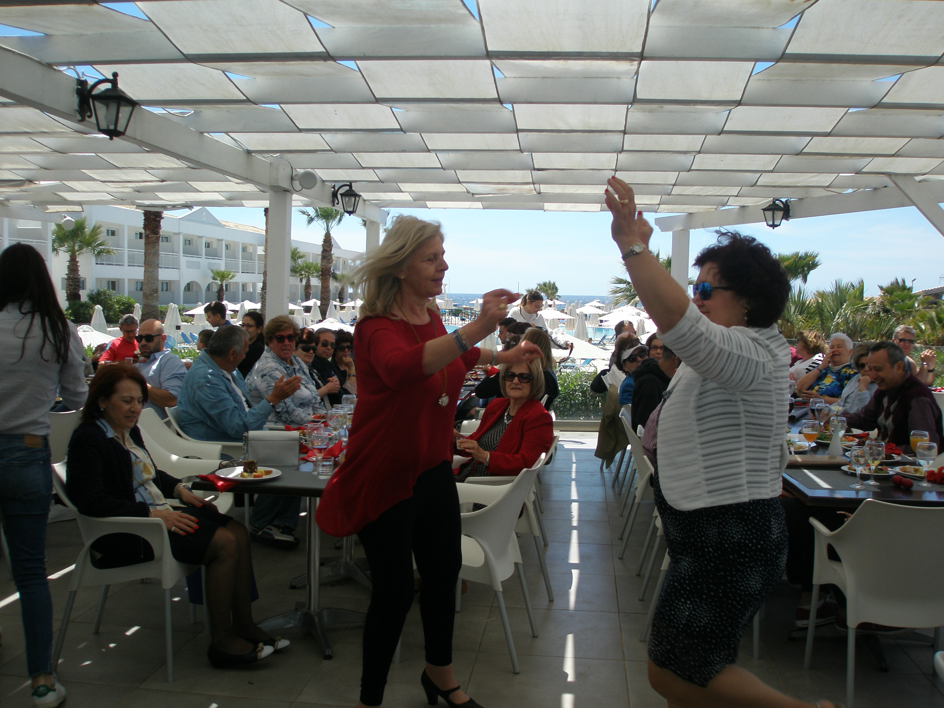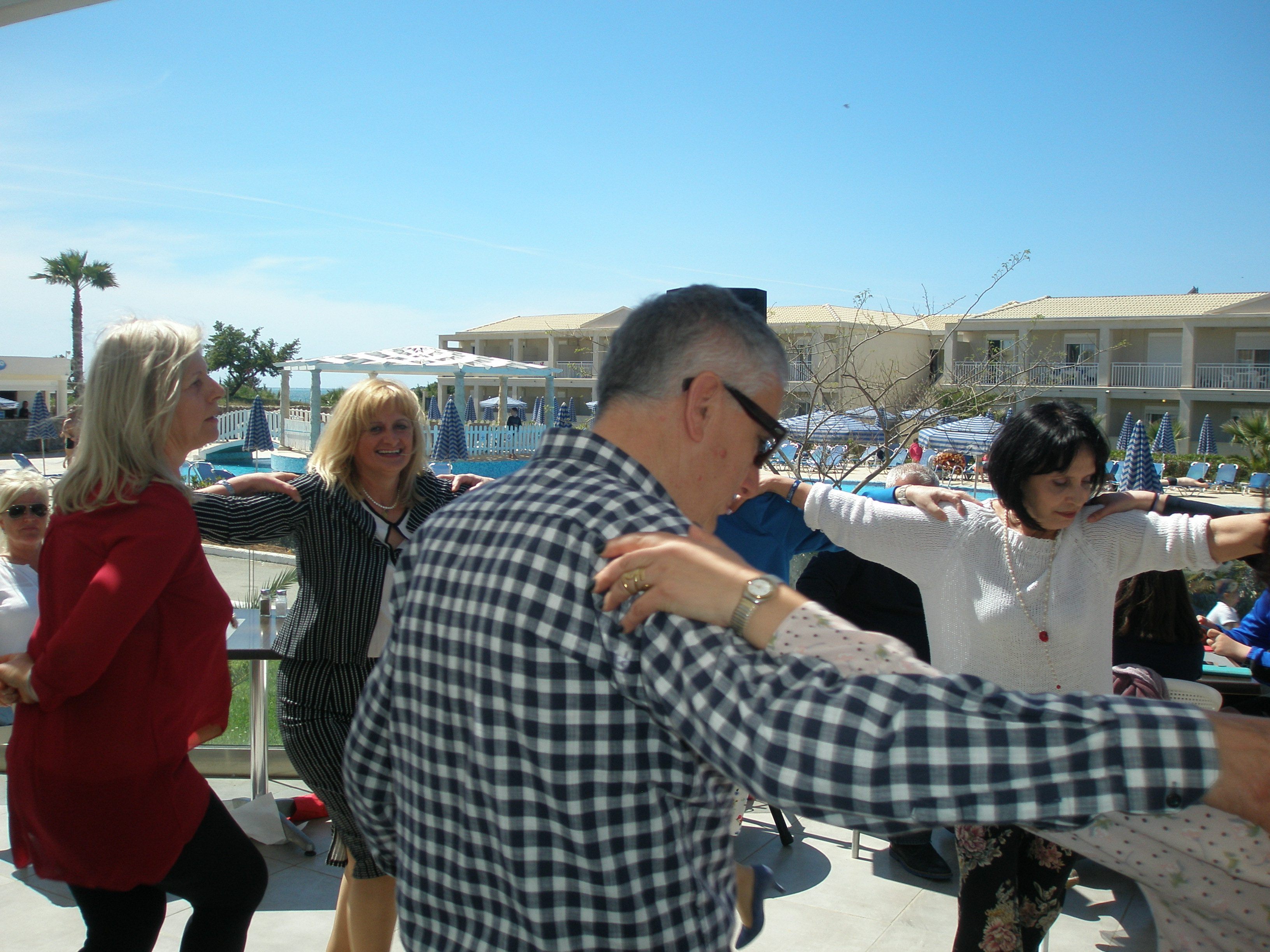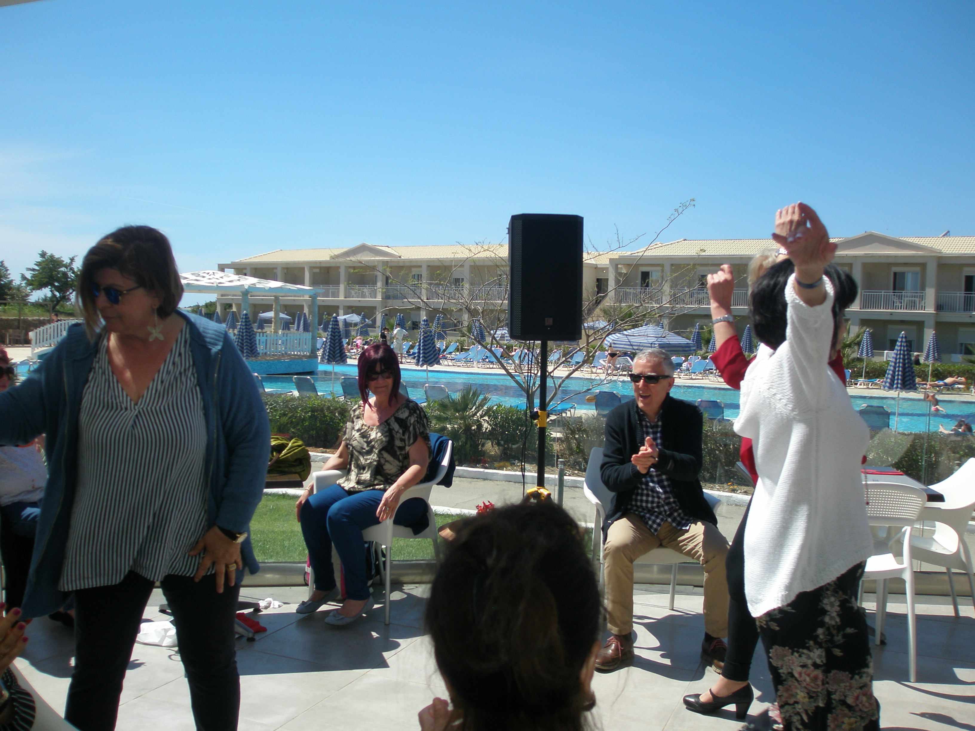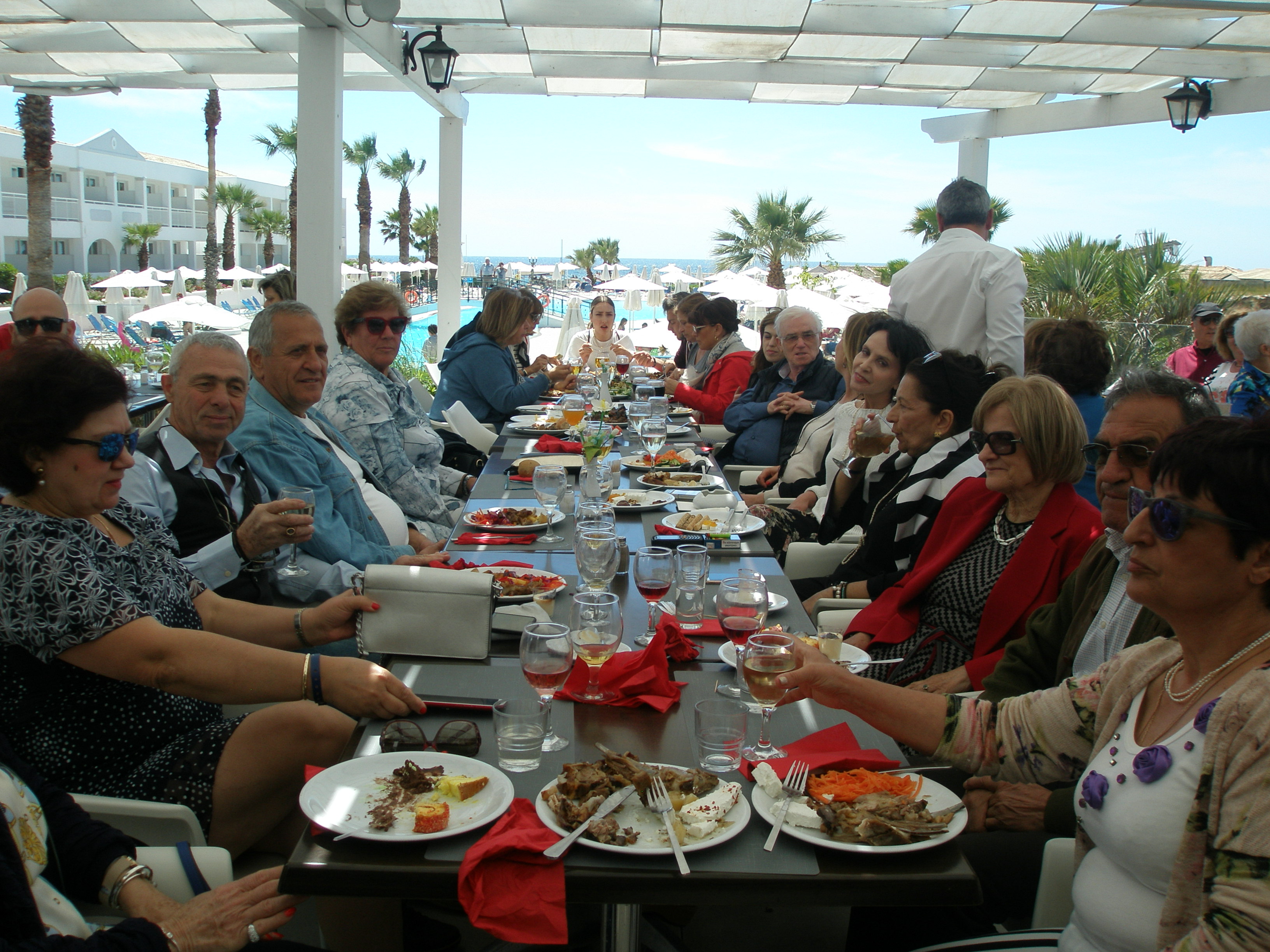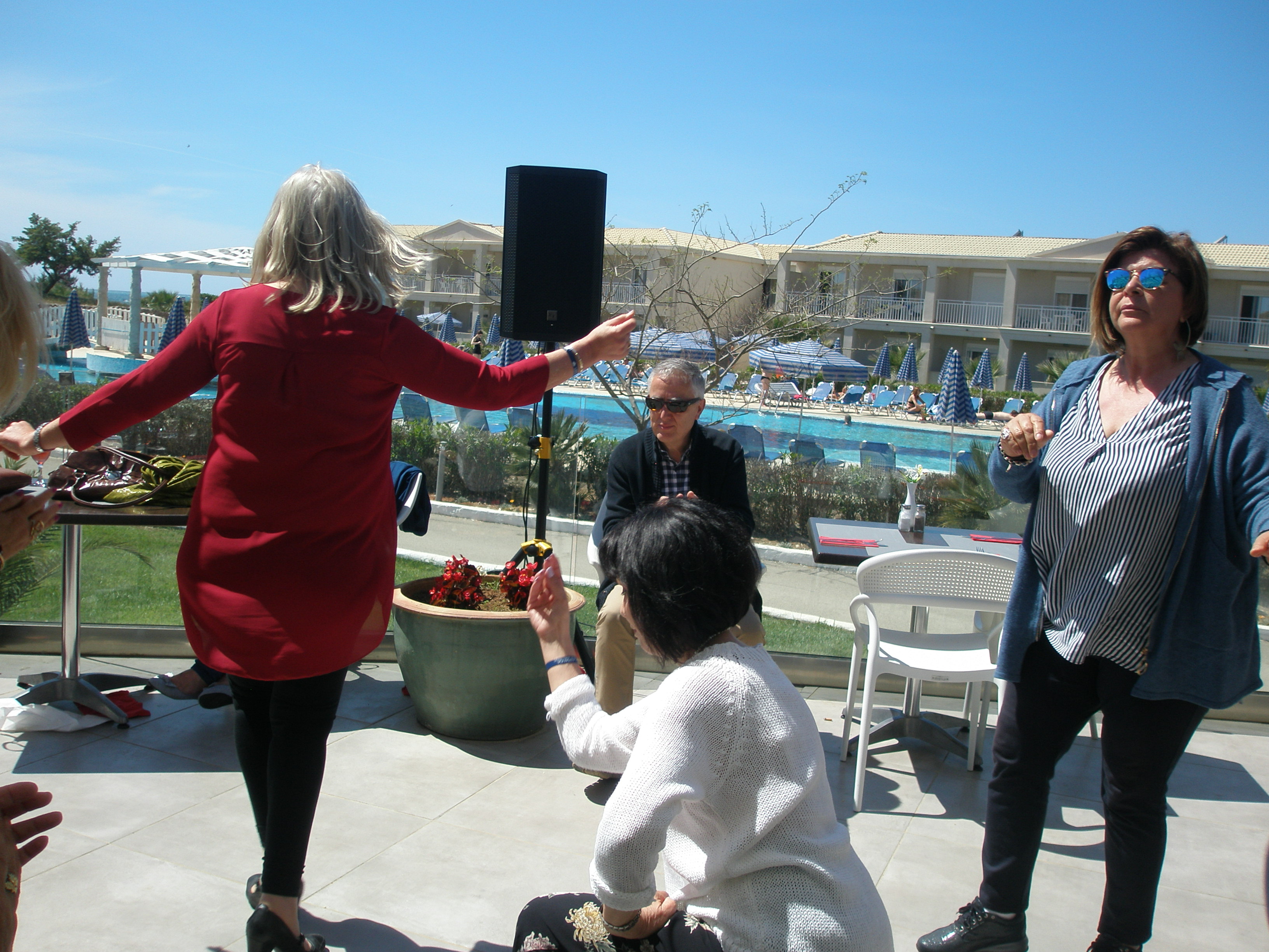 Από το πρωί στο ξενοδοχείο είχε ξεκινήσει το σούβλισμα και το ψήσιμο των αρνιών στο υπαίθριο χώρο, δίπλα στη θάλασσα. Με μεζέδες και ούζο παρακολουθούσαμε τις διαδικασίες, περιμένοντας ανυπόμονα να τελειώσουν και να… καταλήξουν στο στομάχι μας! Νωρίς το μεσημέρι με ψητά κατσίκια, αρνιά, πολλά εδέσματα και ποτά, ξεκίνησε το πασχαλινό μας τσιμπούσι σε τρία μεγάλα τραπέζια για την ΙΟΝΙΚΗ ΕΝΟΤΗΤΑ στη μεγάλη βεράντα του ξενοδοχείου με θέα τη θάλασσα, συνοδεία ζωντανής μουσικής, όπου κερκυραϊκές χορευτικές ομάδες χόρεψαν τους τοπικούς, παραδοσιακούς χορούς και βεβαίως μας έδωσαν το έναυσμα για να τους ακολουθήσουμε σε ένα αξέχαστο γλέντι που κράτησε μέχρι το απόγευμα!