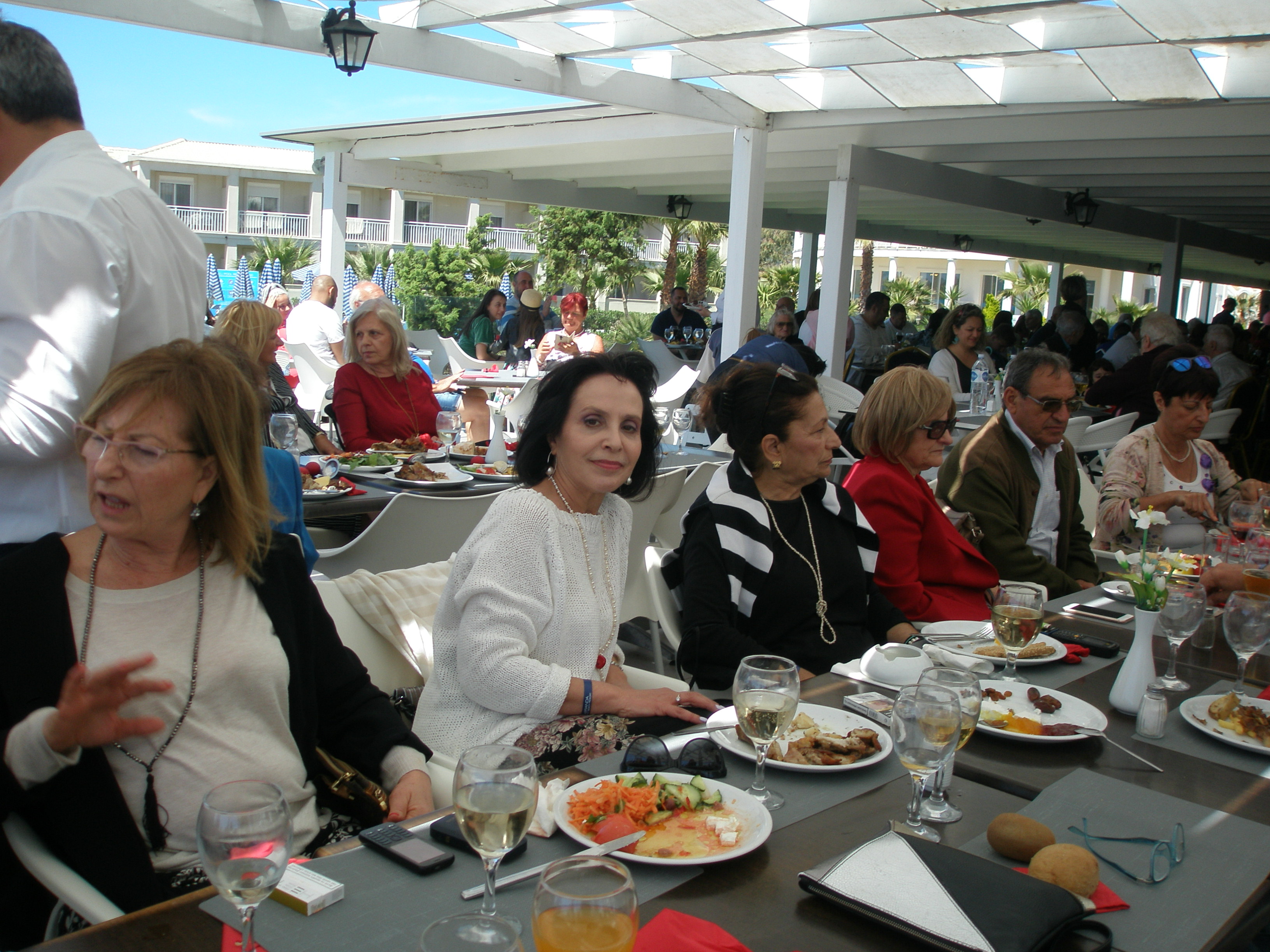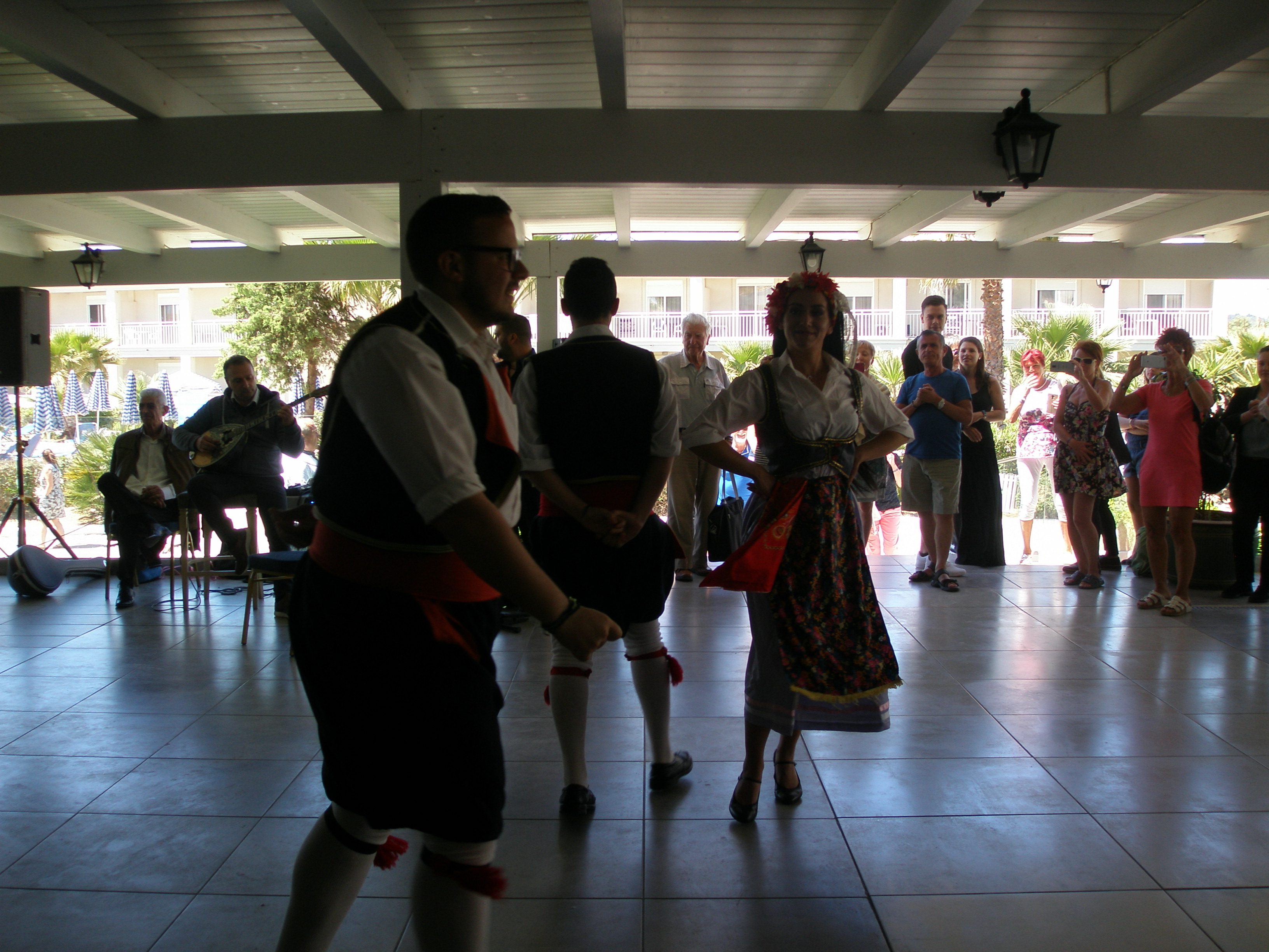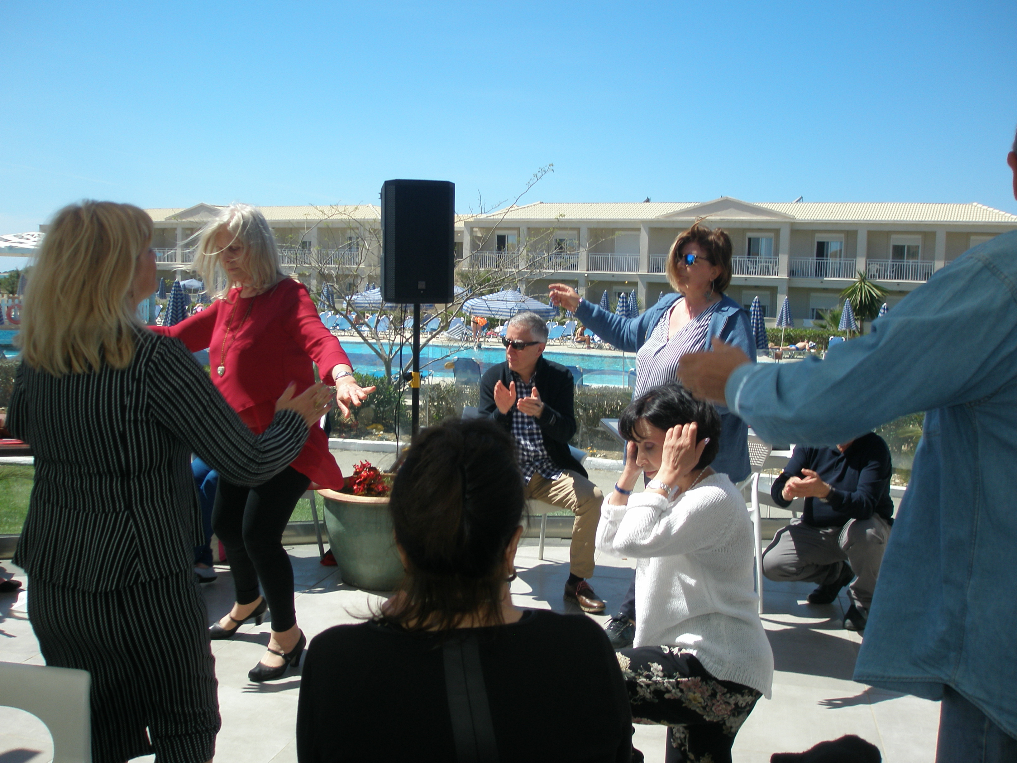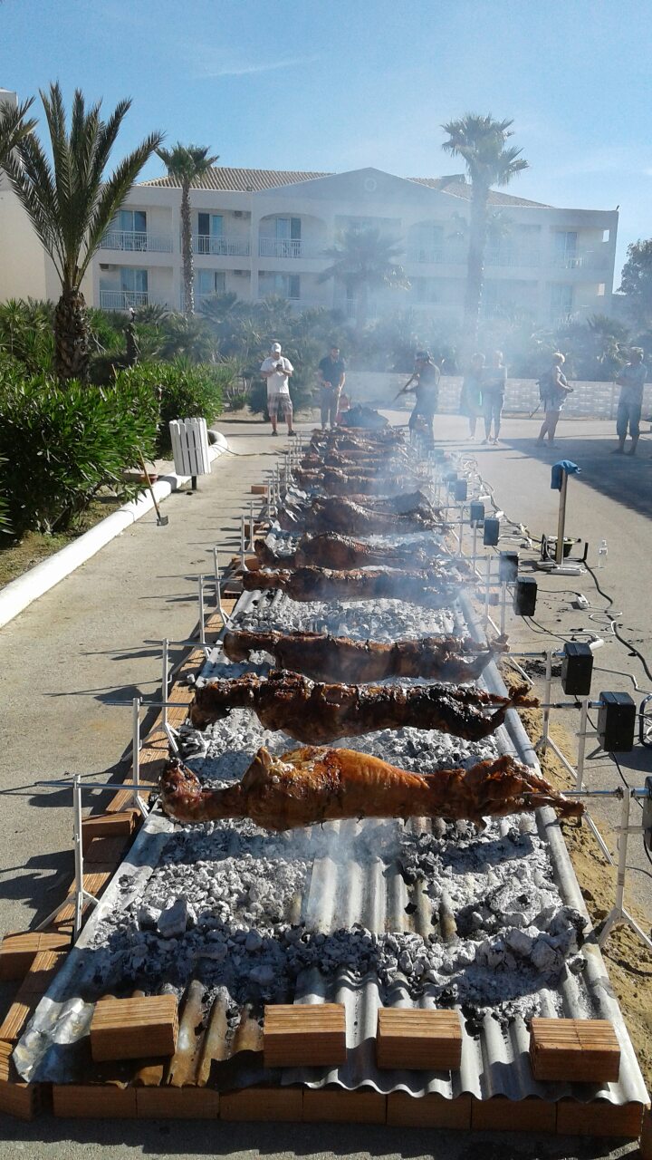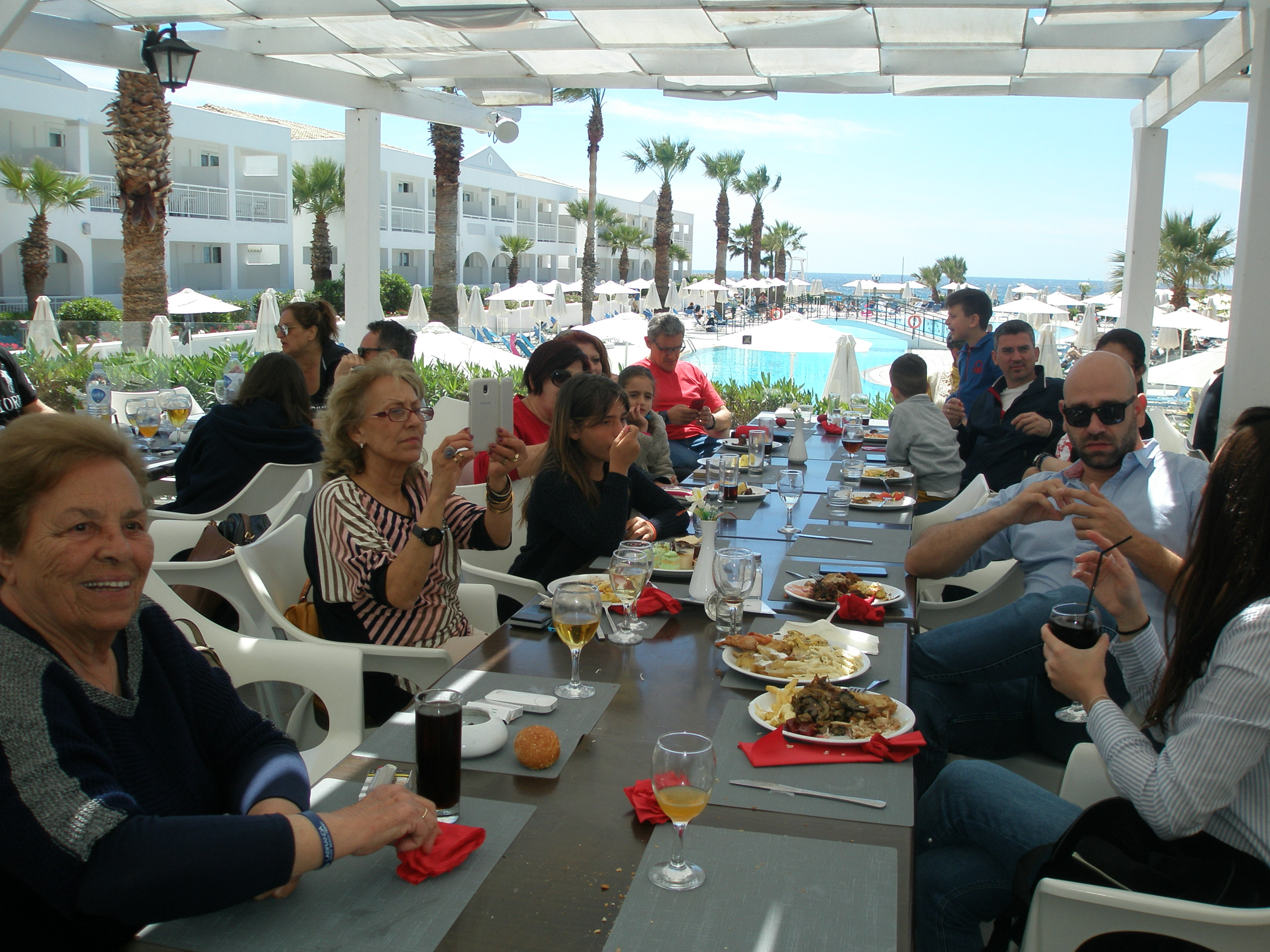 Από το πρωί στο ξενοδοχείο είχε ξεκινήσει το σούβλισμα και το ψήσιμο των αρνιών στο υπαίθριο χώρο, δίπλα στη θάλασσα. Με μεζέδες και ούζο παρακολουθούσαμε τις διαδικασίες, περιμένοντας ανυπόμονα να τελειώσουν και να… καταλήξουν στο στομάχι μας! Νωρίς το μεσημέρι με ψητά κατσίκια, αρνιά, πολλά εδέσματα και ποτά, ξεκίνησε το πασχαλινό μας τσιμπούσι σε τρία μεγάλα τραπέζια για την ΙΟΝΙΚΗ ΕΝΟΤΗΤΑ στη μεγάλη βεράντα του ξενοδοχείου με θέα τη θάλασσα, συνοδεία ζωντανής μουσικής, όπου κερκυραϊκές χορευτικές ομάδες χόρεψαν τους τοπικούς, παραδοσιακούς χορούς και βεβαίως μας έδωσαν το έναυσμα για να τους ακολουθήσουμε σε ένα αξέχαστο γλέντι που κράτησε μέχρι το απόγευμα!