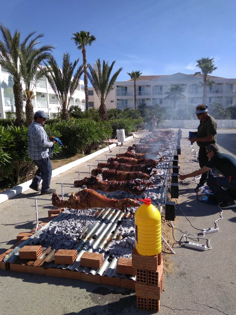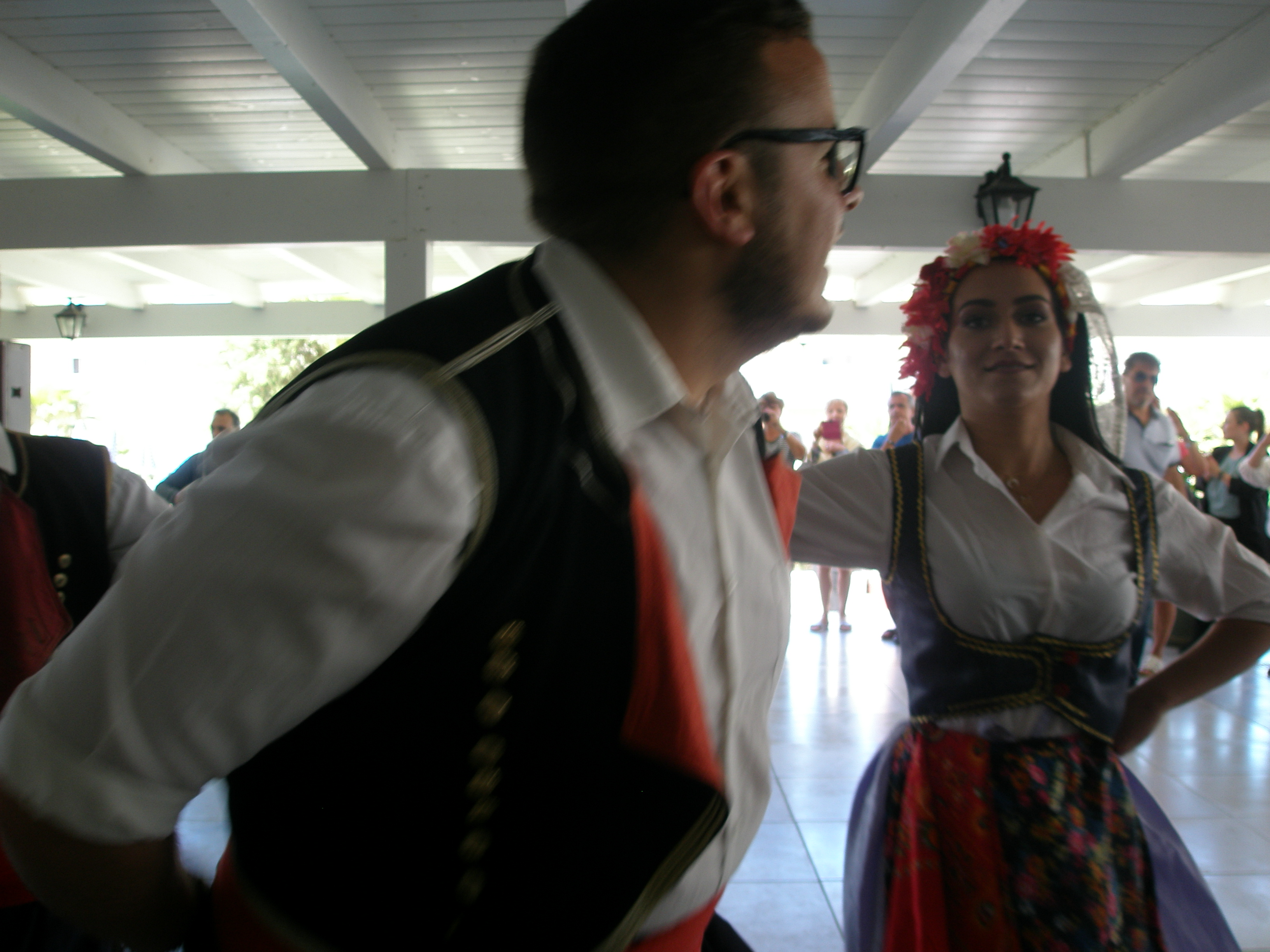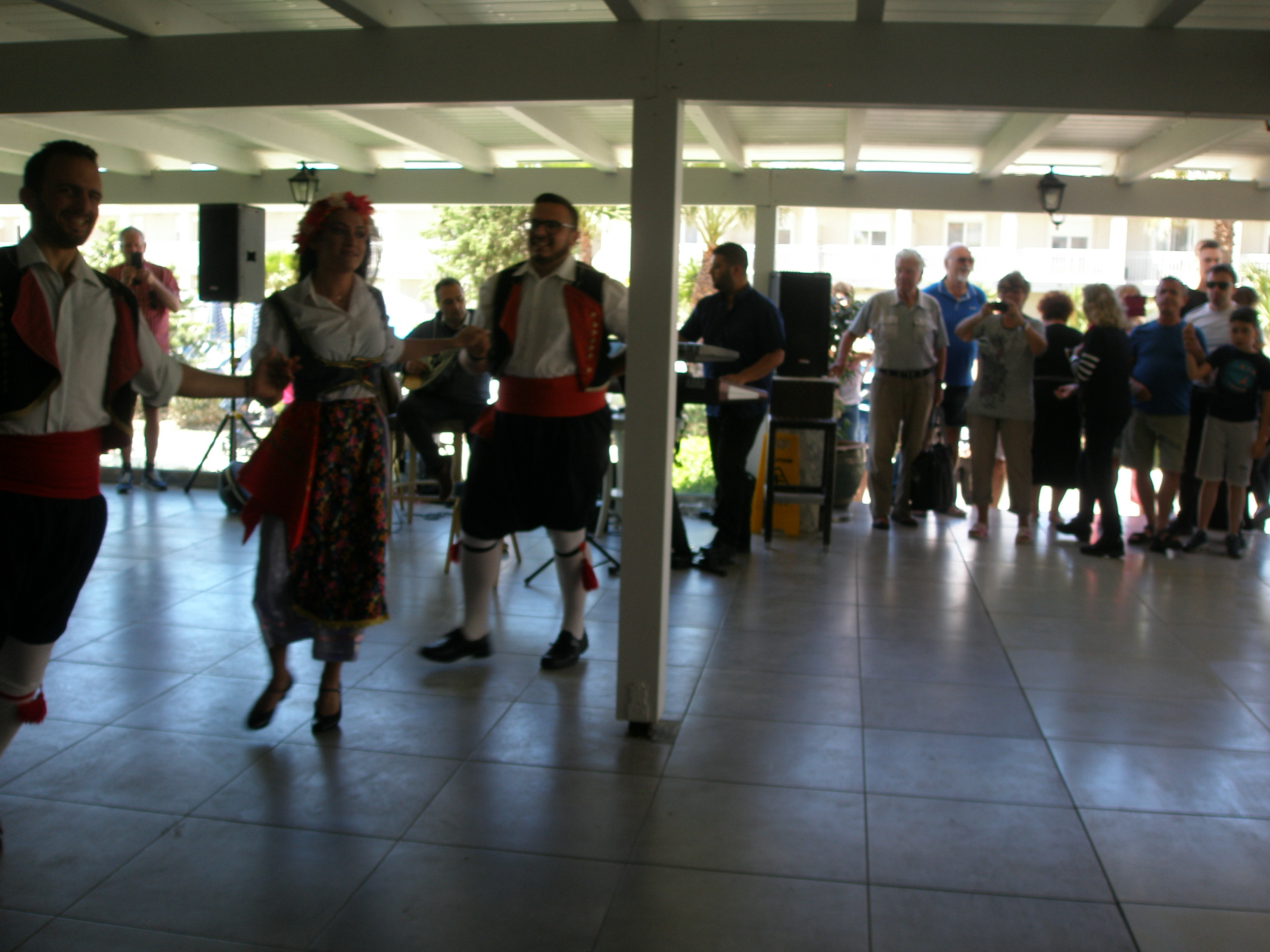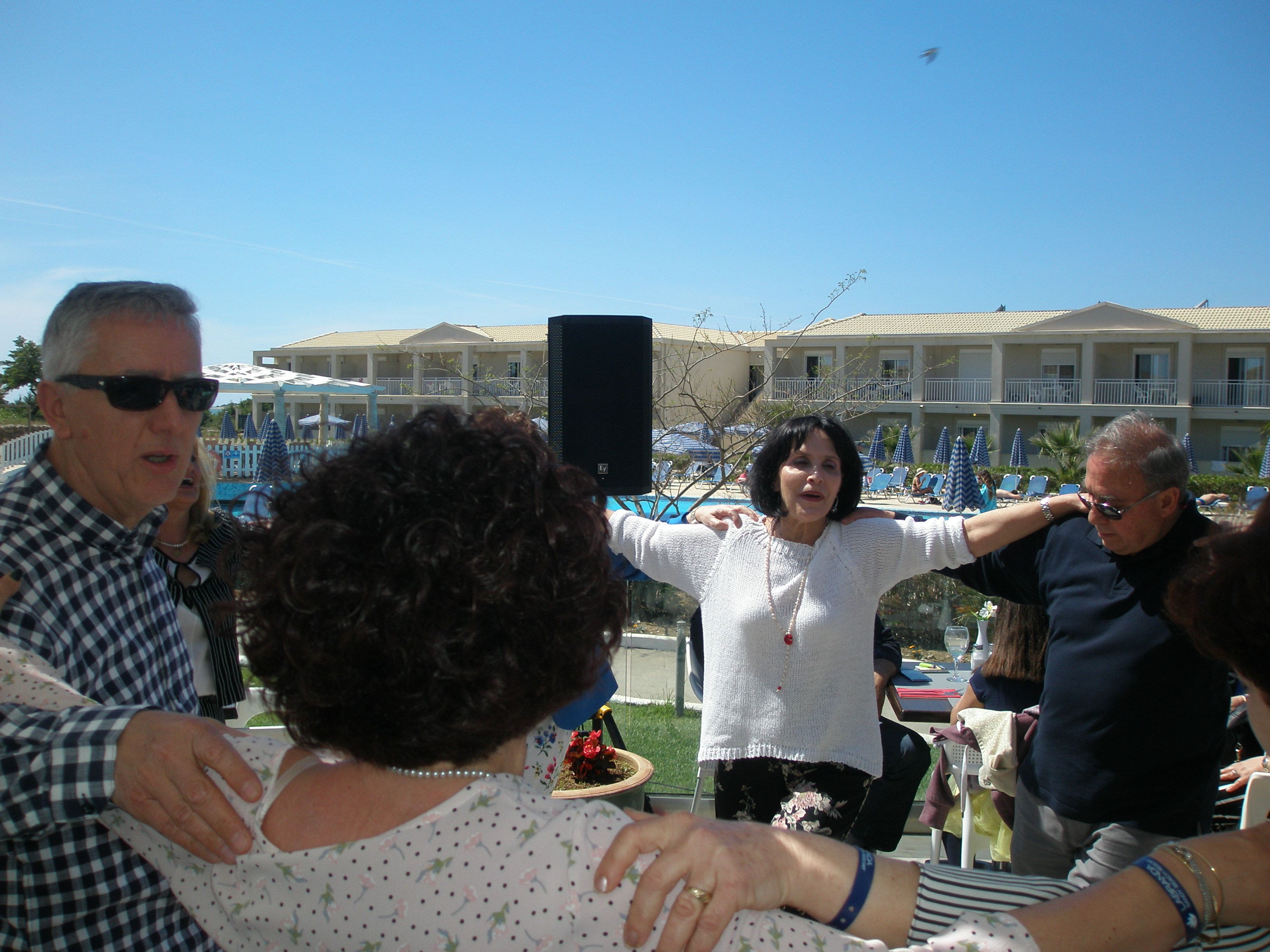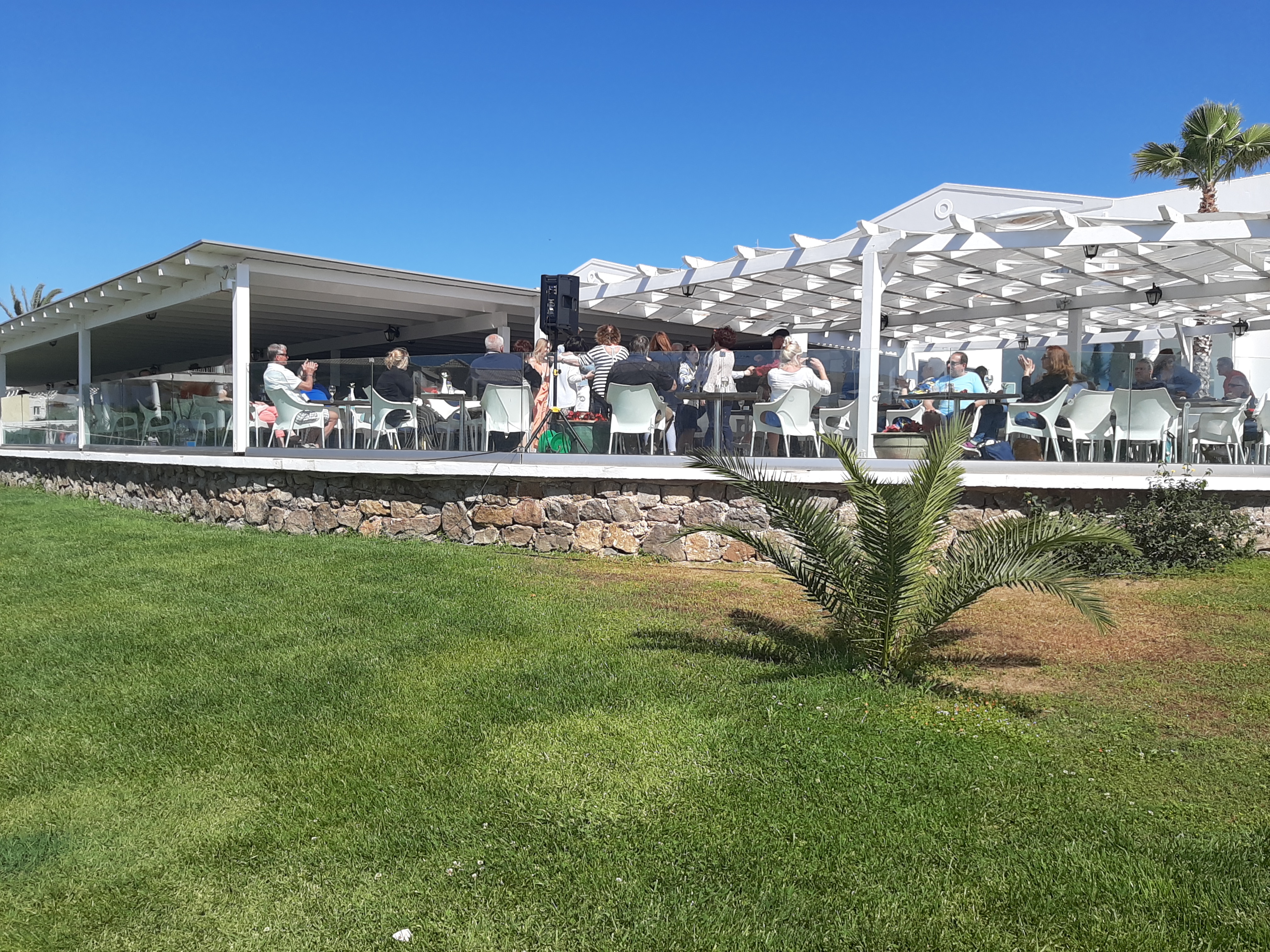 Από το πρωί στο ξενοδοχείο είχε ξεκινήσει το σούβλισμα και το ψήσιμο των αρνιών στο υπαίθριο χώρο, δίπλα στη θάλασσα. Με μεζέδες και ούζο παρακολουθούσαμε τις διαδικασίες, περιμένοντας ανυπόμονα να τελειώσουν και να… καταλήξουν στο στομάχι μας! Νωρίς το μεσημέρι με ψητά κατσίκια, αρνιά, πολλά εδέσματα και ποτά, ξεκίνησε το πασχαλινό μας τσιμπούσι σε τρία μεγάλα τραπέζια για την ΙΟΝΙΚΗ ΕΝΟΤΗΤΑ στη μεγάλη βεράντα του ξενοδοχείου με θέα τη θάλασσα, συνοδεία ζωντανής μουσικής, όπου κερκυραϊκές χορευτικές ομάδες χόρεψαν τους τοπικούς, παραδοσιακούς χορούς και βεβαίως μας έδωσαν το έναυσμα για να τους ακολουθήσουμε σε ένα αξέχαστο γλέντι που κράτησε μέχρι το απόγευμα!