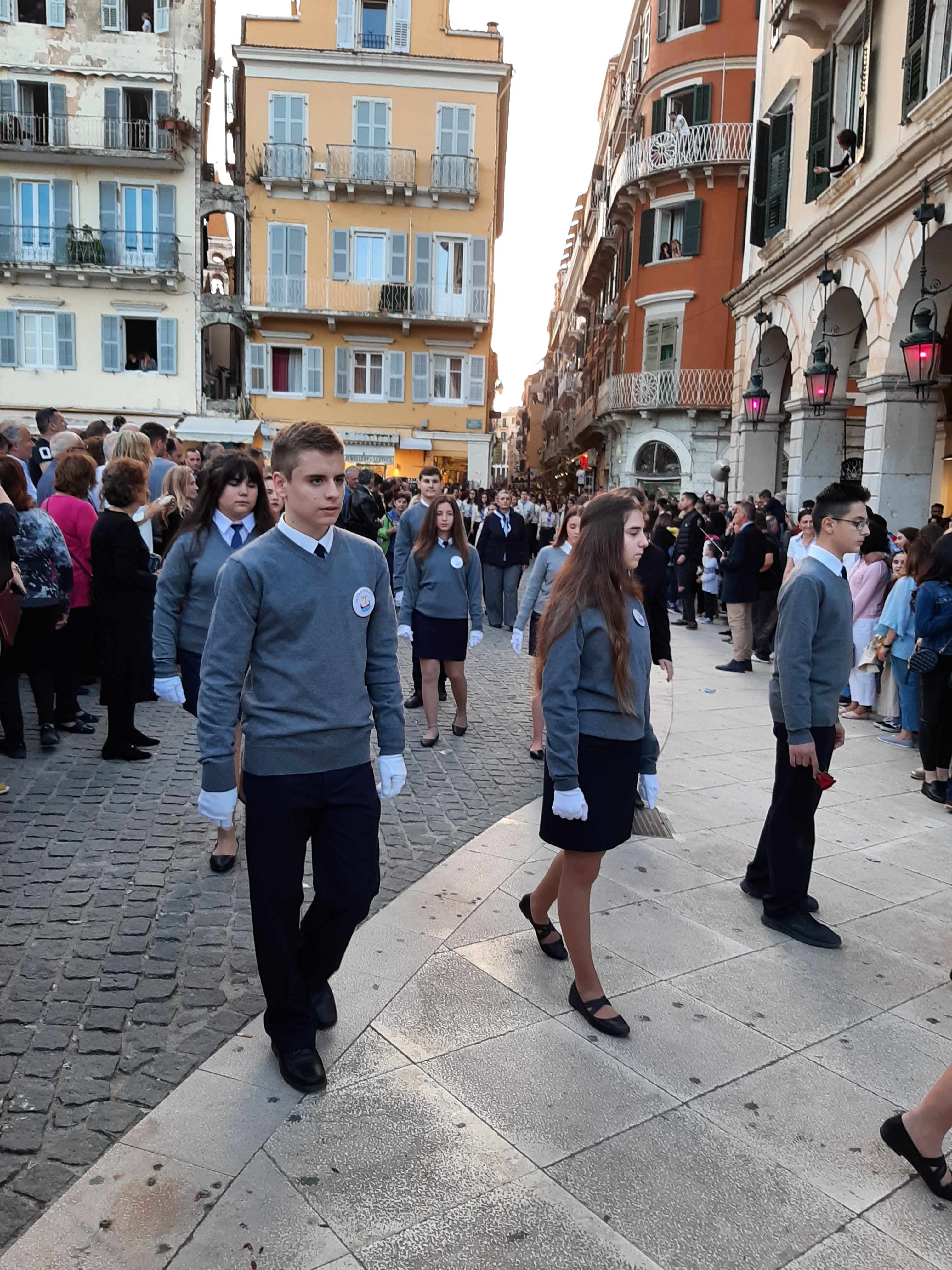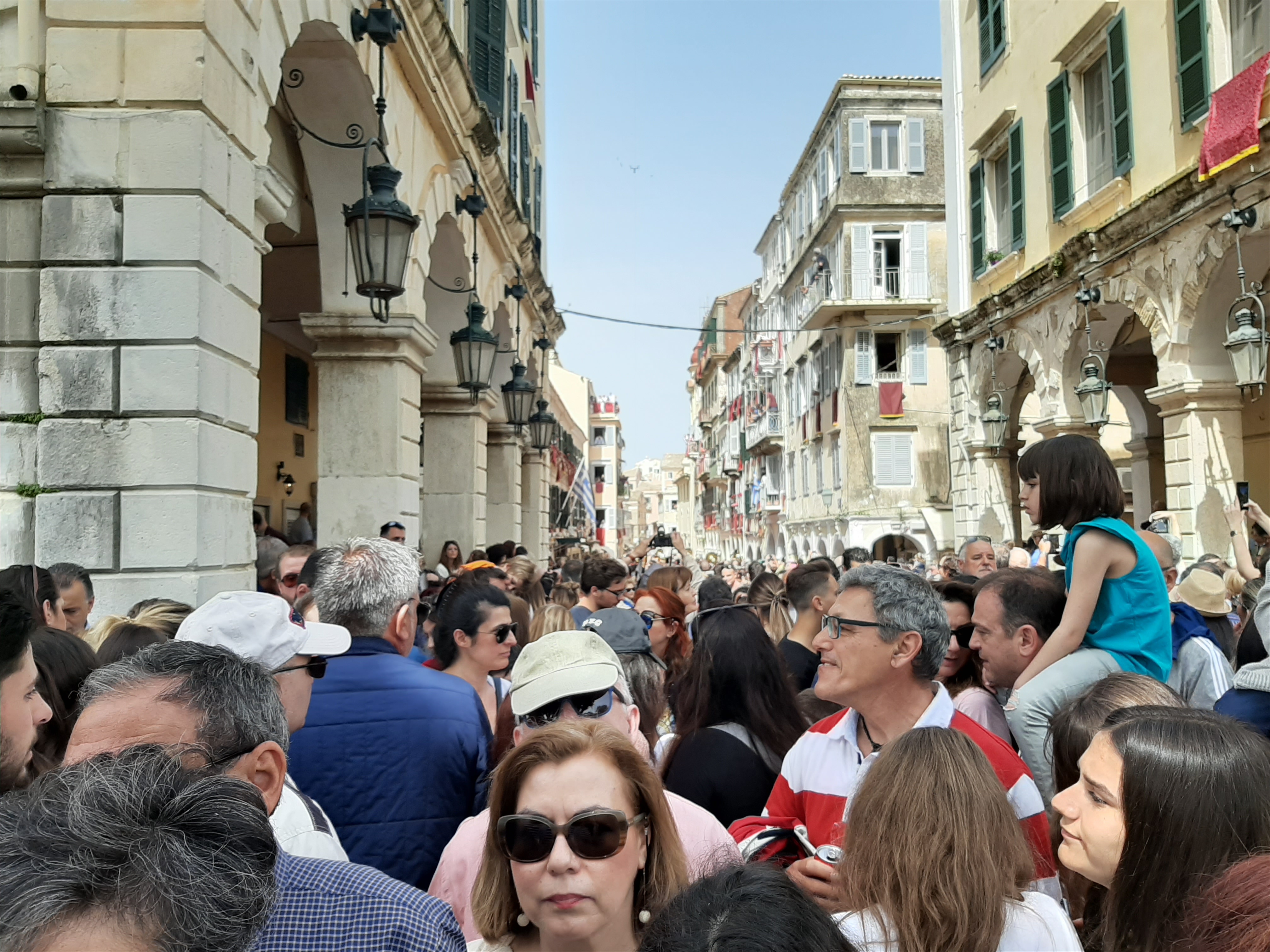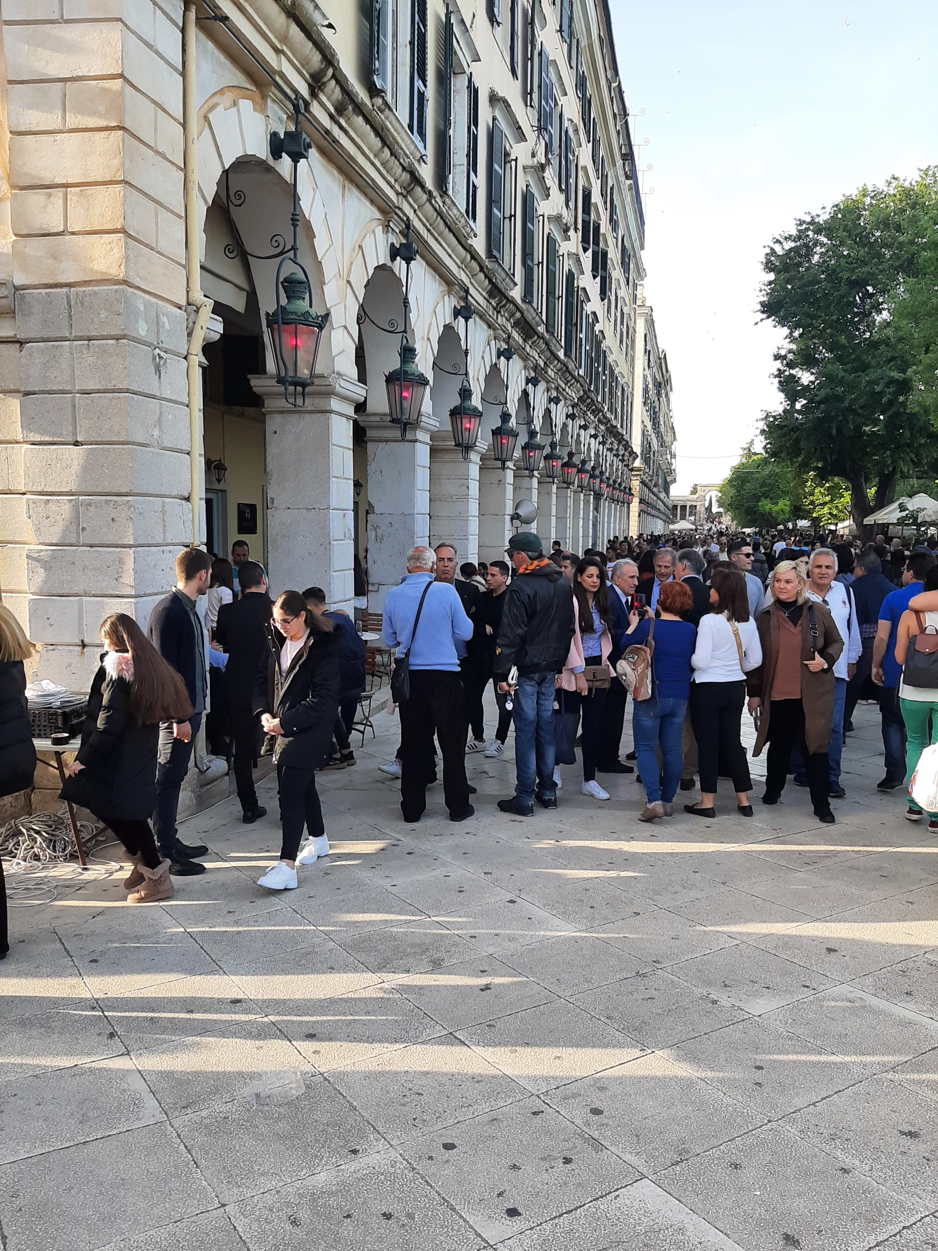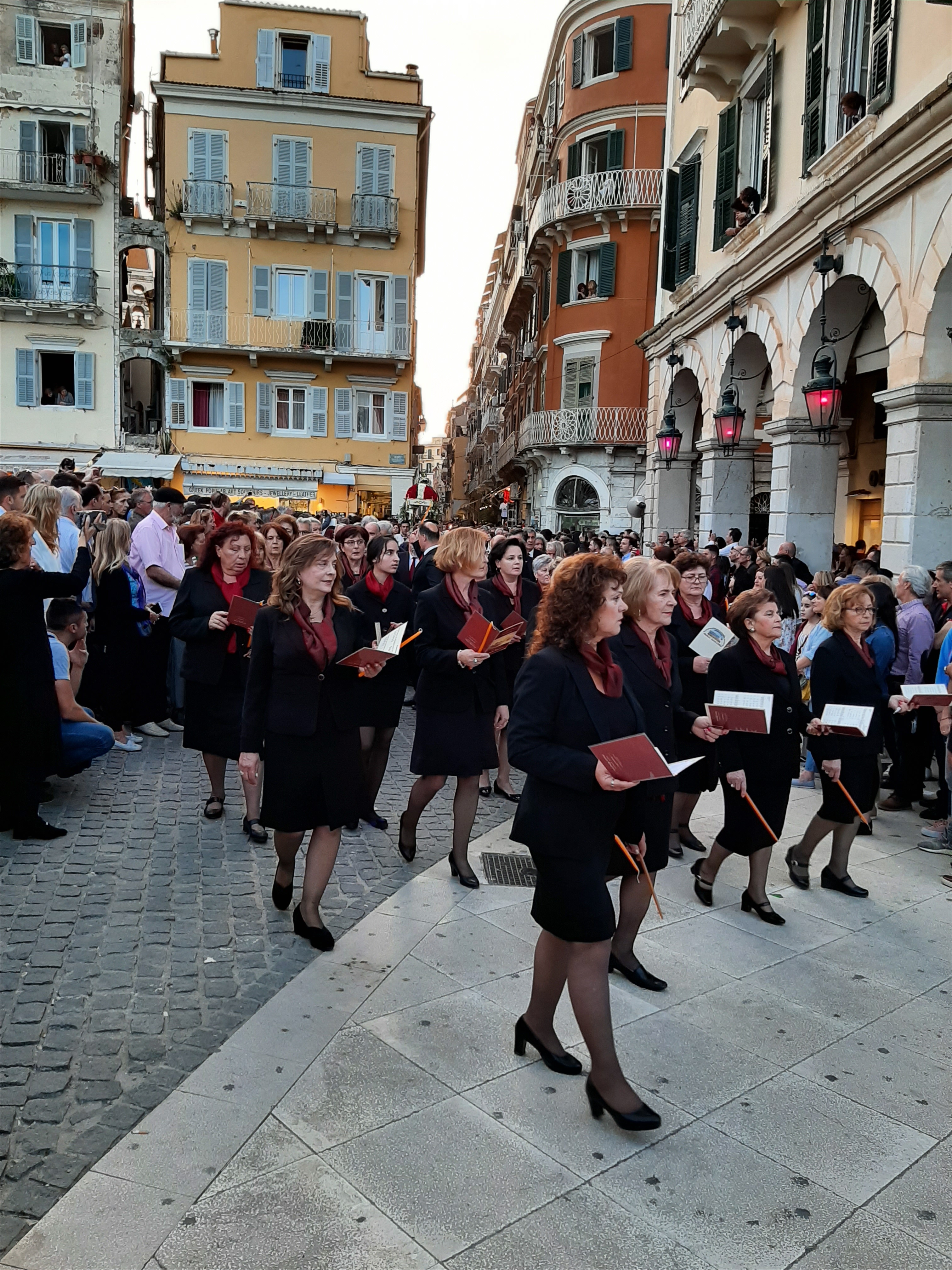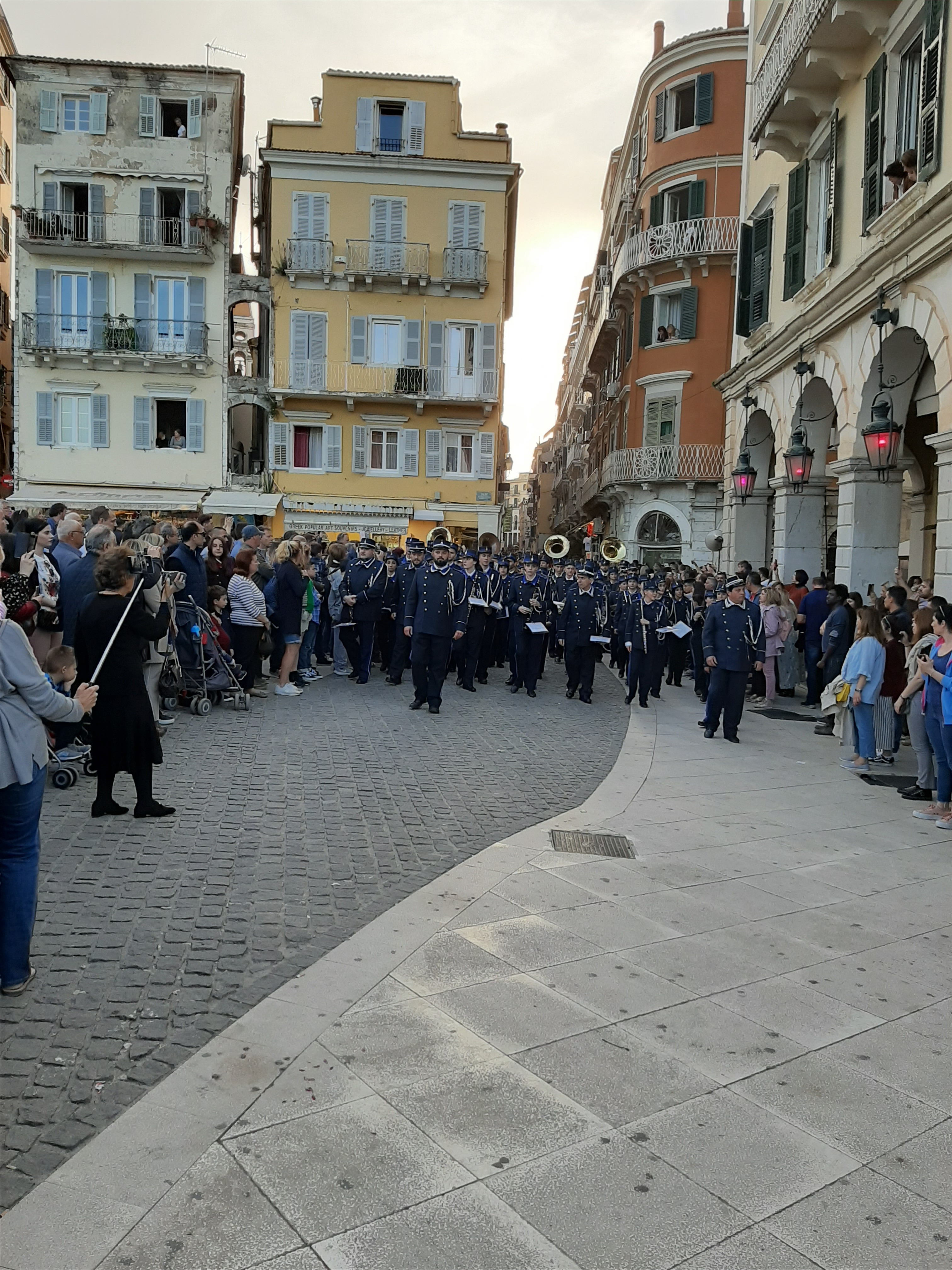 Η ώρα του μοναδικού θεάματος της πομπής των επιταφίων είχε φτάσει. Οι επιτάφιοι από τις διάφορες ενορίες της πόλης κατευθύνονται με πομπές, συνοδεία των φιλαρμονικών, προς τη Λιστόν. Ανάμεσά τους και η πομπή του επιταφίου του «διαφορετικού» καθολικού ναού που συνεορτάζει το Πάσχα στην Κέρκυρα μαζί με τους Ορθόδοξος. Μετά τις 10 μ.μ. σύσσωμες οι τρεις φιλαρμονικές σε παράταξη, με τα γυαλιστερά τους κράνη για να ξεχωρίζουν μαζί με ανδρικές και γυναικείες χορωδίες, ψέλνουν τα εγκώμια, ενώ στο μεγαλοπρεπές σκηνικό προσθέστε παρατεταγμένους μαθητές από όλα τα σχολεία της πόλης και αντιπροσωπείες κοινωνικών φορέων σε ένα εντυπωσιακό θέαμα που κρατά μέχρι και μετά τα μεσάνυχτα! Ευχαριστημένοι και πραγματικά άκρως εντυπωσιασμένοι από τα δρώμενα της Μεγάλης Παρασκευής, αλλά και κουρασμένοι από τις δραστηριότητες της ημέρας, γυρίσαμε στο ξενοδοχείο μας.