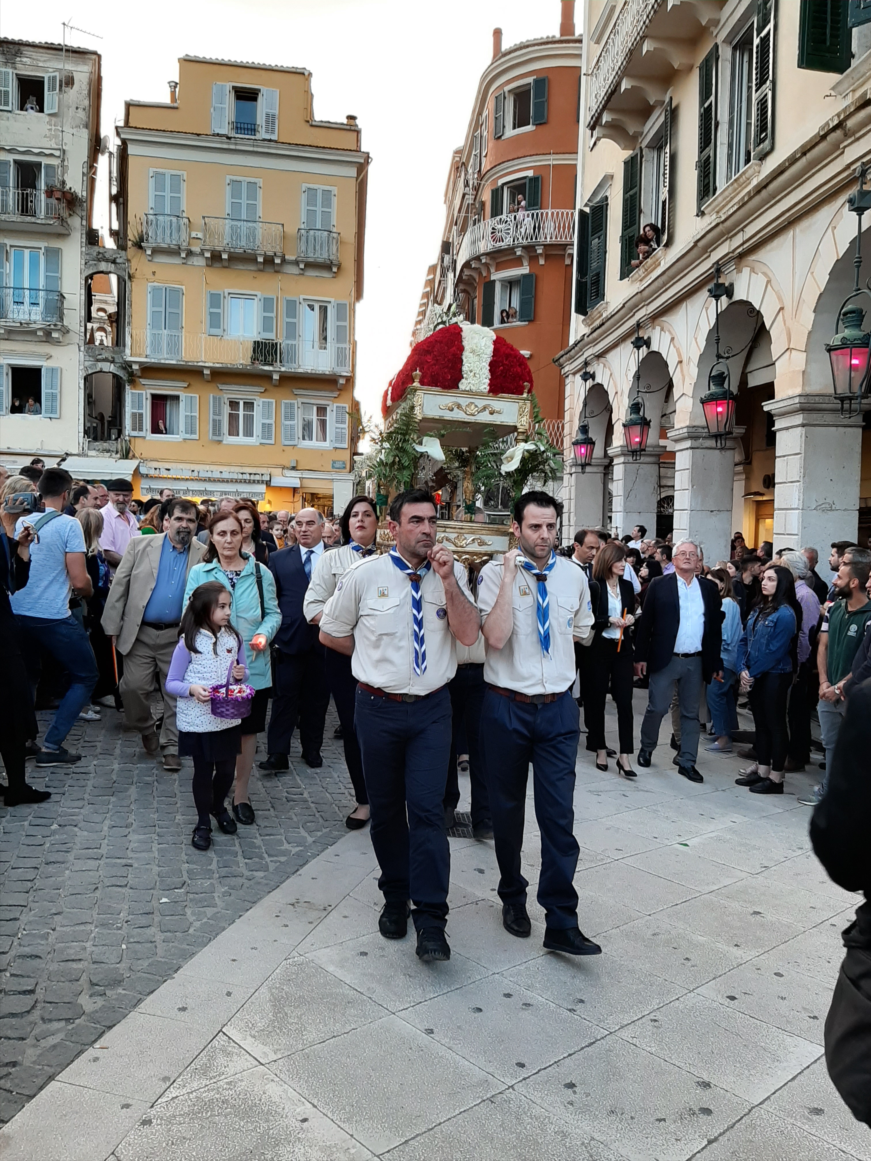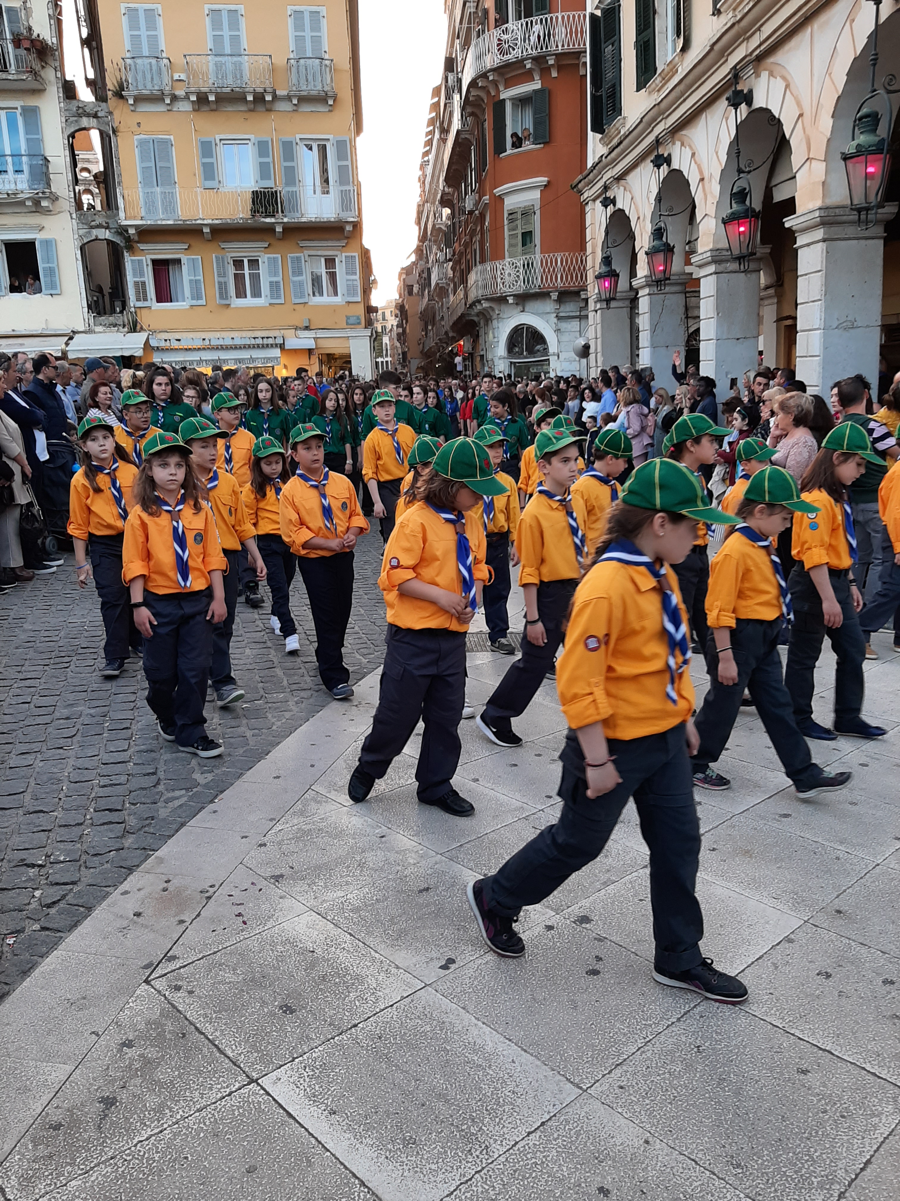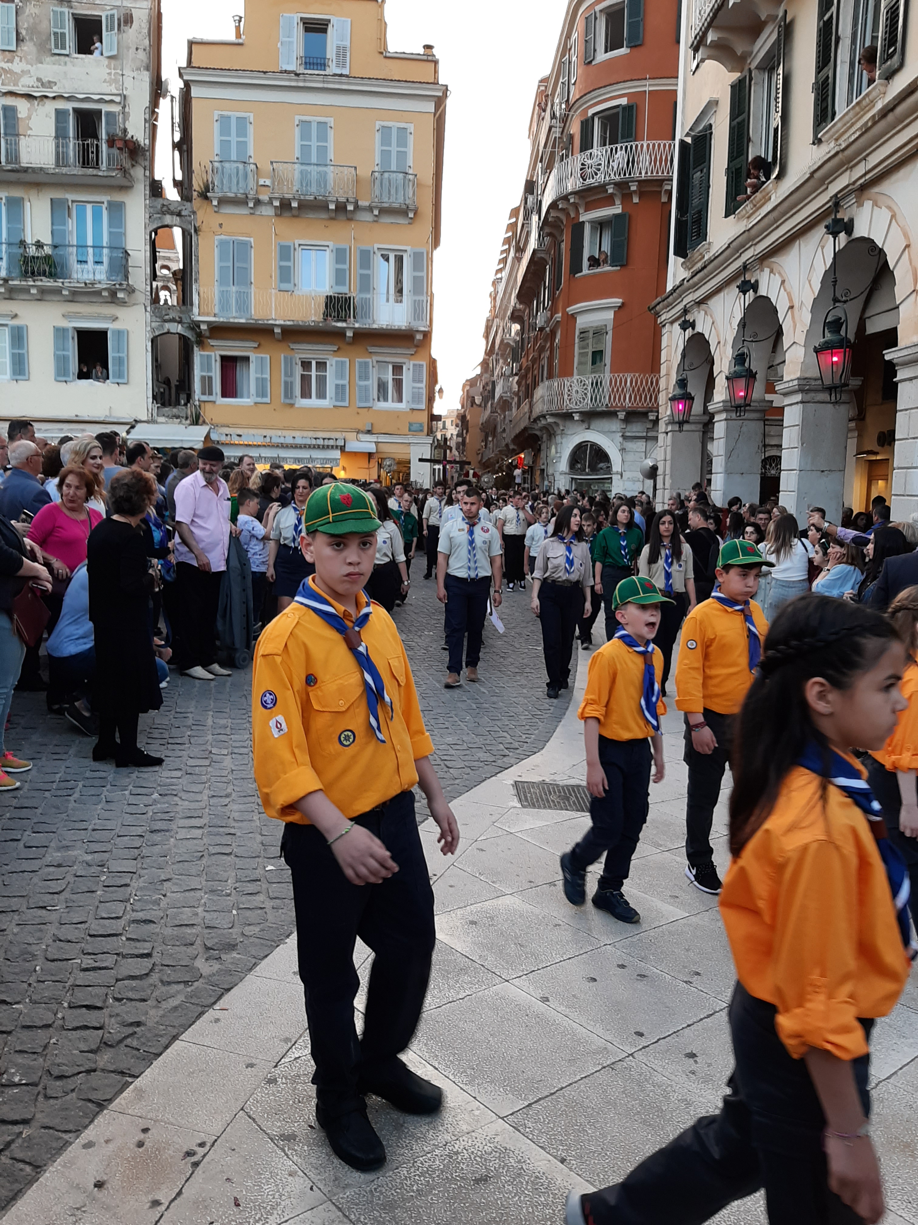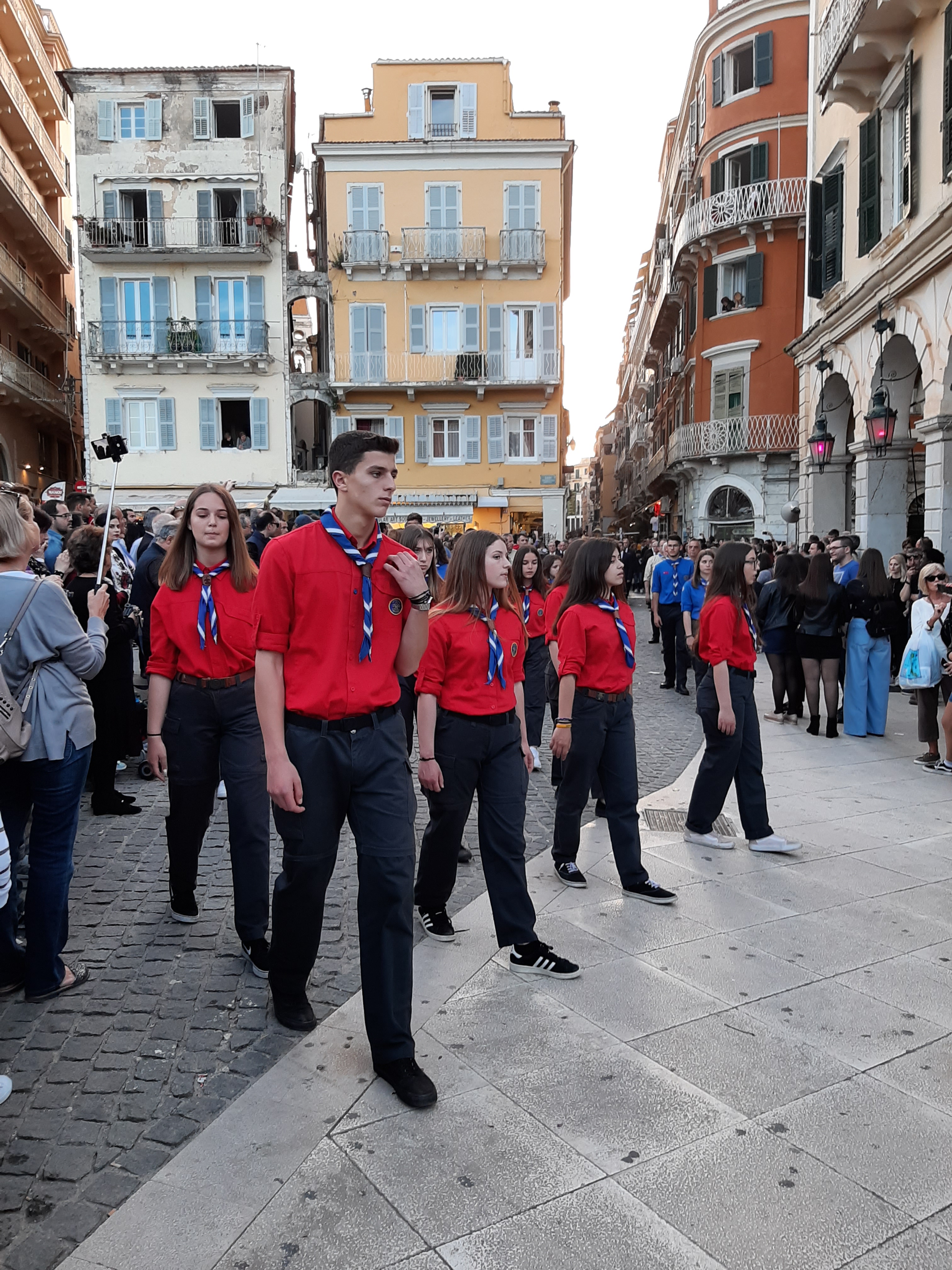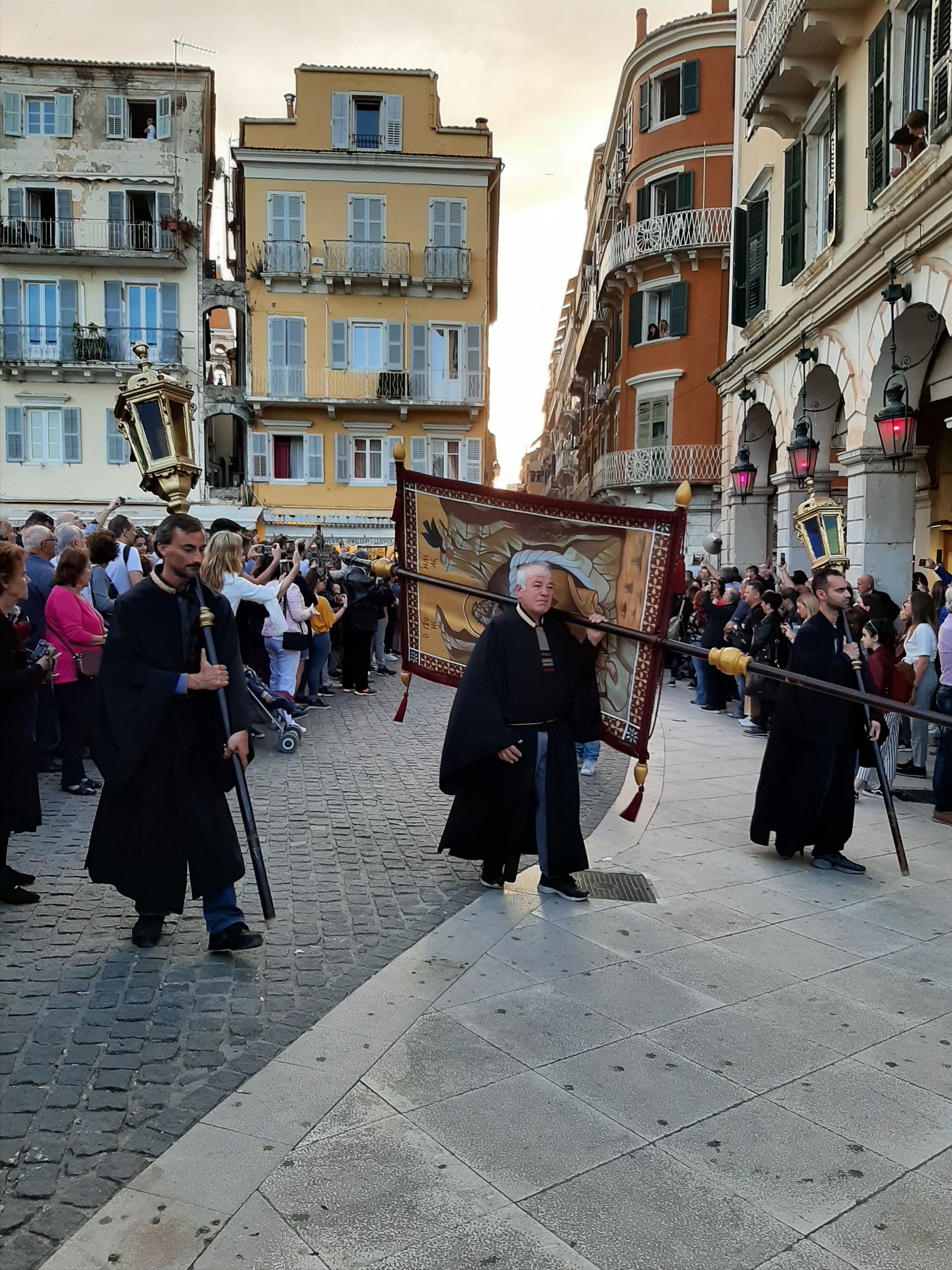 Η ώρα του μοναδικού θεάματος της πομπής των επιταφίων είχε φτάσει. Οι επιτάφιοι από τις διάφορες ενορίες της πόλης κατευθύνονται με πομπές, συνοδεία των φιλαρμονικών, προς τη Λιστόν. Ανάμεσά τους και η πομπή του επιταφίου του «διαφορετικού» καθολικού ναού που συνεορτάζει το Πάσχα στην Κέρκυρα μαζί με τους Ορθόδοξος. Μετά τις 10 μ.μ. σύσσωμες οι τρεις φιλαρμονικές σε παράταξη, με τα γυαλιστερά τους κράνη για να ξεχωρίζουν μαζί με ανδρικές και γυναικείες χορωδίες, ψέλνουν τα εγκώμια, ενώ στο μεγαλοπρεπές σκηνικό προσθέστε παρατεταγμένους μαθητές από όλα τα σχολεία της πόλης και αντιπροσωπείες κοινωνικών φορέων σε ένα εντυπωσιακό θέαμα που κρατά μέχρι και μετά τα μεσάνυχτα! Ευχαριστημένοι και πραγματικά άκρως εντυπωσιασμένοι από τα δρώμενα της Μεγάλης Παρασκευής, αλλά και κουρασμένοι από τις δραστηριότητες της ημέρας, γυρίσαμε στο ξενοδοχείο μας.