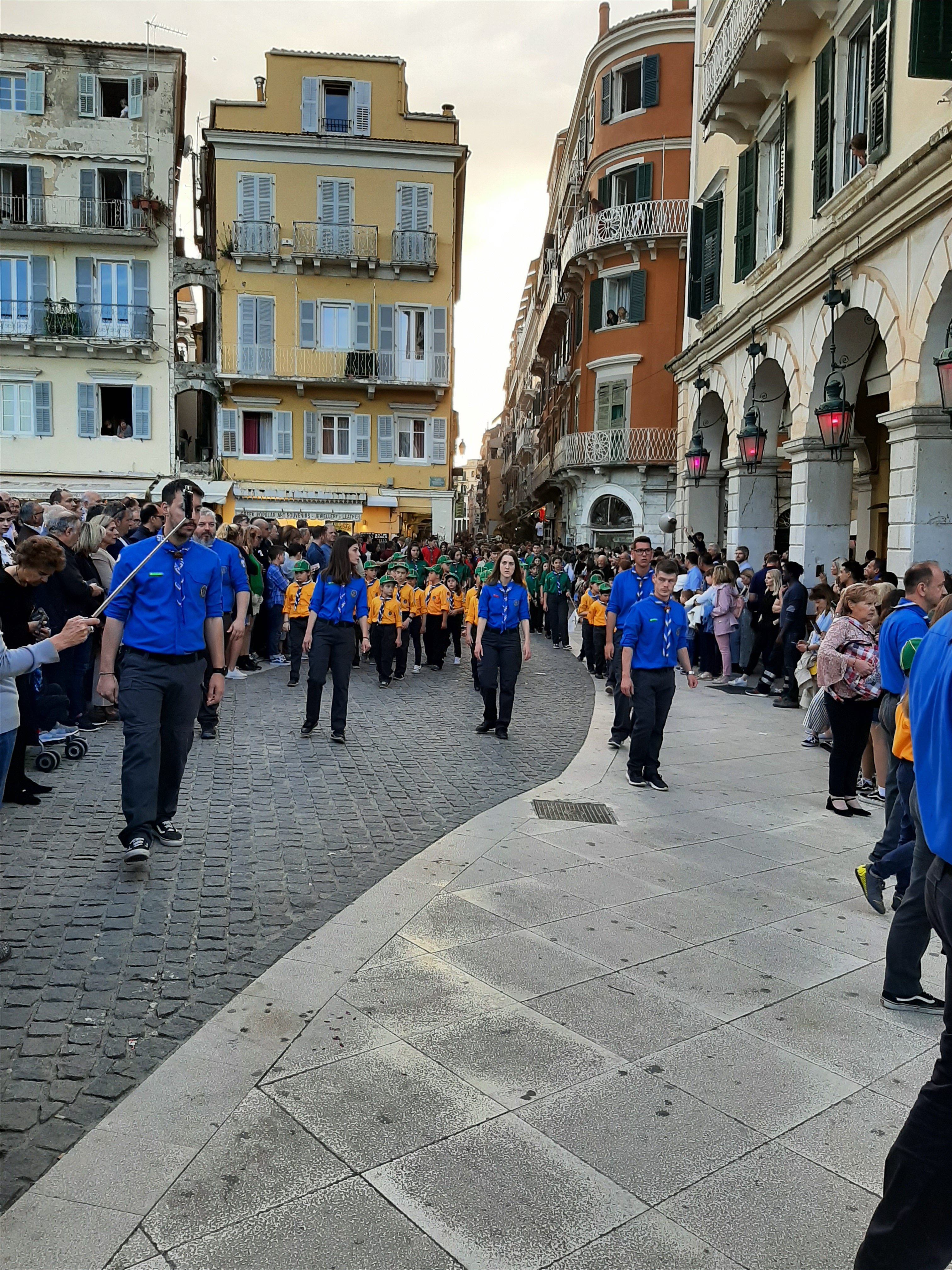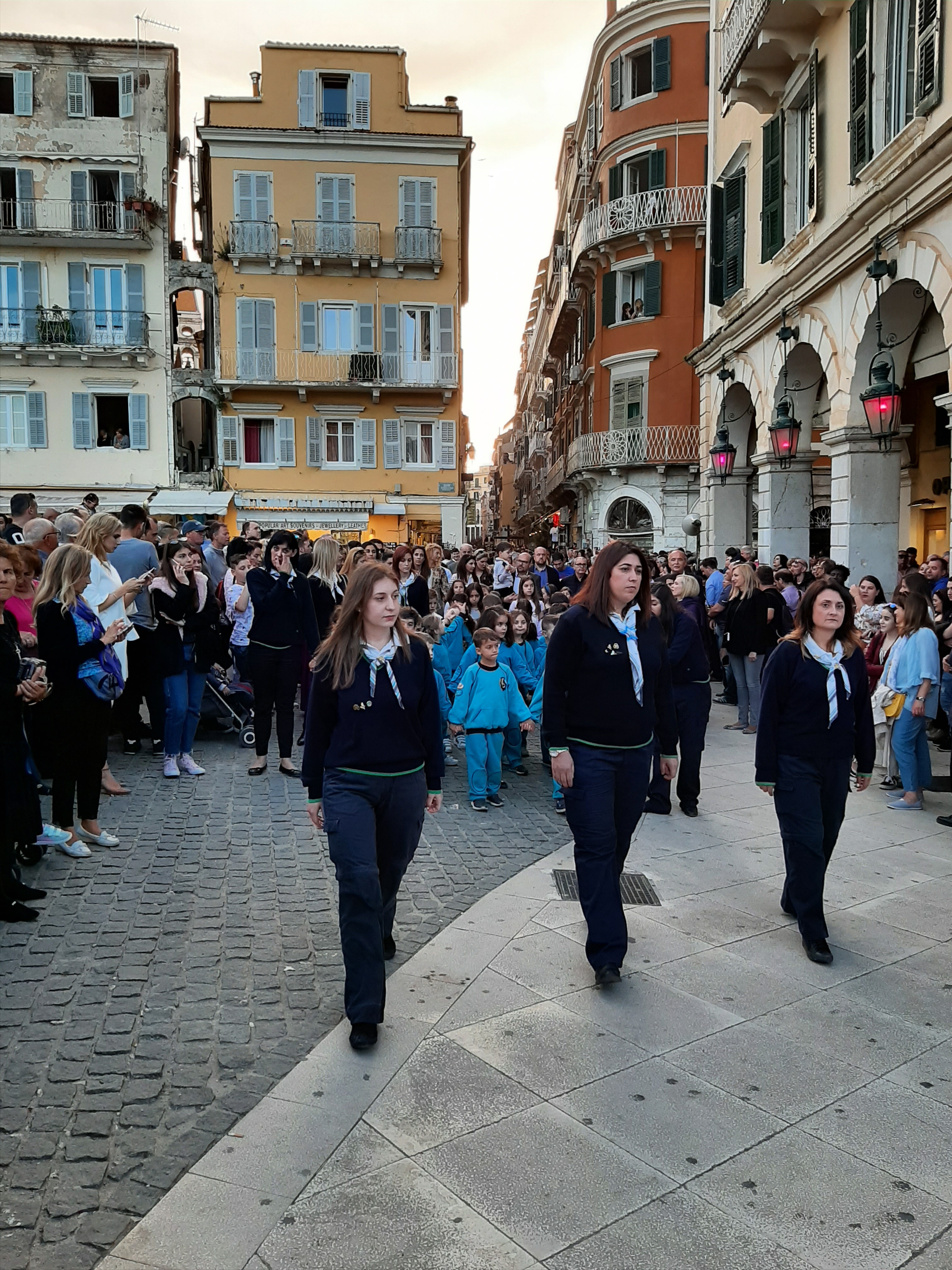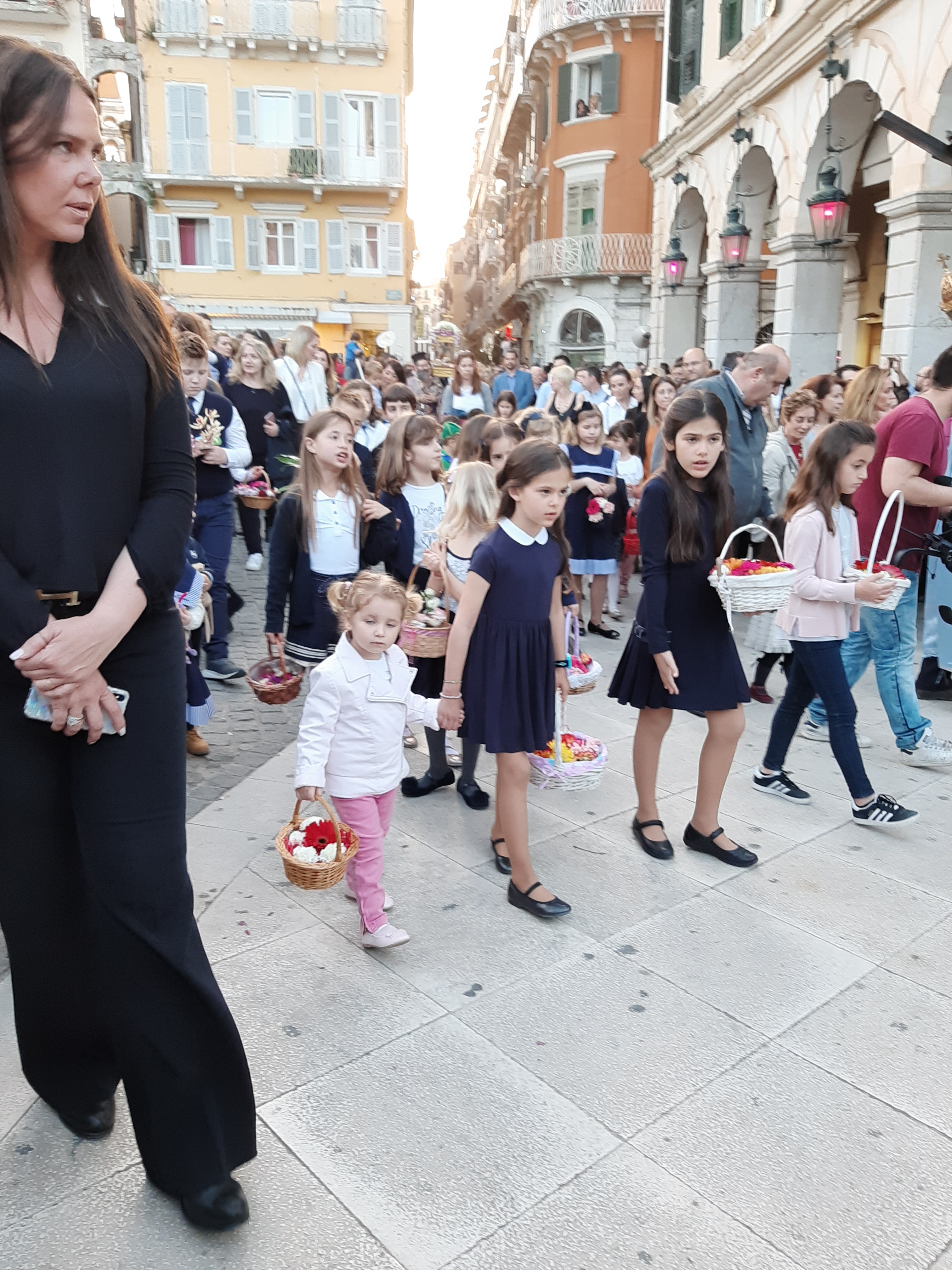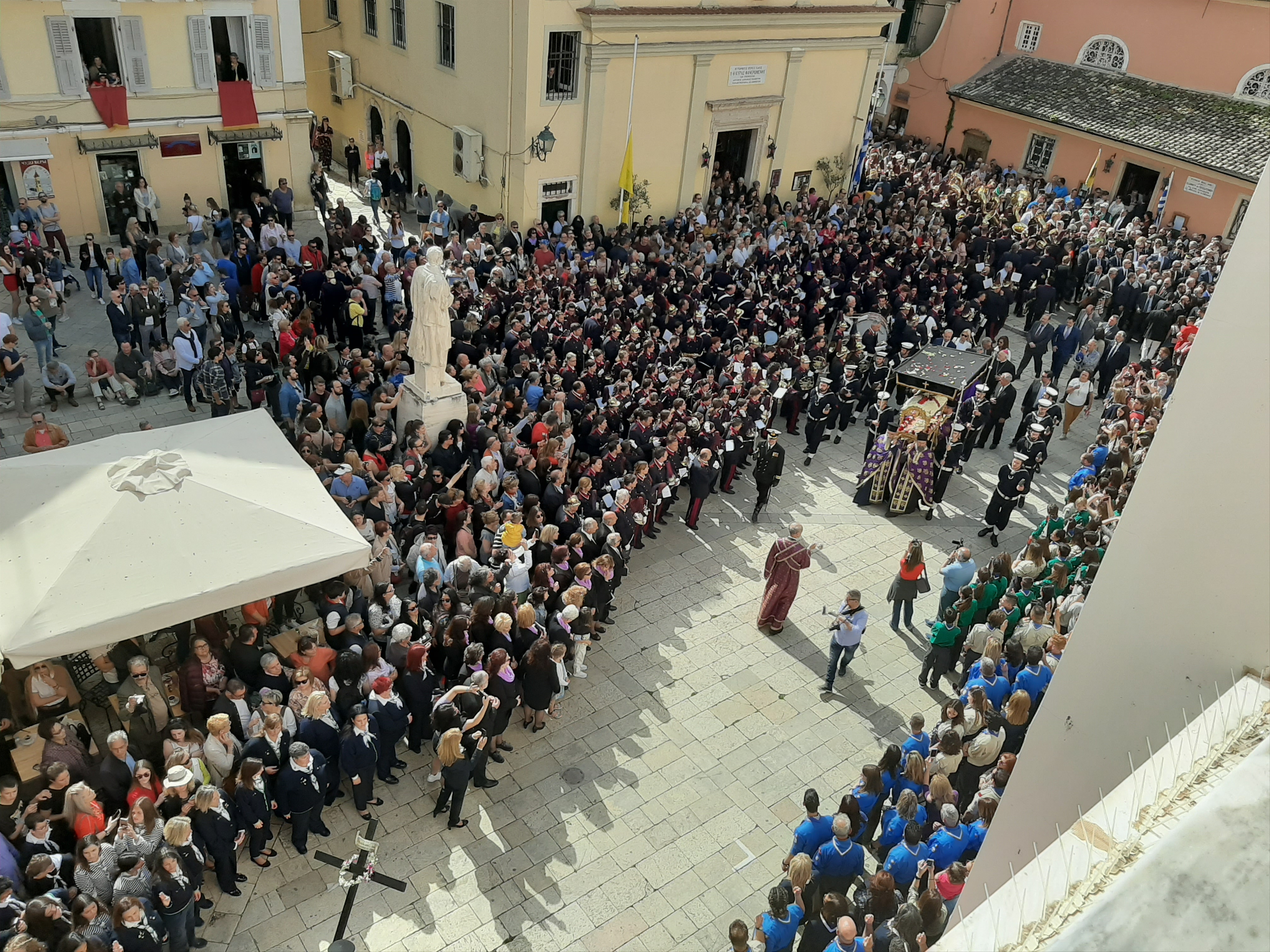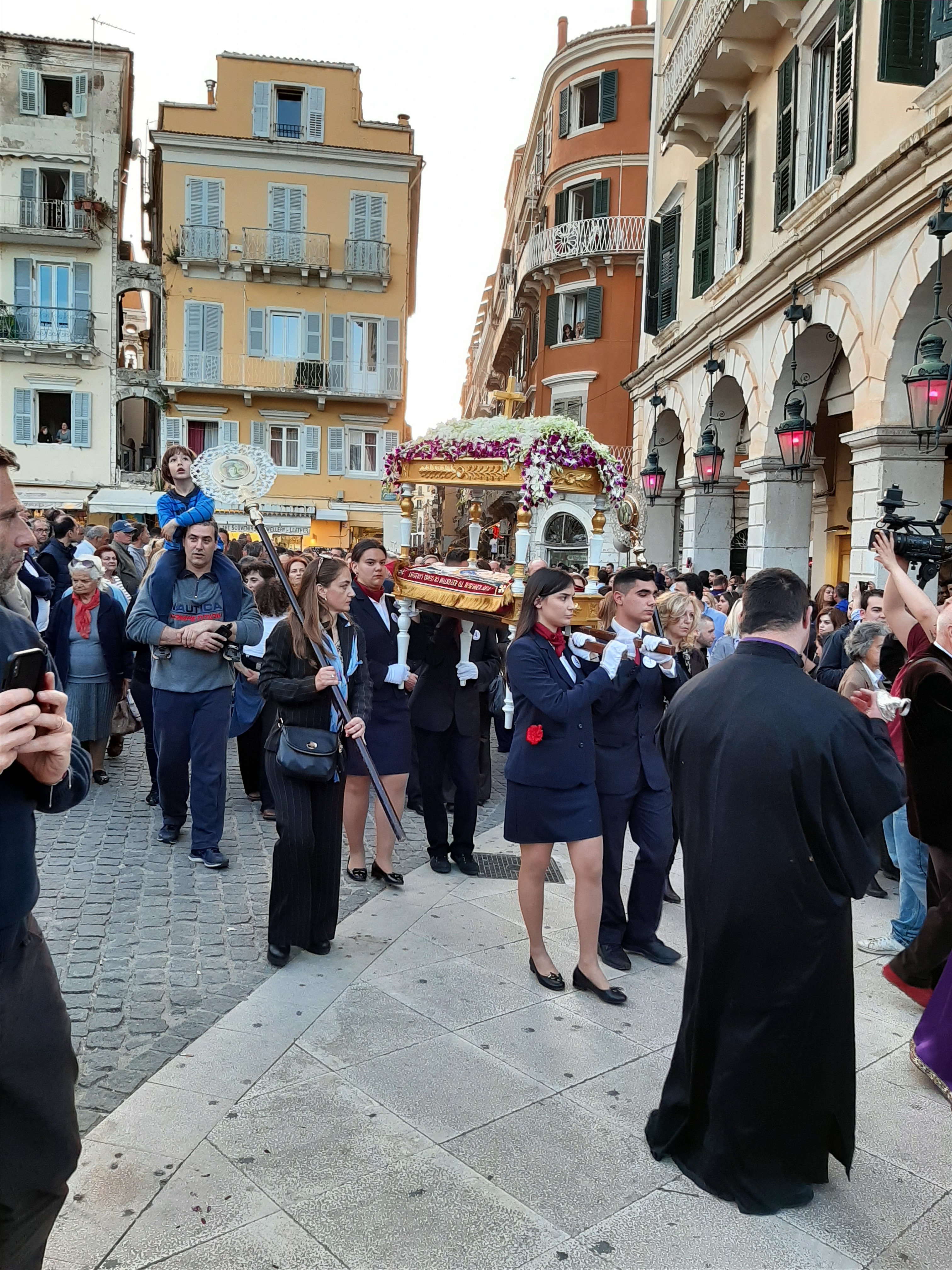 Η ώρα του μοναδικού θεάματος της πομπής των επιταφίων είχε φτάσει. Οι επιτάφιοι από τις διάφορες ενορίες της πόλης κατευθύνονται με πομπές, συνοδεία των φιλαρμονικών, προς τη Λιστόν. Ανάμεσά τους και η πομπή του επιταφίου του «διαφορετικού» καθολικού ναού που συνεορτάζει το Πάσχα στην Κέρκυρα μαζί με τους Ορθόδοξος. Μετά τις 10 μ.μ. σύσσωμες οι τρεις φιλαρμονικές σε παράταξη, με τα γυαλιστερά τους κράνη για να ξεχωρίζουν μαζί με ανδρικές και γυναικείες χορωδίες, ψέλνουν τα εγκώμια, ενώ στο μεγαλοπρεπές σκηνικό προσθέστε παρατεταγμένους μαθητές από όλα τα σχολεία της πόλης και αντιπροσωπείες κοινωνικών φορέων σε ένα εντυπωσιακό θέαμα που κρατά μέχρι και μετά τα μεσάνυχτα! Ευχαριστημένοι και πραγματικά άκρως εντυπωσιασμένοι από τα δρώμενα της Μεγάλης Παρασκευής, αλλά και κουρασμένοι από τις δραστηριότητες της ημέρας, γυρίσαμε στο ξενοδοχείο μας.