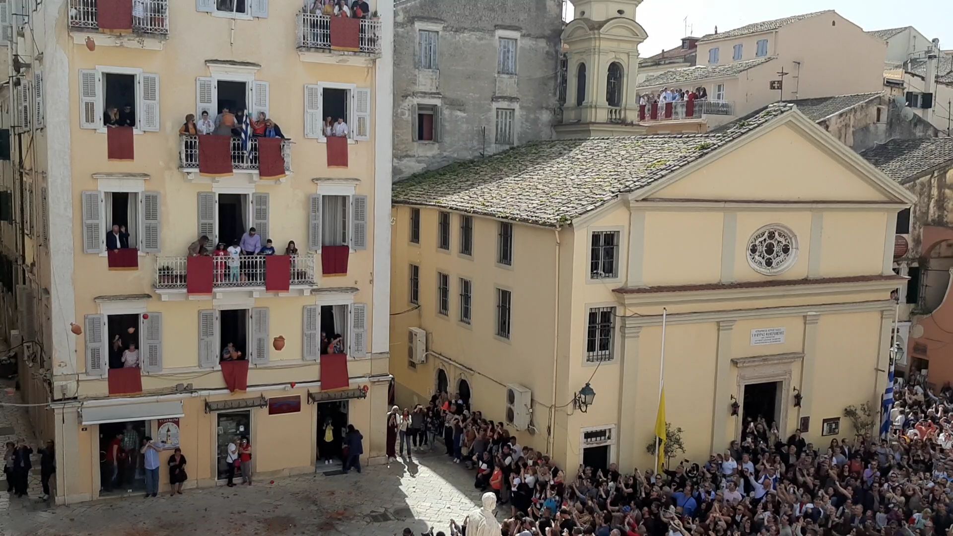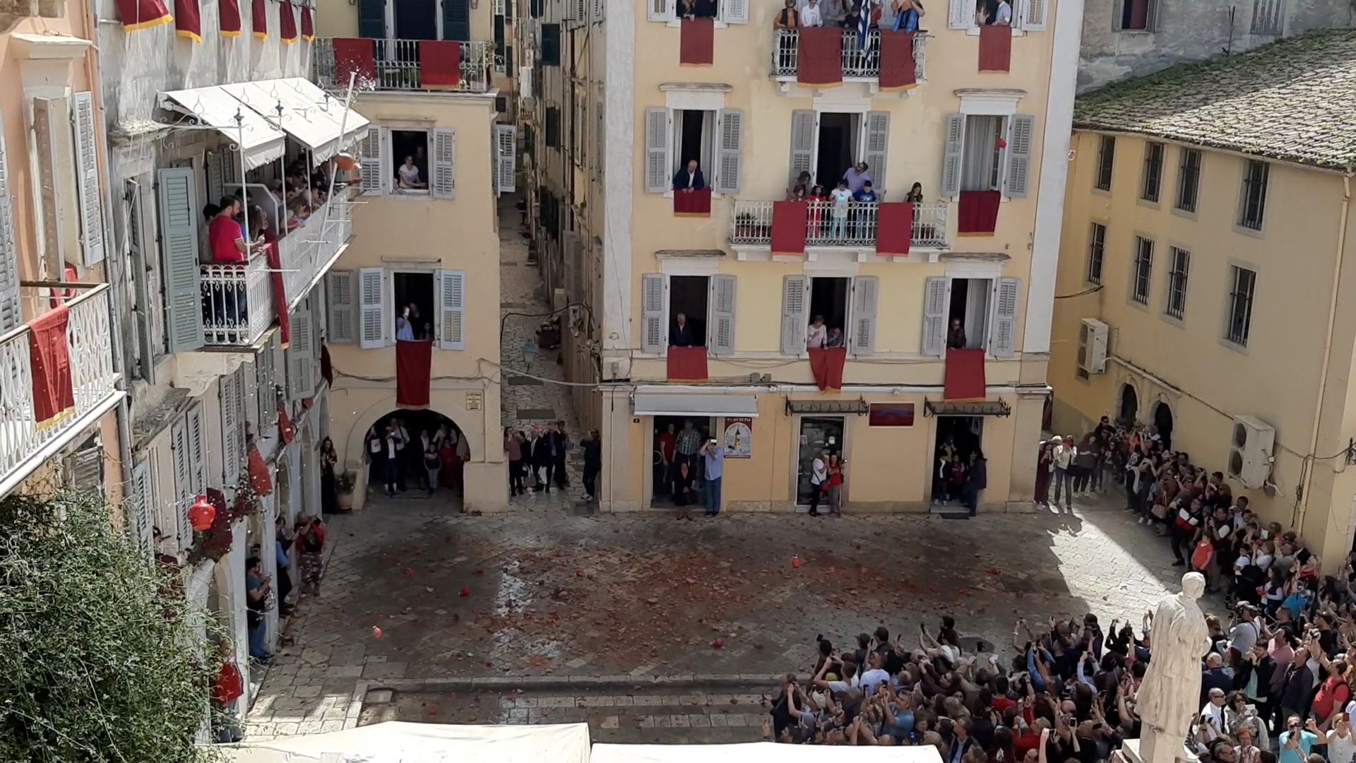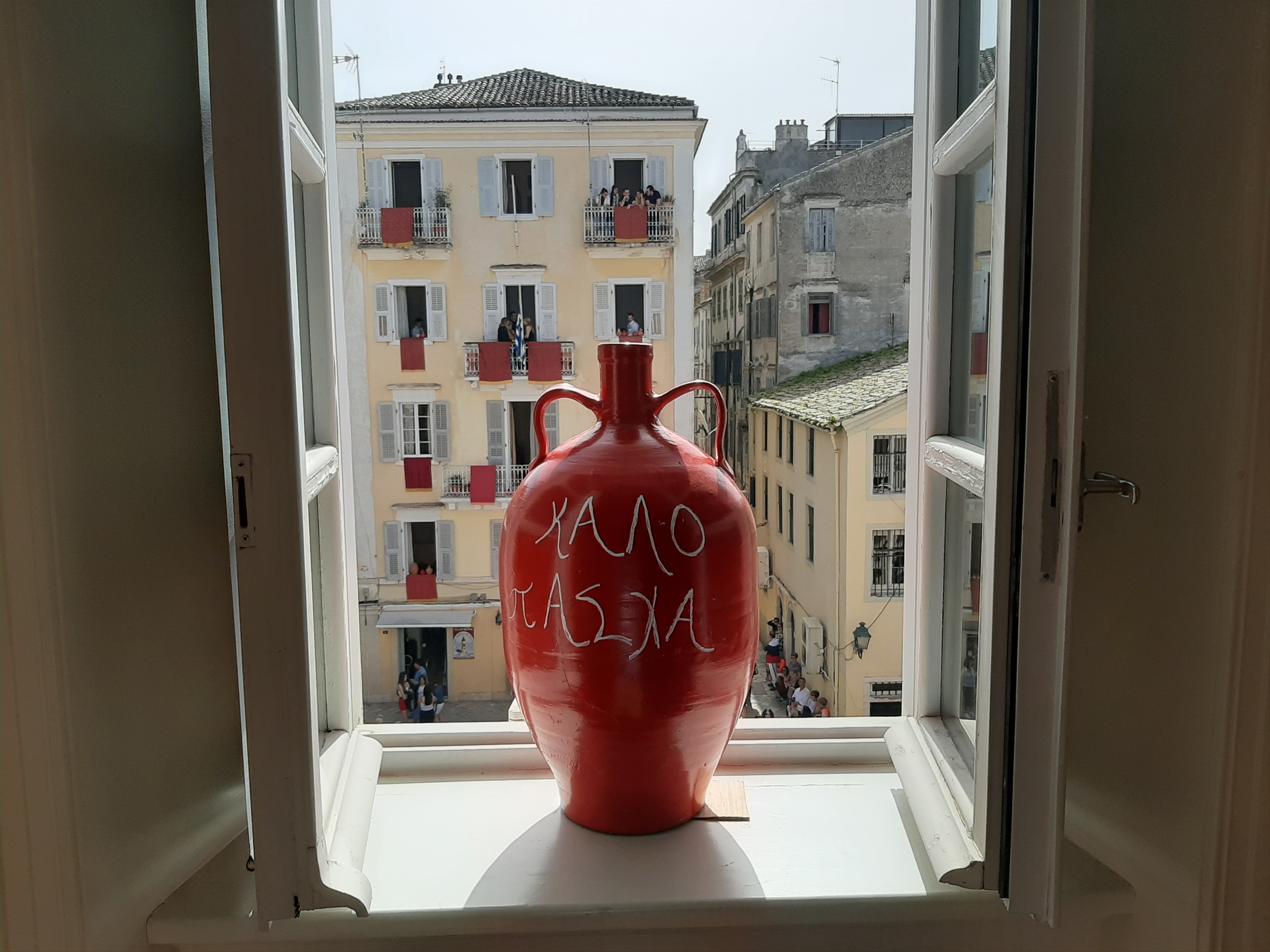 Το Μεγάλο Σάββατο μας επεφύλασσε και άλλες πολύ όμορφες εκδηλώσεις και βεβαίως περιλάμβανε το πιο γνωστό έθιμο του κερκυραϊκού Πάσχα με τη ρίψη των κανατιών. Επειδή όμως η πρώτη Ανάσταση και το ξεχωριστό θέαμα των κανατιών προσελκύει πιστούς από όλη την Ελλάδα με αποτέλεσμα να επικρατεί το… αδιαχώρητο, πολύ νωρίς το πρωί μετά το πρωινό μας επιβιβαστήκαμε στο λεωφορείο για να προλάβουμε να μπούμε στην πόλη πριν επικρατήσει το αδιαχώρητο, προκειμένου να φτάσουμε στο κτίριο της τράπεζας της καρδιάς μας που βρίσκεται στο επίκεντρο των εκδηλώσεων, από όπου θα τις παρακολουθούσαμε προσκεκλημένοι των Κερκυραίων συναδέλφων μας. Πράγματι, διασχίσαμε τη σημαιοστολισμένη προς τιμήν του Αγίου Σπυρίδωνα με τα πορφυρά επονομαζόμενα δαμάσκο (επειδή τα υφάσματα αυτά έρχονταν αρχικά από τη Δαμασκό) πόλη φτάνοντας στο κτίριο της Ιονικής και από τα παράθυρα και τα μπαλκόνια είχαμε την ευκαιρία να ζήσουμε, χωρίς να ταλαιπωρηθούμε, τόσο τη λιτανεία του Αγίου Σπυρίδωνα -το Μεγάλο Σάββατο είναι η μοναδική μέρα που περιφέρεται όρθιο το σκήνωμα του Αγίου συνοδεία των φιλαρμονικών – όσο και εν συνεχεία στις 11 π.μ. υπό τον ήχο των καμπανών του Αγίου Σπυρίδωνα -που είναι ακριβώς δίπλα στο πρώην κτίριο της Ιονικής- τη λεγόμενη πρώτη Ανάσταση που σηματοδοτεί και την εκκίνηση του πασίγνωστου εθίμου των μπότηδων, όπου οι ντόπιοι πετούν τις στάμνες από τα μπαλκόνια. Ο συνάδελφος Λαμάκιας μάλιστα είχε φροντίσει να προμηθευτεί στάμνες και έτσι συμμετείχαμε κι εμείς στο έθιμο! Αφού μαζέψαμε για γούρι και ενθύμιο ένα κομματάκι από τα… σπασμένα, περπατήσαμε στους χώρους του Μουσείου και εν συνεχεία κατεβήκαμε όλοι μαζί στους κατάμεστους δρόμους, όπου πλέον οι μπάντες παιάνιζαν χαρούμενη μουσική.