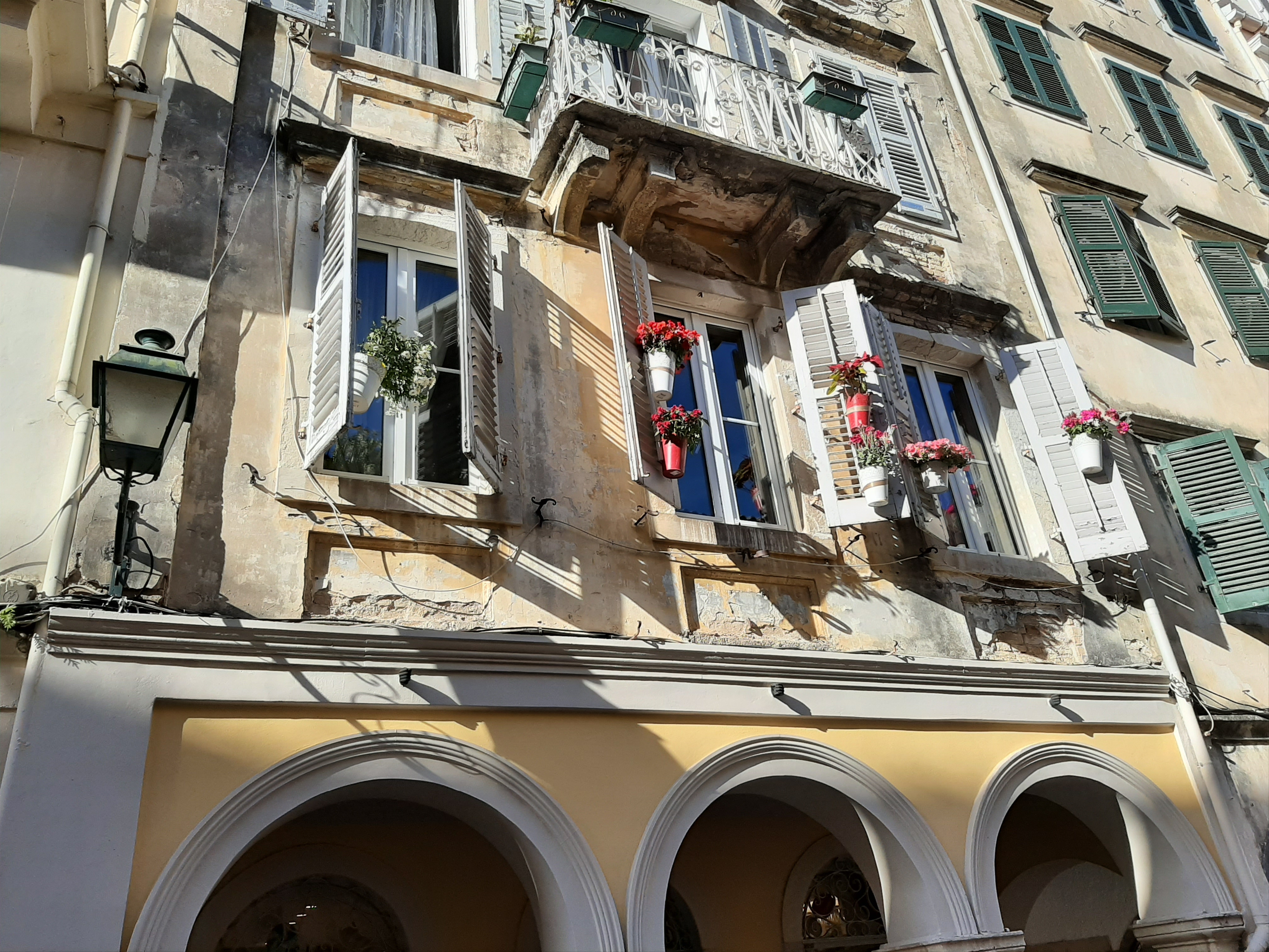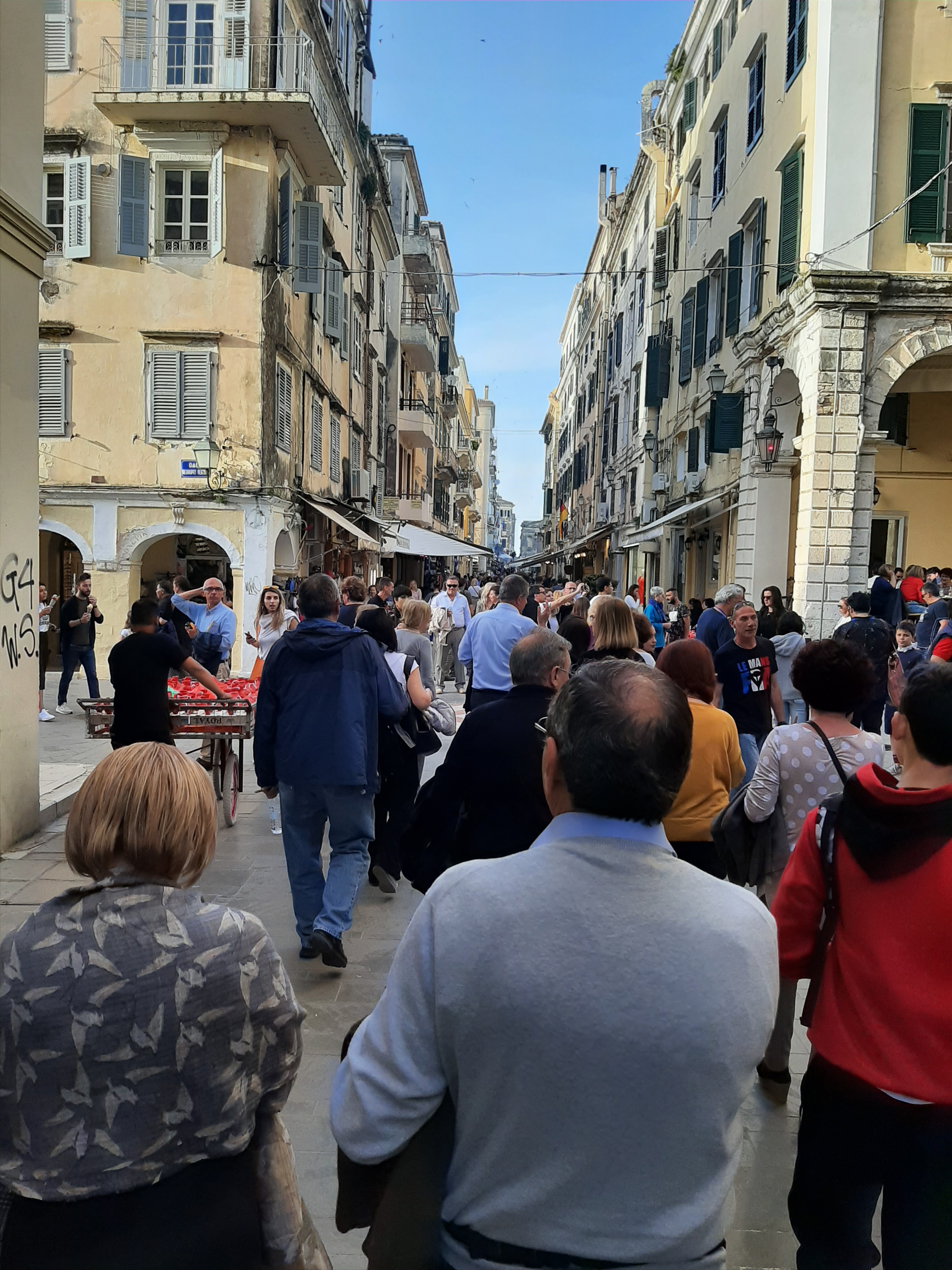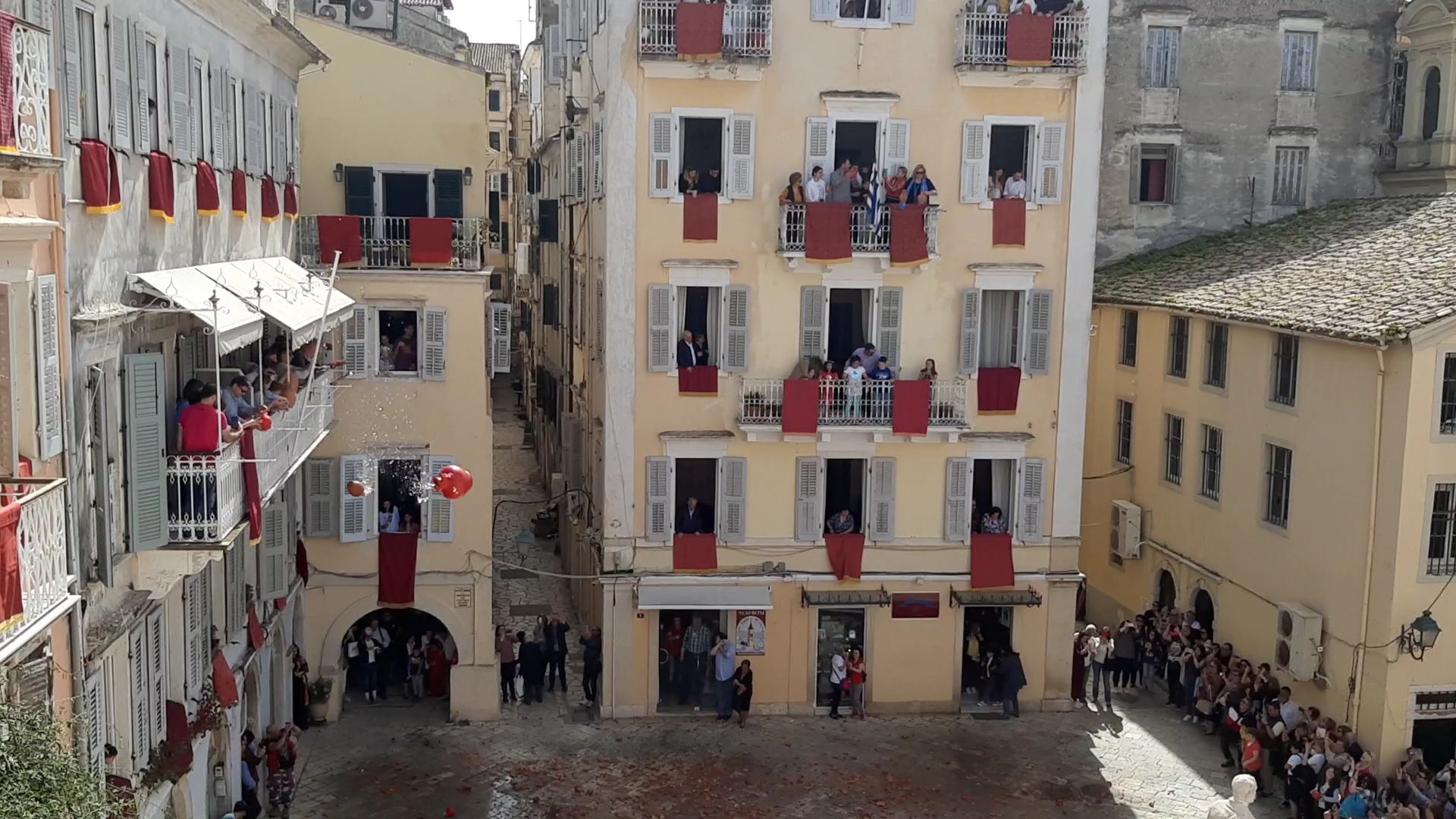 Το Μεγάλο Σάββατο μας επεφύλασσε και άλλες πολύ όμορφες εκδηλώσεις και βεβαίως περιλάμβανε το πιο γνωστό έθιμο του κερκυραϊκού Πάσχα με τη ρίψη των κανατιών. Επειδή όμως η πρώτη Ανάσταση και το ξεχωριστό θέαμα των κανατιών προσελκύει πιστούς από όλη την Ελλάδα με αποτέλεσμα να επικρατεί το… αδιαχώρητο, πολύ νωρίς το πρωί μετά το πρωινό μας επιβιβαστήκαμε στο λεωφορείο για να προλάβουμε να μπούμε στην πόλη πριν επικρατήσει το αδιαχώρητο, προκειμένου να φτάσουμε στο κτίριο της τράπεζας της καρδιάς μας που βρίσκεται στο επίκεντρο των εκδηλώσεων, από όπου θα τις παρακολουθούσαμε προσκεκλημένοι των Κερκυραίων συναδέλφων μας. Πράγματι, διασχίσαμε τη σημαιοστολισμένη προς τιμήν του Αγίου Σπυρίδωνα με τα πορφυρά επονομαζόμενα δαμάσκο (επειδή τα υφάσματα αυτά έρχονταν αρχικά από τη Δαμασκό) πόλη φτάνοντας στο κτίριο της Ιονικής και από τα παράθυρα και τα μπαλκόνια είχαμε την ευκαιρία να ζήσουμε, χωρίς να ταλαιπωρηθούμε, τόσο τη λιτανεία του Αγίου Σπυρίδωνα -το Μεγάλο Σάββατο είναι η μοναδική μέρα που περιφέρεται όρθιο το σκήνωμα του Αγίου συνοδεία των φιλαρμονικών – όσο και εν συνεχεία στις 11 π.μ. υπό τον ήχο των καμπανών του Αγίου Σπυρίδωνα -που είναι ακριβώς δίπλα στο πρώην κτίριο της Ιονικής- τη λεγόμενη πρώτη Ανάσταση που σηματοδοτεί και την εκκίνηση του πασίγνωστου εθίμου των μπότηδων, όπου οι ντόπιοι πετούν τις στάμνες από τα μπαλκόνια. Ο συνάδελφος Λαμάκιας μάλιστα είχε φροντίσει να προμηθευτεί στάμνες και έτσι συμμετείχαμε κι εμείς στο έθιμο! Αφού μαζέψαμε για γούρι και ενθύμιο ένα κομματάκι από τα… σπασμένα, περπατήσαμε στους χώρους του Μουσείου και εν συνεχεία κατεβήκαμε όλοι μαζί στους κατάμεστους δρόμους, όπου πλέον οι μπάντες παιάνιζαν χαρούμενη μουσική.