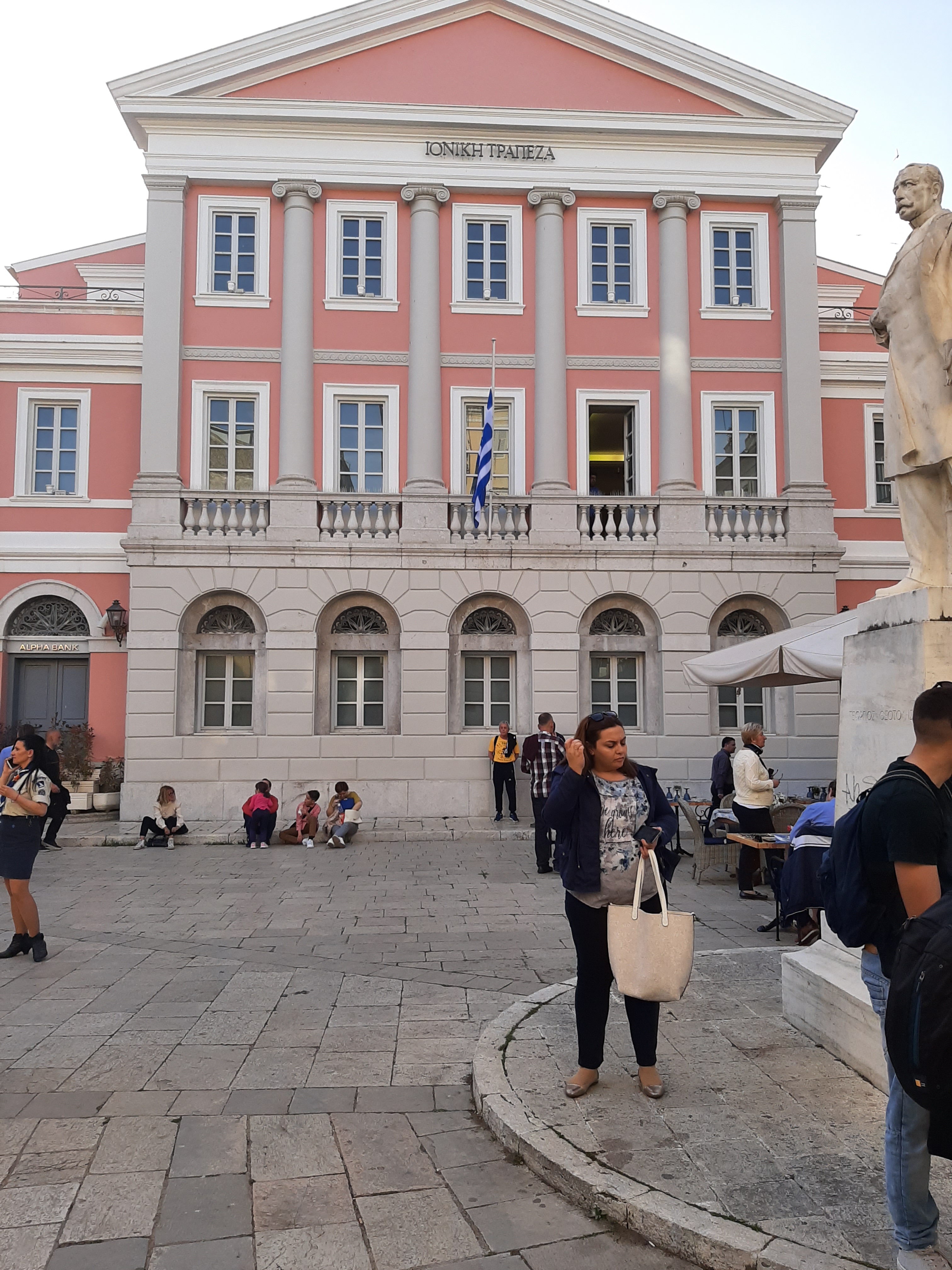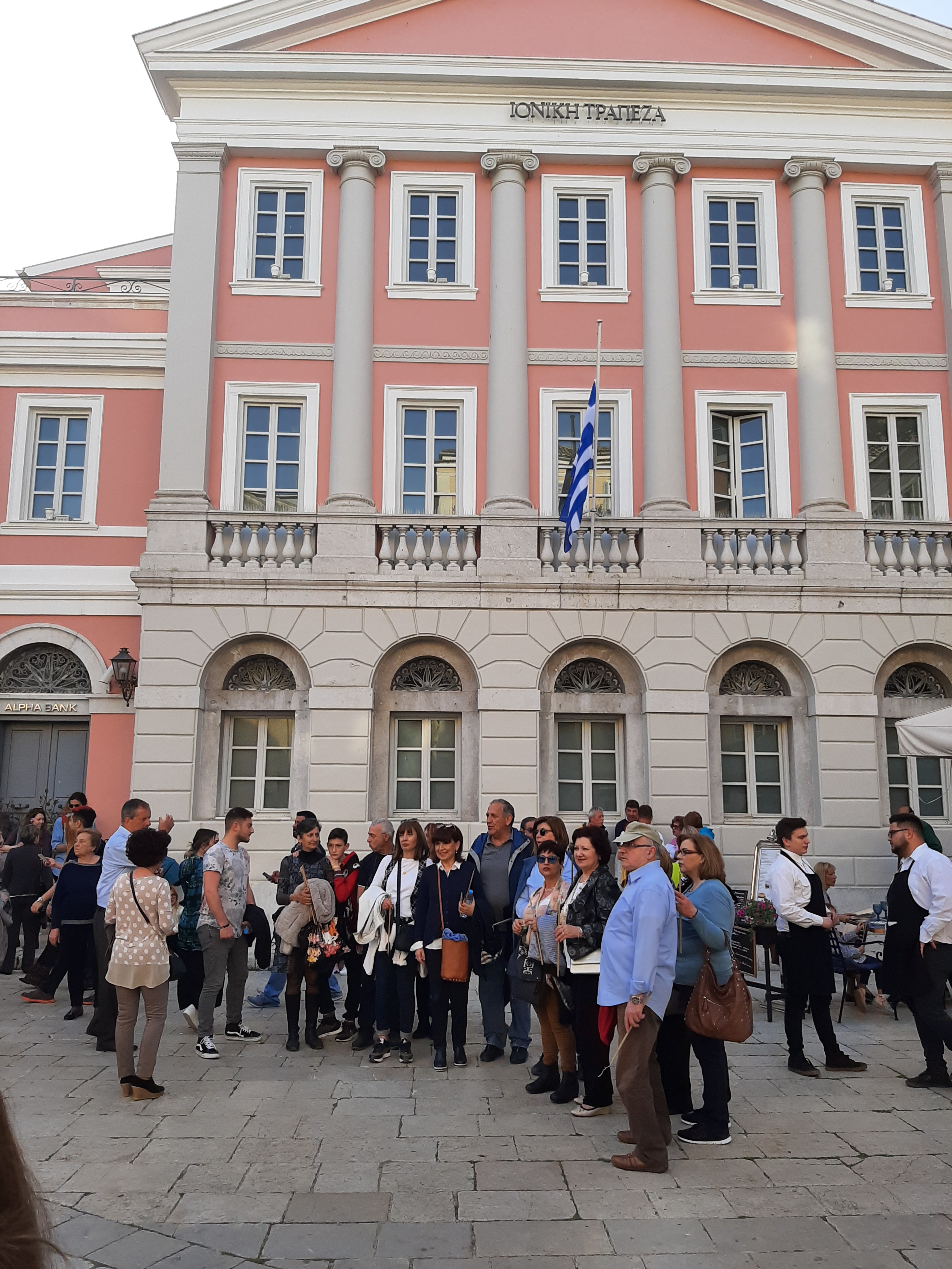 Οι συνάδελφοί μας Λαμάκιας και Καραμπίκας μας πληροφόρησαν για τη μεγαλύτερη πλατεία των Βαλκανίων, την ξακουστή Σπιανάδα, που αποτελεί πόλο έλξης τουριστών από όλο τον κόσμο, αλλά και παραδοσιακό τόπο συγκέντρωσης των Κερκυραίων. Κάναμε μία μικρή βόλτα που δε θα μπορούσε να μην περάσει από το σημείο που «μαγνήτιζε» το ενδιαφέρον μας ως Ιονικάριοι… Επισκεφθήκαμε στην καρδιά της πόλης το αρχαιότερο κτίριο της πρώτης ελληνικής τράπεζας, της δικιάς μας Ιονικής Τράπεζας, το οποίο είναι και το μοναδικό που φέρει σήμερα την επιγραφή της Ιονικής Τράπεζας και λειτουργεί πλέον ως Νομισματικό Μουσείο -καθότι η Ιονική ήταν η πρώτη ελληνική εκδοτική τράπεζα και μάλιστα διατήρησε το εκδοτικό προνόμιο επί σειρά ετών.