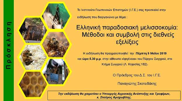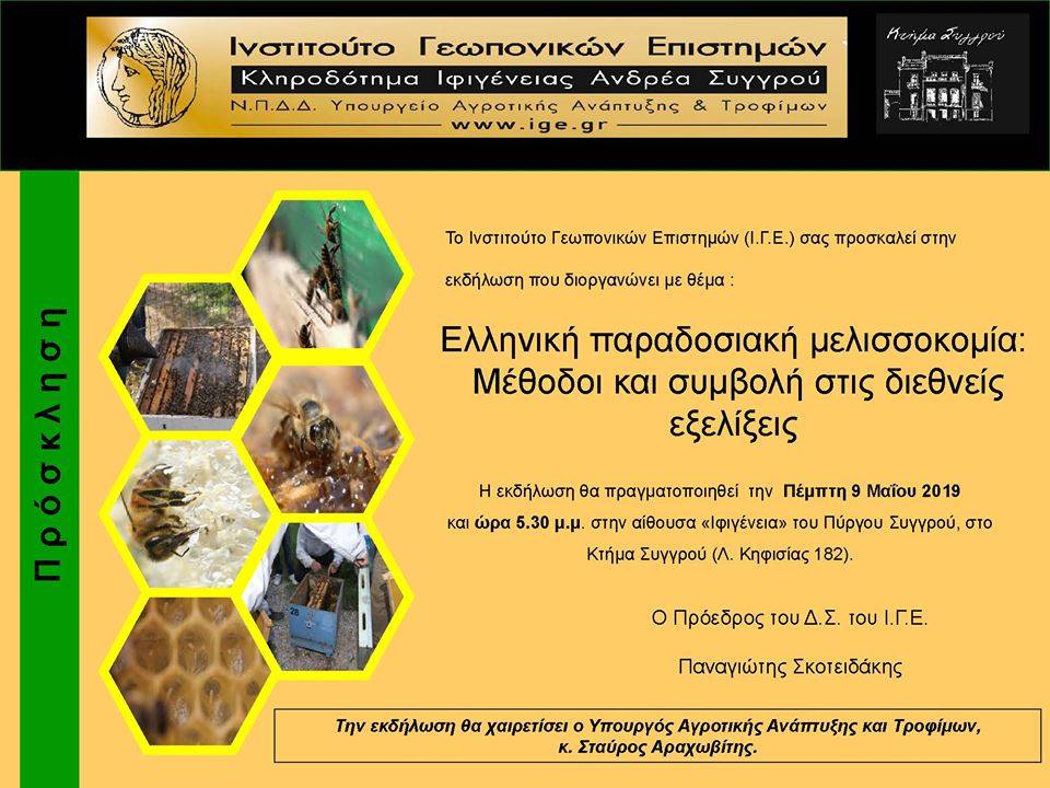 Αυτήν τη φορά η συναδέλφισσα και “Οι Φίλοι του Δάσους Συγγρού” σας προσκαλούν την Πέμπτη 9 Μαΐου στον Πύργο Συγγρού (ώρα 17;30 μ.μ. – 20:30 μ.μ.) στην εκδήλωση που διοργανώνει το Ινστιτούτο Γεωπονικών Επιστημών: «Ελληνική παραδοσιακή μελισσοκομία – μέθοδοι και συμβολή στις διεθνείς εξελίξεις».