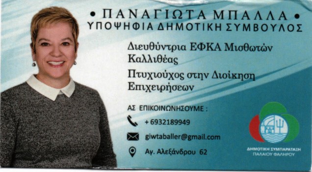Η σταδιοδρομία της Γιώτας είναι ένα ακλόνητο διαπιστευτήριο για τις ικανότητές της. Εμείς από… ίδια εμπειρία, λόγω της στήριξης που έχει παρέχει στο Σύλλογό μας όλα αυτά τα χρόνια, μπορούμε να σας βεβαιώσουμε ότι πάντα στέκεται στο πλευρό του πολίτη και αποτελεί τον ιδανικό άνθρωπο για να ασχοληθεί με τα κοινά του Δήμου Παλαιού Φαλήρου.