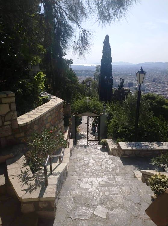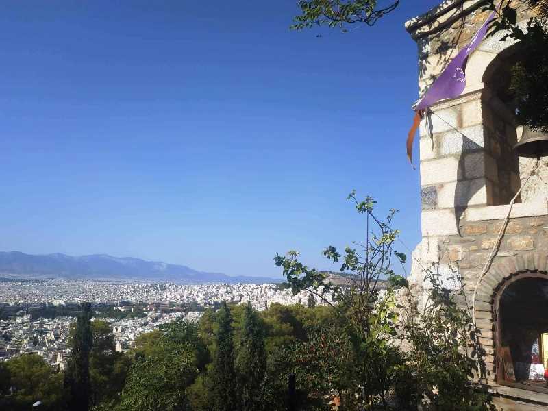 Στο τέλος της βάπτισης ακολούθησε στον προαύλιο χώρο δεξίωση με την εκπληκτική θέα που προσφέρει βέβαια ο Άγιος Ισίδωρος σε όλη την Αθήνα, όπου απολαύσαμε τα γευστικότατα εδέσματα που είχε επιμεληθεί η ίδια η οικογένεια Γεώργα, με τη συνοδεία στο τέλος των εξαίρετων σταφυλιών παραγωγής τους!