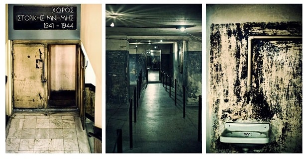 Τα υπόγεια προσφέρονταν ιδιαίτερα για τους κατακτητές, εφόσον είναι έξι μέτρα κάτω από την επιφάνεια του εδάφους και η απομόνωσή των κρατουμένων απόλυτη. Και οι δυο όροφοι των υπογείων έχουν σε όλες τις προσβάσεις βαριές συμπαγείς και αεροστεγείς σιδερένιες πόρτες, κατασκευασμένες από γερμανική εταιρεία προπολεμικά και τα παράθυρα που βλέπουν προς τους φωταγωγούς διαθέτουν διπλά συμπαγή σιδερένια παραθυρόφυλλα, καθώς προορίζονταν για αντιαεροπορικό καταφύγιο. Σε αρκετές πόρτες βλέπει ο επισκέπτης από τη μια μεριά, αυτή των φρουρών, αγκυλωτούς σταυρούς, και από την άλλη τα λόγια των κρατουμένων: «νερό», «χωρίς νερό», «θέλω νερό».