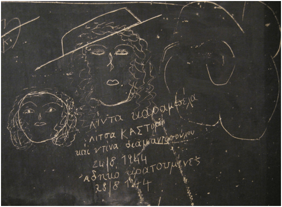 «Fiorin Sergio, Venezia», «Franzella, entrata (είσοδος) 29-7-44, uscita (έξοδος) κενό». Εκεί διαβάζουμε επίσης «τους Έλληνες τους έφαγε η βρετανική προπαγάνδα» και λίγο πιο κάτω, από άλλο χέρι, «Κοσμάς Ευαγγελλάτος, ετών 18, 21.7.44», χαραγμένες και αγκαλιασμένες η ελληνική και η αγγλική σημαία, το ακρώνυμο του ΚΚΕ και ένα τόξο τρυπάει μια καρδιά που στάζει αίμα.