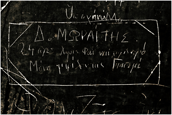 Ο Δ. Μωραΐτης έχει χαράξει «24 ώρες χωρίς φαΐ και νερό. Μόνο μυρίζοντας γιασεμί», παίρνοντας δύναμη από το άρωμα του γιασεμιού στο σπίτι του. Ο Λουδοβίκος Μαριόλας: «Ποινή Θανάτου». Ο Κώστας Χάλαρης: «Ένα πρωί κάθομαι μες στο περιβολάκι και έρχονται δυο ρουφιάνοι χωροφυλάκοι και με παραδίδουνε στους Γερμανούς», Λάμπρος Τζίτζας: «Από ελληνική ρουφιανιά». Γεώργιος Καρούσος: «Είσοδος 8/4/44. Κατηγορηθείς για λάστιχα και ποδήλατα του Άξονος. Συλληφθείς από τους τσολιάδες. Αχ Βαχ. Και κάνω Πάσχα στα σίδερα αυτά, στον υγρό αυτόν τάφο. Κάτοικος συνοικίας Μεταξουργείου, Δεληγιώργη 47. Αχ Βαχ». Και από κάποια ακιδογραφήματα, όπου τα ονόματα είναι δυσανάγνωστα: «Στη φυλακή με ρίξανε χωρίς καμιά αιτία και τρέμουν τα ποδάρια μου από την αγωνία», ενώ σε άλλο θάλαμο διαβάζουμε «Υπομονή. Και προ πάντως, μην αγωνιάτε».