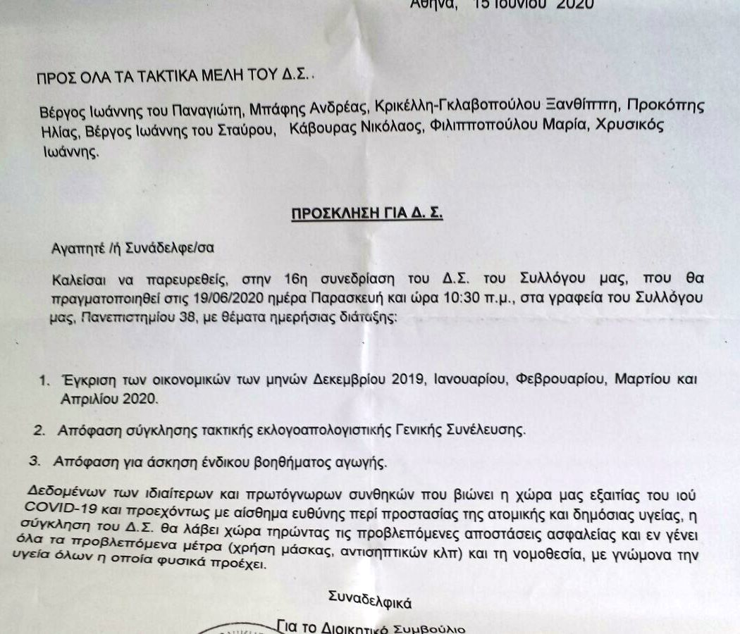 Εξ άλλου, με κρατική εντολή μέχρι τέλους Ιουνίου απαγορεύονται οι κάθε είδους εκδηλώσεις των Συλλόγων και οποιοσδήποτε επιθυμεί για οποιονδήποτε επείγοντα λόγο να διοργανώσει εκδηλώσεις, οφείλει προηγουμένως να λάβει σχετική άδεια από τον ΕΟΔΥ, όπως μας ενημέρωσαν οι αρμόδιες υπηρεσίες σε σχετική μας επικοινωνία, οι οποίες ήταν σαφείς ότι δεν είναι ακόμα σε θέση να γνωρίζουν τι θα ισχύει τον Ιούλιο. Όταν λοιπόν τα μέλη του Δ.Σ. της παράταξης «ΙΟΝΙΚΗ ΕΝΟΤΗΤΑ» τον ρώτησαν τι πρόσκληση θα αποστείλει που δε θα περιλαμβάνει χρόνο, τόπο και ημερήσια διάταξη, μας απάντησε ότι αν και εφόσον το επιτρέψουν οι συνθήκες, απλά θα την αναρτήσει στην ιστοσελίδα, αποκλείοντας βεβαίως με αυτόν τον τρόπο από την ενημέρωση ένα μεγάλο μέρος των συνταξιούχων συναδέλφων μας που δεν έχουν επαφή με τα σύγχρονα μέσα…