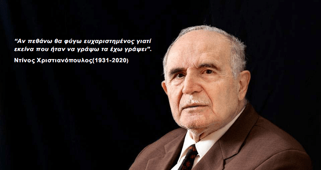 Ο Ντίνος Χριστιανόπουλος πέθανε χθες σε ηλικία 89 ετών στην αγαπημένη και γενέθλια πόλη του, τη Θεσσαλονίκη, την οποία ουδέποτε εγκατέλειψε, αφήνοντας μία ανεκτίμητη πνευματική κληρονομιά στη χώρα μας – που δυστυχώς από πατρίδα των ποιητών και των λογοτεχνών, τα τελευταία χρόνια υποφέρει από την πνευματική και πολιτιστική ένδεια…