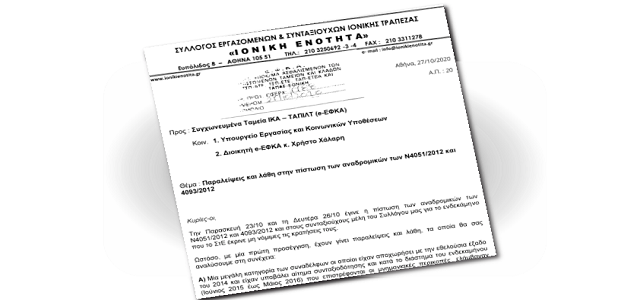 Μετά από επικοινωνία και συνεργασία με τους ασφαλιστικούς και νομικούς μας συμβούλους και καθώς βέβαια η ΙΟΝΙΚΗ ΕΝΟΤΗΤΑ δεν αφήνει ποτέ τίποτα στην τύχη, αποστείλαμε την κάτωθι εμπεριστατωμένη επιστολή προς τους αρμόδιους φορείς (ΤΑΠΙΛΤ, ΕΦΚΑ, Υπουργείο Εργασίας και Κοινωνικών Υποθέσεων), στην οποία επισημαίνουμε όλα τα λάθη και τις παραλείψεις και ζητάμε την άμεση διόρθωσή τους: