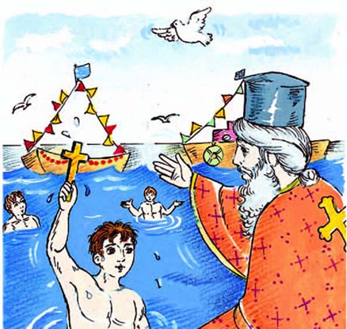 Τελικά ο ρασοφόρος, αφού βεβαιώθηκε για την πίστη των παιδιών στην Εκκλησία, ψάλλοντας ο ίδιος το γνωστό Απολυτίκιο της ημέρας, έριξε τον Σταυρό στο ποτάμι. Και για να μην υπάρξει συνωστισμός στην ανάδυση, αλλά και για να μη χαθεί στον βυθό, μια και δεν τον έδεσε με κορδέλα, φρόντισε να τον ρίξει κάπου στην άκρη και σε μέρος που να φαίνεται και το νερό δεν έτρεχε βαθύ.