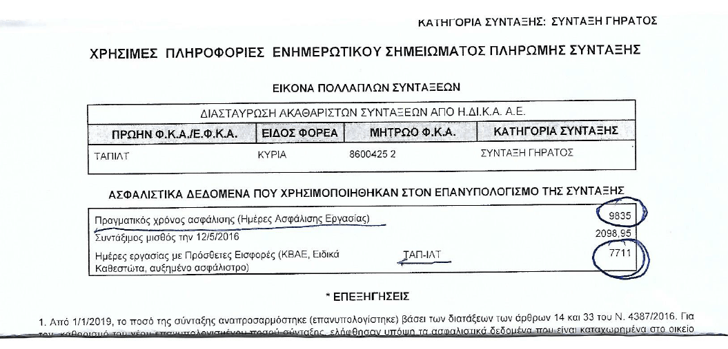 Επειδή όμως έχουν υποπέσει στην αντίληψή μας περιπτώσεις όπου έχουν γίνει λάθη από τις μηχανογραφικές υπηρεσίες, κυρίως στα ποσοστά αναπλήρωσης, προτρέπουμε όλους τους παλαιούς συνταξιούχους να εξετάσουν ένα οποιοδήποτε ενημερωτικό τους σημείωμα μετά τον Ιούνιο του 2021 και να παρατηρήσουν στη δεύτερη σελίδα αν ο πραγματικός χρόνος ασφάλισης που αποτυπώνεται, δηλαδή οι μέρες ασφάλισής τους, είναι ο σωστός. Όπως υποδεικνύεται στη φωτογραφία στο τέλος του παρόντος, θα πρέπει να αναφέρεται το σύνολο του εργασιακού σας βίου, βάσει του οποίου συνταξιοδοτηθήκατε. Από κάτω, όπου αναφέρονται οι μέρες εργασίας με πρόσθετες εισφορές για το ΤΑΠΙΛΤ, θα πρέπει να αναφέρεται ο χρόνος που έχετε διανύσει στην τράπεζα.