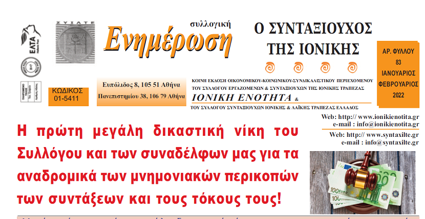 Ειδήσεις, Ειδήσεις ΣΥΙΛΤΕ, Ενημέρωση, ΣΥΙΛΤΕΔιαβάστε το νέο τεύχος της εφημερίδας μας ! Σαράντος Φιλιππόπουλος22 Μαρτίου, 2022 2:32 Συνάδελφοι, κυκλοφόρησε το νέο τεύχος της κοινής εφημερίδας της ΙΟΝΙΚΗΣ ΕΝΟΤΗΤΑΣ και του Συλλόγου Συνταξιούχων. Φύλλο 83 (πατήστε εδώ) . 29/3 & 30/3 οι ημερομηνίες καταβολής της κύριας σύνταξής μας Σε εξέλιξη η διαδικασία υλοποίησης του Ύμνου της Ιονικής σε στίχους της Σοφίας Μαρωνίδη και μελοποίηση του σπουδαίου συνθέτη Σπύρου Μαυρόπουλου!