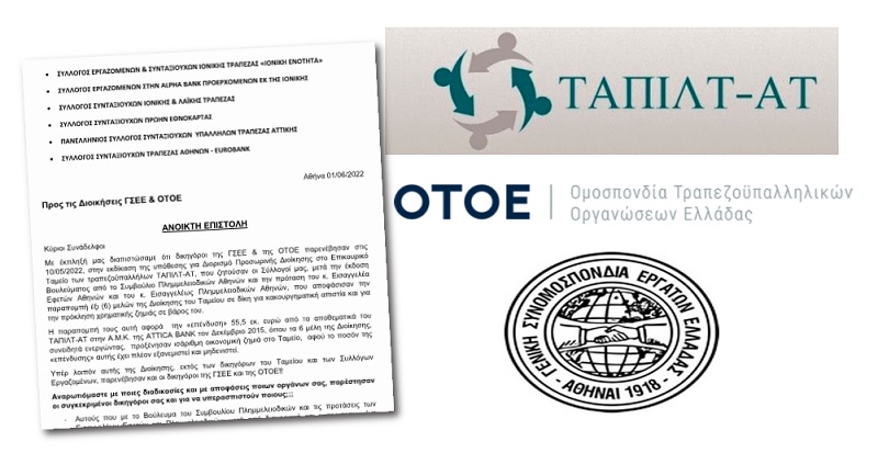 Με έκπληξή μας διαπιστώσαμε ότι δικηγόροι της ΓΣΕΕ & της ΟΤΟΕ παρενέβησαν στις 10/05/2022, στην εκδίκαση της υπόθεσης για Διορισμό Προσωρινής Διοίκησης στο Επικουρικό Ταμείο των τραπεζοϋπαλλήλων ΤΑΠΙΛΤ-ΑΤ, που ζητούσαν οι Σύλλογοί μας, μετά την έκδοση Βουλεύματος από το Συμβούλιο Πλημμελειοδικών Αθηνών και την πρόταση του κ. Εισαγγελέα Εφετών Αθηνών και του κ. Εισαγγελέως Πλημμελειοδικών Αθηνών, που αποφάσισαν την παραπομπή έξι (6) μελών της Διοίκησης του Ταμείου σε δίκη για κακουργηματική απιστία και για την πρόκληση χρηματικής ζημιάς σε βάρος του.