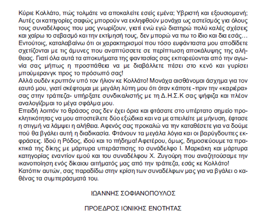 Ύβρις: Ο εν λόγω κύριος, λοιπόν, θέλησε να πετάξει λάσπη στο σύλλογό μας. Ή έτσι τουλάχιστον ήλπιζε. Πίστευε ότι αποστέλλοντας εξώδικα σε συναδέλφους που καταγγέλλουν την πρακτική και λειτουργία του στα χρόνια υπηρεσίας του στην τράπεζα, θα τους τρομοκρατούσε ώστε να κρατήσουν το στόμα τους κλειστό για την πασίγνωστη αντισυναδελφική του δραστηριότητα. Συγκεκριμένα, δημοσιοποίησε μία επιστολή του συναδέλφου Χρήστου Ζυγούρη, την οποία ο κος Κολλάτος είχε αποσπάσει τεχνηέντως ύστερα από αποστολή εξωδίκου για τη συμμετοχή του στην εκδίκαση υπόθεσης βλαπτικής μεταβολής που είχαν καταθέσει οι συνάδελφοι Γιάννης Σοφιανόπουλος και Χρήστος Ζυγούρης, διεκδικώντας την καταβολή ανθυγιεινού επιδόματος και ίση μεταχείριση με τους οδηγούς της Πίστεως με τους οποίους συνυπηρετούσαν την ίδια περίοδο στο τρίτο υπόγειο του κεντρικού καταστήματος.