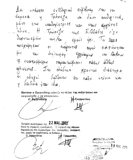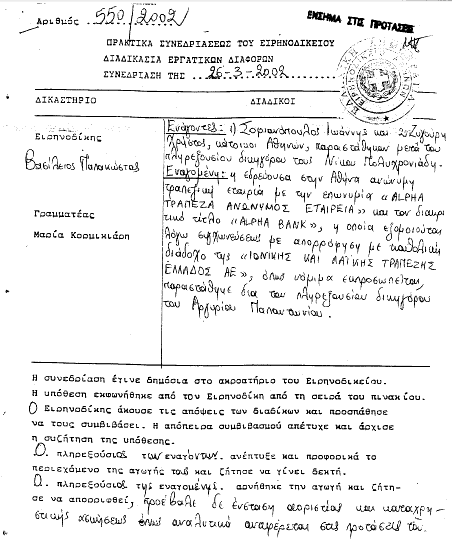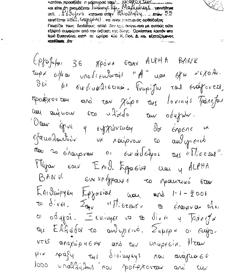 Άτη: Στο φύλλο νο 45 της εφημερίδας μας, είχαμε δημοσιεύσει την ένορκη κατάθεση του κου Κολλάτου υπέρ της τράπεζας και σε βάρος των συναδέλφων. Η απάντηση του υβριστή ήταν να μας κατηγορήσει για συκοφαντία. Η θρασύτητά του δεν έχει όρια! Αντί να… λουφάξει ώστε να σταματήσει να προκαλεί τους συναδέλφους στους οποίους εναντιώθηκε για να υποστηρίξει την τράπεζα, προσπάθησε να περάσει και στην αντεπίθεση! Δεν τα κατάφερε, βέβαια, γιατί δεν μπορούσε ποτέ να διανοηθεί ότι τα γραπτά μένουν και είναι στη διάθεσή μας! Ιδού, λοιπόν, τα πειστήρια που μπορεί να ερευνήσει κάθε συνάδελφος. Στα επίσημα πρακτικά που ακολουθούν περιγράφεται η συγκεκριμένη δικαστική διαδικασία με όλους τους πρωταγωνιστές της: