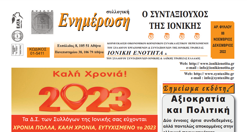 Ειδήσεις, Ειδήσεις ΣΥΙΛΤΕ, Ενημέρωση, ΣΥΙΛΤΕΔιαβάστε το νέο τεύχος της εφημερίδας μας ! Σαράντος Φιλιππόπουλος19 Ιανουαρίου, 2023 12:02 Συνάδελφοι, κυκλοφόρησε το νέο τεύχος της κοινής εφημερίδας της ΙΟΝΙΚΗΣ ΕΝΟΤΗΤΑΣ και του Συλλόγου Συνταξιούχων. Φύλλο 88 (πατήστε εδώ) Η ιστορική εξέλιξη της πρώτης εκδοτικής ελληνικής Τράπεζας από το 1839 έως το 2000 27/01 & 30/01 οι ημερομηνίες καταβολής της κύριας σύνταξής μας