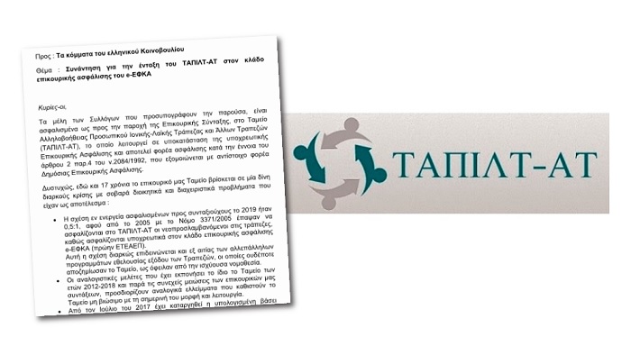 Το επόμενο διάστημα θα ξεκινήσει η δίκη των μελών της διοίκησης του ΤΑΠΙΛΤ-ΑΤ που αποφάσισαν την καταστροφική επένδυση των 55,5 εκατ. ευρώ και κατηγορούνται πλέον για κακουργηματική απιστία. Εν όψει αυτής της μείζονος εξέλιξης και καθώς οι κατηγορούμενοι συνεχίζουν να κινούν τα νήματα στο επικουρικό μας Ταμείο, κρατώντας δέσμιους χιλιάδες ασφαλισμένους, οι Σύλλογοι που αγωνιζόμαστε για την απόδοση ευθυνών για το ναυάγιο του ΤΑΠΙΛΤ-ΑΤ και βεβαίως για τη διάσωση της επικουρικής μας σύνταξης με την ένταξή του στον κλάδο επικουρικής ασφάλισης του e-ΕΦΚΑ (όπως ακριβώς έγινε και με την ένταξη των αντίστοιχων επικουρικών Ταμείων των τραπεζών Γενικής και Εθνικής) αποστείλαμε αίτημα συνάντησης στους αρμόδιους ασφαλιστικού κάθε κόμματος της Βουλής: