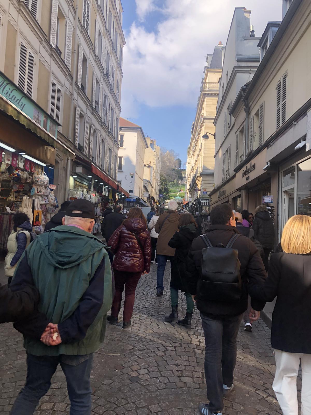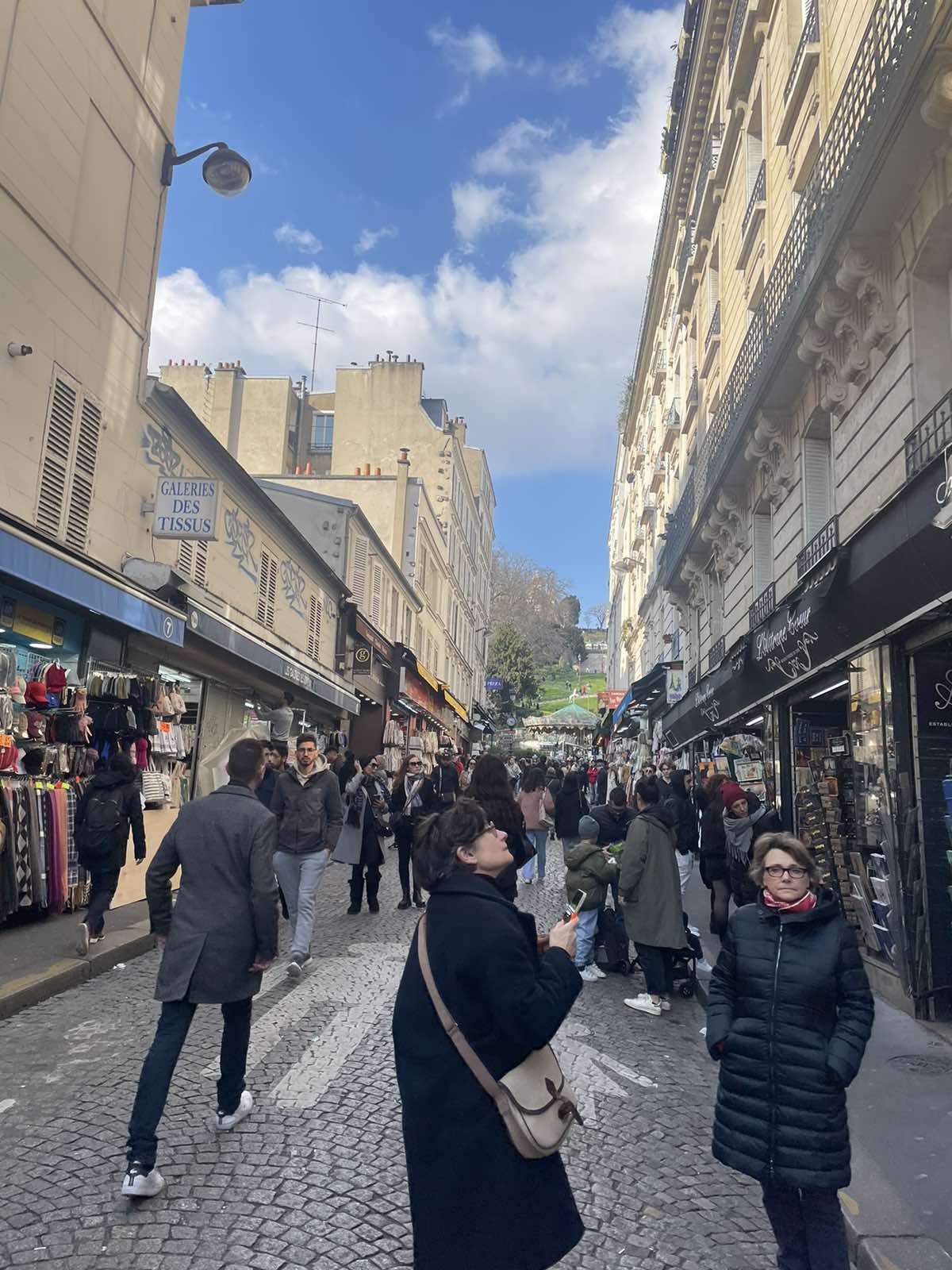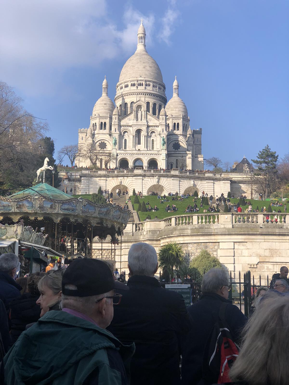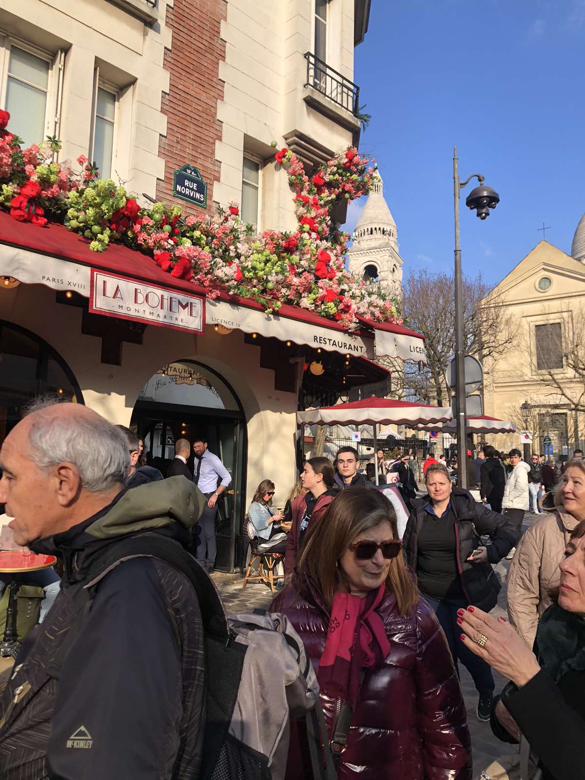 Είχε φτάσει όμως πια μεσημέρι και με το πούλμαν μας ξεκινήσαμε για την πλέον φημισμένη συνοικία του Παρισιού, τη γραφική Μονμάρτρη, η οποία ουσιαστικά απλώνεται στον ομώνυμο λόφο. Πήραμε το τελεφερίκ και αρχικά είδαμε την υπέροχη βασιλική της Σακρέ Κερ (της Ιερής Καρδιάς). Από το λόφο ψηλά αγναντέψαμε τη μοναδική θέα του Παρισιού και του Σηκουάνα. Αφού επισκεφθήκαμε την εκκλησία που αποτελεί η ίδια ένα έργο τέχνης με υπέροχες τοιχογραφίες, βιτρό κ.λπ., ξεκινήσαμε την περιήγησή μας στη συνοικία. Είναι μία πολύβουη γειτονιά, με «καλλιτεχνικό αέρα». Στην κεντρική πλατεία διάφοροι καλλιτέχνες εξέθεταν τα έργα τους, ενώ αρκετοί ζωγράφοι ήταν επί τω έργω. Πολύ όμορφα καφέ και μαγαζιά και βεβαίως… ξεχυθήκαμε όλοι να εφοδιαστούμε σουβενίρ για εμάς και τους αγαπημένους μας.
