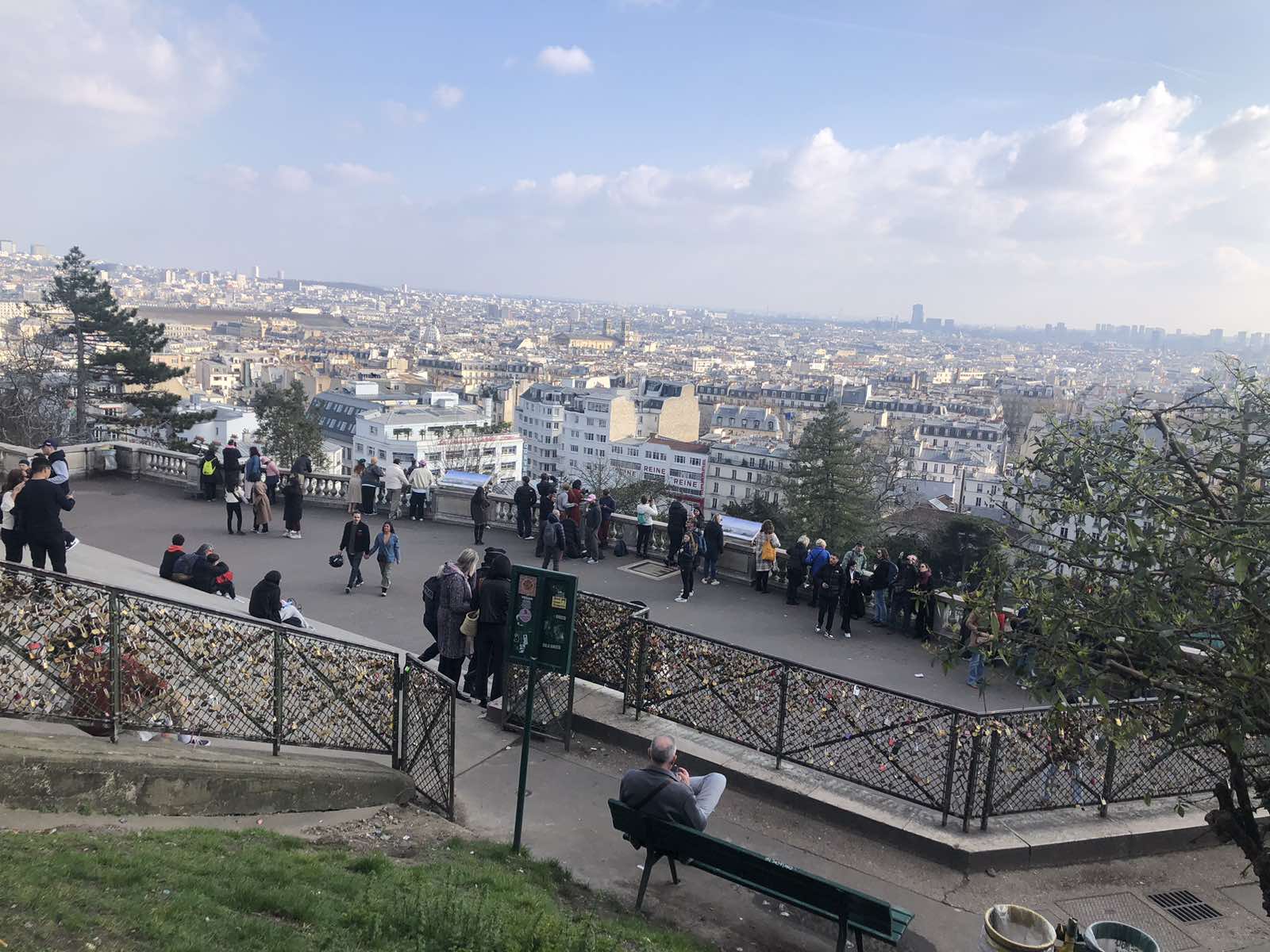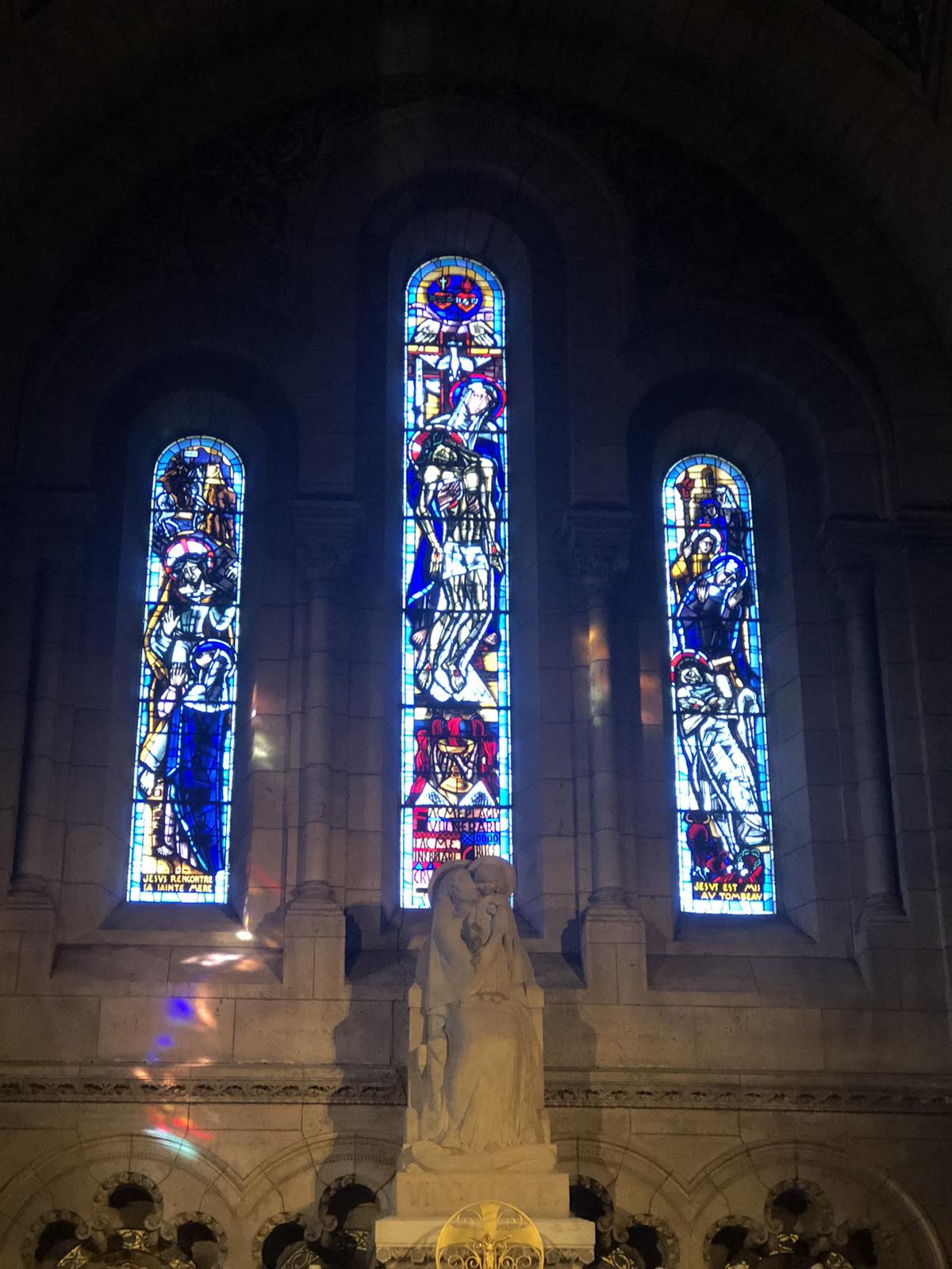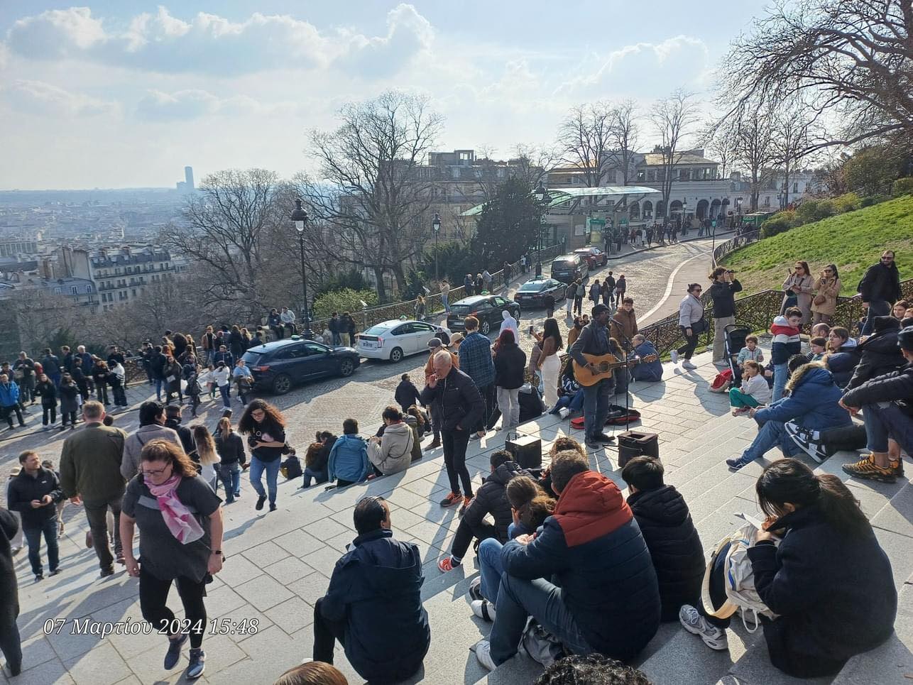 Είχε φτάσει όμως πια μεσημέρι και με το πούλμαν μας ξεκινήσαμε για την πλέον φημισμένη συνοικία του Παρισιού, τη γραφική Μονμάρτρη, η οποία ουσιαστικά απλώνεται στον ομώνυμο λόφο. Πήραμε το τελεφερίκ και αρχικά είδαμε την υπέροχη βασιλική της Σακρέ Κερ (της Ιερής Καρδιάς). Από το λόφο ψηλά αγναντέψαμε τη μοναδική θέα του Παρισιού και του Σηκουάνα. Αφού επισκεφθήκαμε την εκκλησία που αποτελεί η ίδια ένα έργο τέχνης με υπέροχες τοιχογραφίες, βιτρό κ.λπ., ξεκινήσαμε την περιήγησή μας στη συνοικία. Είναι μία πολύβουη γειτονιά, με «καλλιτεχνικό αέρα». Στην κεντρική πλατεία διάφοροι καλλιτέχνες εξέθεταν τα έργα τους, ενώ αρκετοί ζωγράφοι ήταν επί τω έργω. Πολύ όμορφα καφέ και μαγαζιά και βεβαίως… ξεχυθήκαμε όλοι να εφοδιαστούμε σουβενίρ για εμάς και τους αγαπημένους μας.