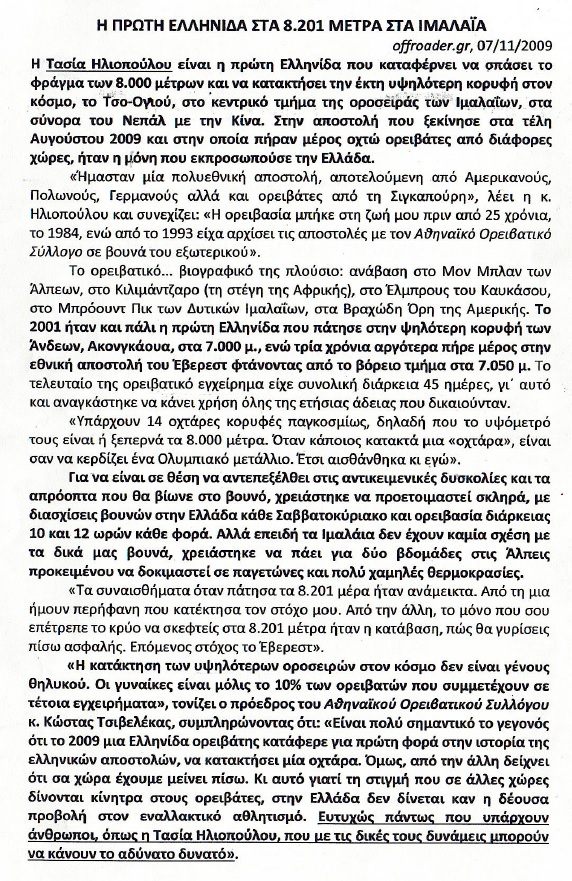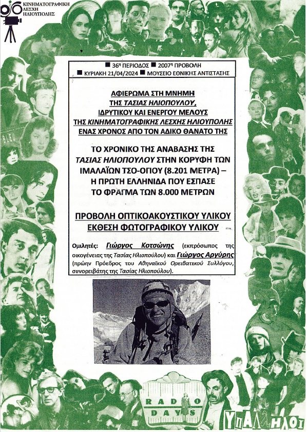Σας ενημερώσαμε ότι την Κυριακή 21 Απριλίου 2024, στο Μουσείο Εθνικής Αντίστασης στην Ηλιούπολη η κινηματογραφική λέσχη Ηλιούπολης οργάνωσε εκδήλωση αφιερωμένη στην αείμνηστη συναδέλφισσά μας Τασία Ηλιοπούλου και το χρονικό της ανάβασής της στην κορυφή των Ιμαλαΐων Τσο Ογιού στα 8.201 μέτρα (η πρώτη Ελληνίδα που έσπασε το φράγμα των 8.000 μέτρων!).