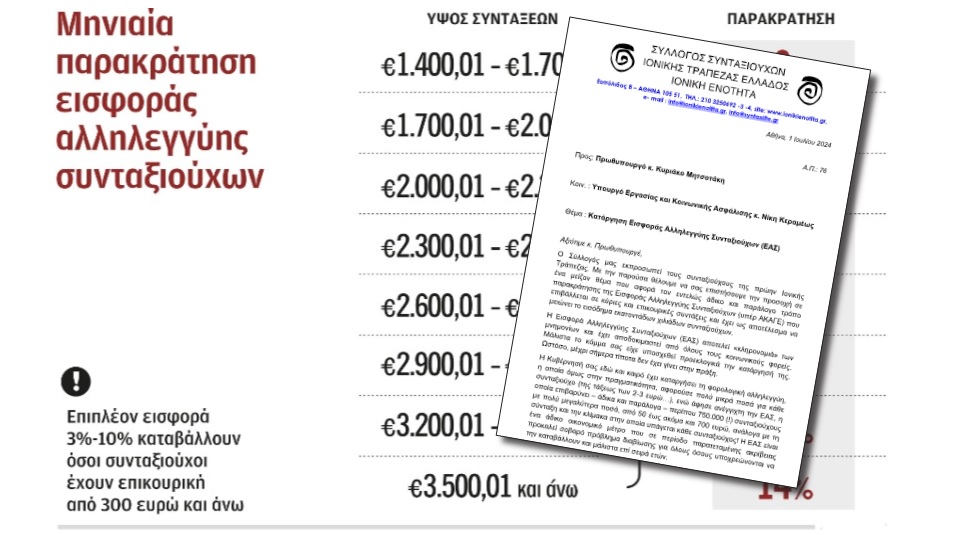 Επιπλέον, θέλουμε να σας τονίσουμε ότι ο Σύλλογός μας βρίσκεται σε άμεση συνεργασία με το νομικό μας σύμβουλο δρ. Απόστολο Παπακωνσταντίνου, με τον οποίο εξετάζουμε όλες τις πτυχές της υπόθεσης αυτής και τη δυνατότητα να προχωρήσουμε σε ομαδικές αγωγές για την κατάργηση της ΕΑΣ. Η μέχρι τώρα συζήτηση βρίσκεται σε πολύ καλό επίπεδο και αισιοδοξούμε ότι το φθινόπωρο θα έχει ολοκληρωθεί το σκεπτικό της αγωγής και τόσο όλοι οι συνάδελφοι συνταξιούχοι της Ιονικής μέλη του Συλλόγου μας, όσο και συνταξιούχοι συνάδελφοι από άλλους τραπεζικούς χώρους (μέσω της παράταξης Συνδικαλιστική Ενότητα ΟΣΤΟΕ), θα έχουμε τη δυνατότητα να συμμετάσχουμε σε ομαδικές αγωγές για το θέμα αυτό.
