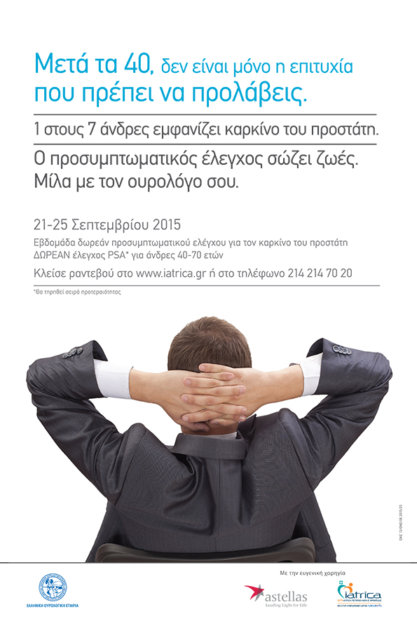 Παράλληλα, το ίδιο διάστημα (21-25 Σεπτεμβρίου) μπορείτε να κάνετε δωρεάν προσυμπτωματικό έλεγχο για τον καρκίνο του προστάτη, κλείνοντας ραντεβού στην ιστοσελίδα www.iatrica.gr ή στο τηλέφωνο 214 214 70 20: