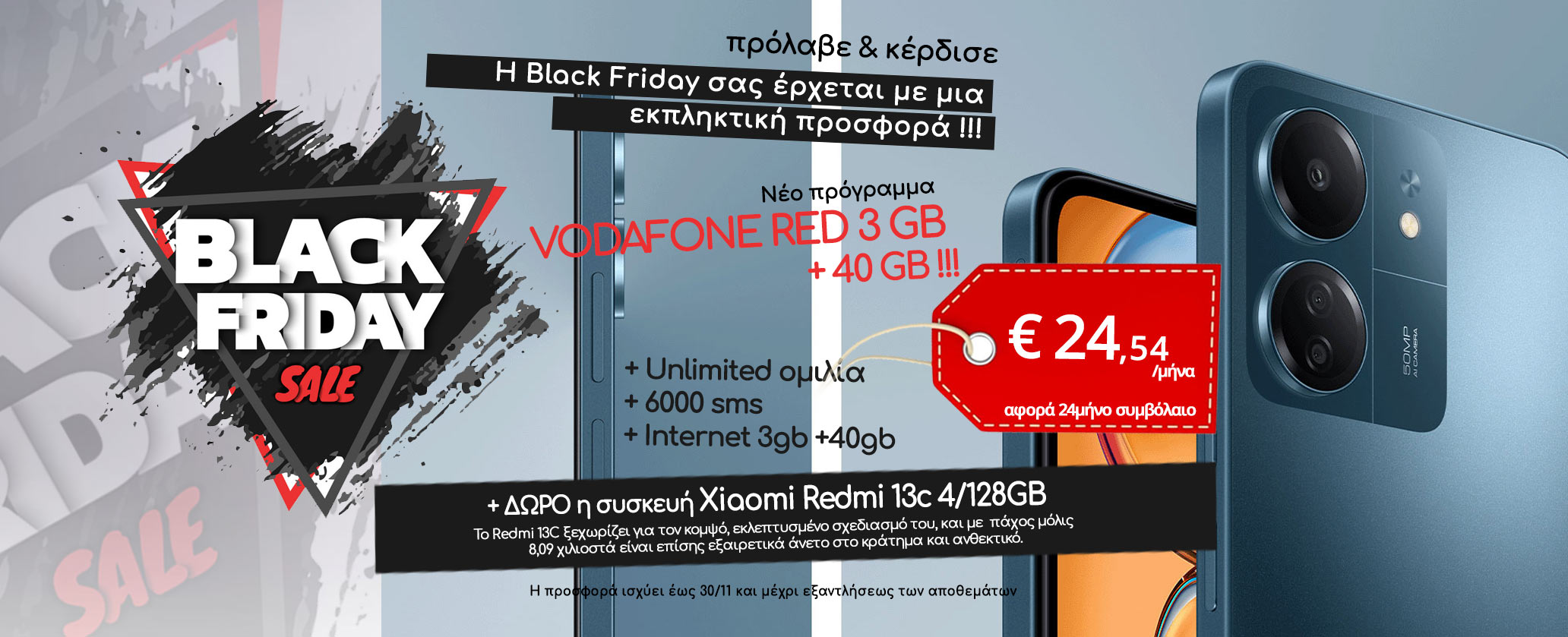 Με τη μοναδική αυτή προσφορά που ισχύει μέχρι 30 Νοεμβρίου 2024 (και εξαντλήσεως των αποθεμάτων), το νέο πρόγραμμα Vodafone Red σας παρέχει Απεριόριστη Ομιλία & 6.000 sms & Internet 3Gb + 40 Gb και επιπλέον ΔΩΡΕΑΝ τη συσκευή Xiaomi Redmi 13c 4/128 GB!