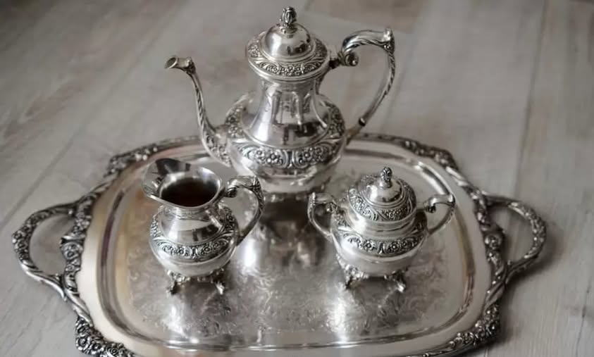Έλαμψε ο τόπος,- τόχε αποβραδίς γυαλίσει η Μέλπω με σόδα,αλάτι,νερό και πράσινο σαπούνι- απ’ αριστουργηματικό τούτο το σερβίτσιο ( μεγάλος ασημένιος δίσκος,τσαγιέρα, γαλατιέρα και ζαχαριέρα) με παχύ καθαρό ασήμι, πανέμορφα αραβουργήματα στο δίσκο, χρυσές ανάγλυφες παραστάσεις στα σκεύη με την Αγιά Σοφιά, το Τόπ-καπί, την γέφυρα του Βοσπόρου και ζωγραφιστά ζωντανά λουλούδια στα χερούλια.