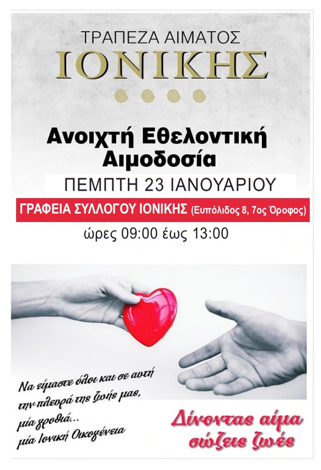 - Αύριο, Πέμπτη 23 Ιανουαρίου 2025, ώρες 09:00 – 13:00 πραγματοποιείται Εθελοντική Αιμοδοσία στα γραφεία του Συλλόγου μας (Ευπόλιδος 8, 7ος όροφος, πλατεία Κοτζιά) για την ενίσχυση της Τράπεζας Αίματος της Ιονικής που καλύπτει τις ανάγκες αίματος των συναδέλφων, των οικογενειών τους και των αιμοδοτών μας.