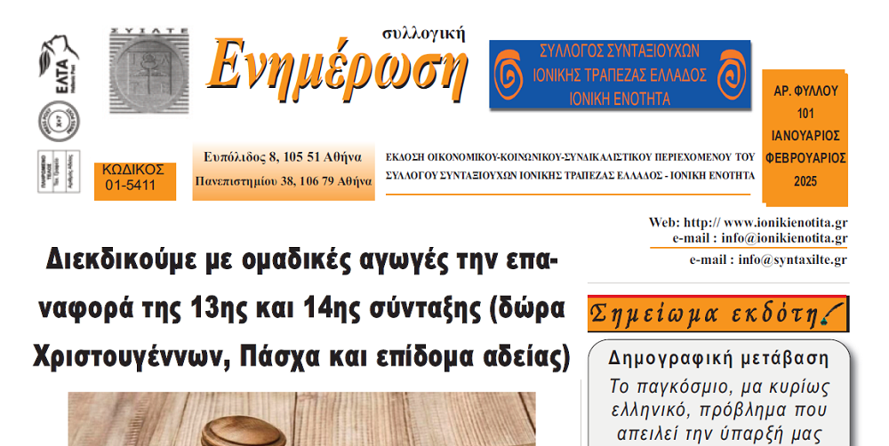 Ειδήσεις, Ειδήσεις ΣΥΙΛΤΕ, Ενημέρωση, Εφημερίδα, ΣΥΙΛΤΕΔιαβάστε το νέο τεύχος της εφημερίδας μας ! Σαράντος Φιλιππόπουλος28 Απριλίου, 2025 10:2525 Ιουνίου, 2025 11:08 Συνάδελφοι, κυκλοφόρησε το νέο τεύχος της εφημερίδας του Συλλόγου Συνταξιούχων Ιονικής Τράπεζας Ελλάδος ΙΟΝΙΚΗ ΕΝΟΤΗΤΑ. Φύλλο 101 (πατήστε εδώ) «Αν μπορούσα» – Ο αειθαλής συνάδελφος Γιώργος Στρούζας σε ρομαντική διάθεση! ΟΛΟΙ ΣΤΗΝ ΑΥΡΙΑΝΗ (Τετάρτη 30.04.25 – ώρα 16:00 μ.μ., Αίθουσα Πανηπειρωτικής Ομοσπονδίας Ελλάδος, οδός Κλεισθένους 15, 7ος όροφος) ΓΕΝΙΚΗ ΣΥΝΕΛΕΥΣΗ ΓΙΑ ΤΟ ΠΑΡΟΝ ΚΑΙ ΤΟ ΜΕΛΛΟΝ ΤΟΥ ΣΥΛΛΟΓΟΥ ΜΑΣ!