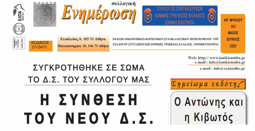 Ειδήσεις, Ειδήσεις ΣΥΙΛΤΕ, Ενημέρωση, Εφημερίδα, ΣΥΙΛΤΕΔιαβάστε το νέο τεύχος της εφημερίδας μας ! Σαράντος Φιλιππόπουλος1 Αυγούστου, 2025 10:05 Συνάδελφοι, κυκλοφόρησε το νέο τεύχος της εφημερίδας του Συλλόγου Συνταξιούχων Ιονικής Τράπεζας Ελλάδος ΙΟΝΙΚΗ ΕΝΟΤΗΤΑ. Φύλλο 103 (πατήστε εδώ) Καλό ταξίδι Γιάννη Το χιλιάρικο τ’αλατιού – Του κ. Στάμου Γαλούνη