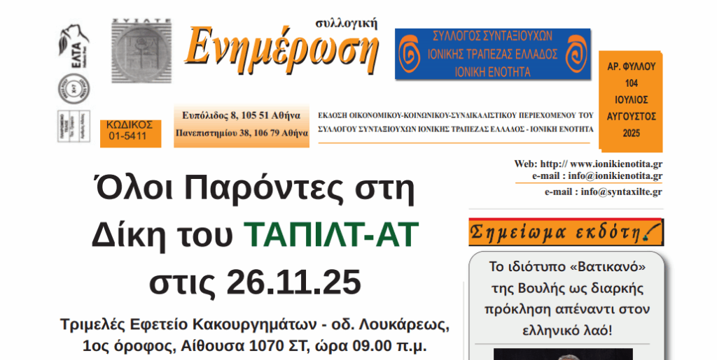Ειδήσεις, Ειδήσεις ΣΥΙΛΤΕ, Ενημέρωση, Εφημερίδα, ΣΥΙΛΤΕΔιαβάστε το νέο τεύχος της εφημερίδας μας ! Σαράντος Φιλιππόπουλος29 Οκτωβρίου, 2025 9:12 Συνάδελφοι, κυκλοφόρησε το νέο τεύχος της εφημερίδας του Συλλόγου Συνταξιούχων Ιονικής Τράπεζας Ελλάδος ΙΟΝΙΚΗ ΕΝΟΤΗΤΑ. Φύλλο 104 (πατήστε εδώ) 10 (πραγματικά καλές) ελληνικές ταινίες για την 28η Οκτωβρίου, την Κατοχή και την Αντίσταση