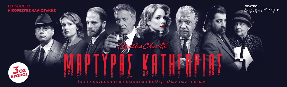 Ο «Μάρτυρας Κατηγορίας» συνεχίζει την εντυπωσιακή του πορεία και στη χώρα μας, με τον Γιάννη Βούρο στον ρόλο του Σερ Ουίλφριντ Ρόμπαρτς, τον Κώστα Κόκλα ως τον δικηγόρο Τζον Μέηχιου, την Ευγενία Δημητροπούλου ως την αινιγματική σύζυγο Ρομέιν και τον Όμηρο Πουλάκη στον ρόλο του κατηγορούμενου Λέοναρντ Βόουλ, πλαισιωμένους από τους Μελίνα Βαμβακά, Γιάννη Δρακόπουλο, Δημήτρη Καραμπέτση, Βαρβάρα Μακράκη και Νίκη Παλληκαράκη, σε μια παράσταση γεμάτη ένταση και ανατροπές που καθηλώνει μέχρι το αποκαλυπτικό της φινάλε.